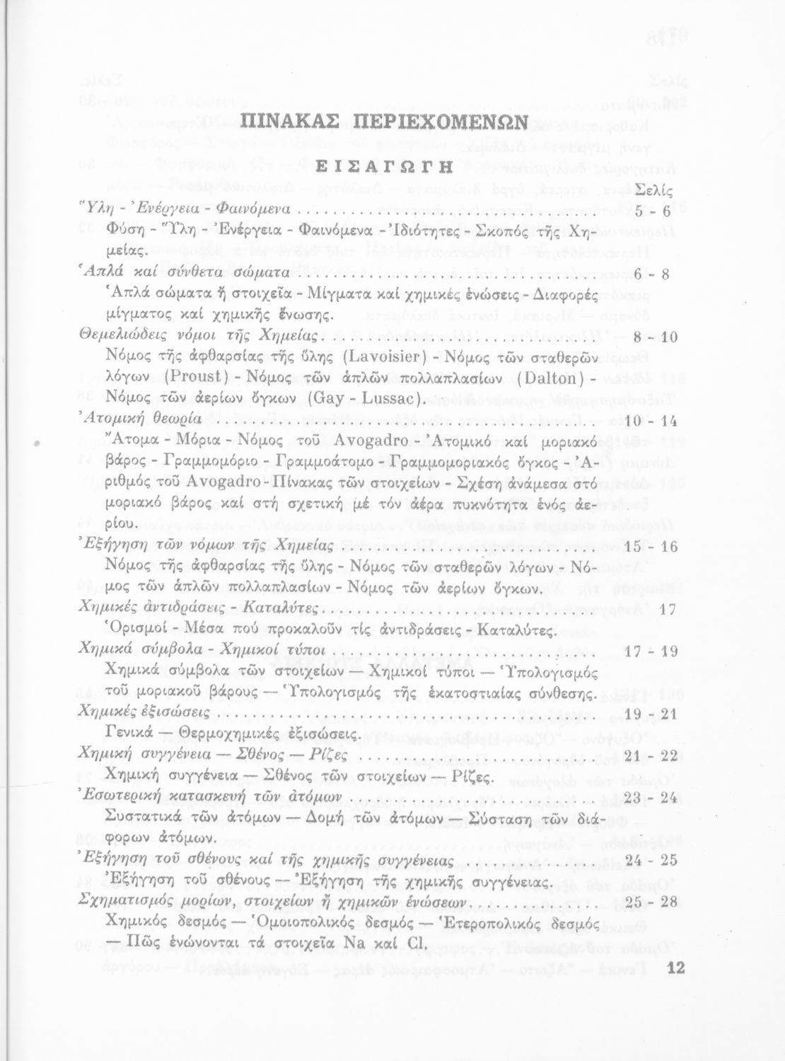 Σχολικό εγχειρίδιο Χημείας που απευθύνεται σε μαθητές Γυμνασίου με σκοπό τη περιγραφή εισαγωγικών εννοιών χημείας (ύλη, νόμοι χημείας, χημικές αντιδράσεις-εξισώσεις-ενώσεις). Στο βιβλίο γίνεται αναλυτική περιγραφή στοιχείων μετάλλων και αμέταλλων περιγράφοντας τις ιδιότητες και τις ενώσεις τους. Τέλος προσδιορίζεται η ακτινοβολία ραδιενεργών σωμάτων.