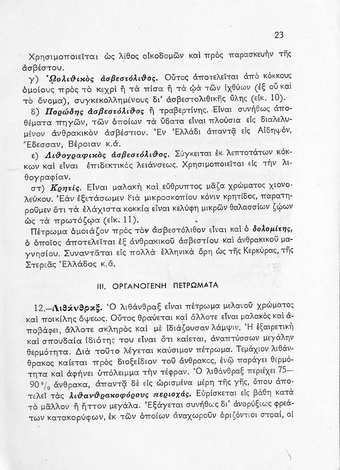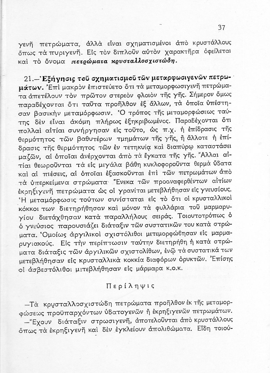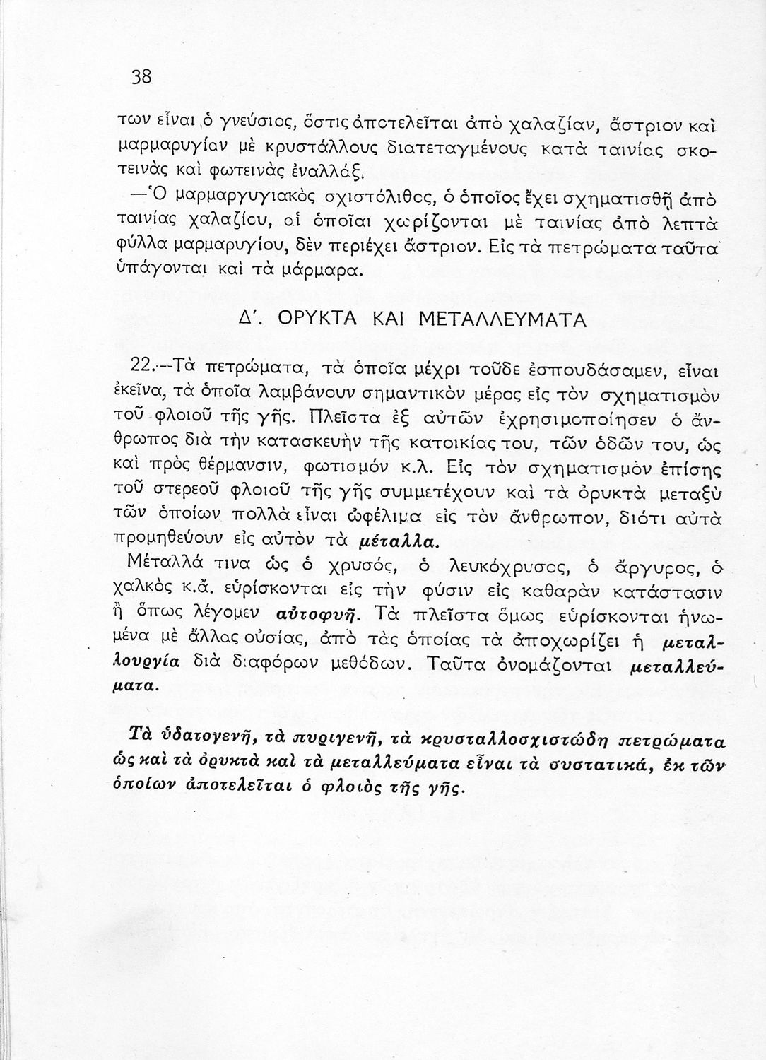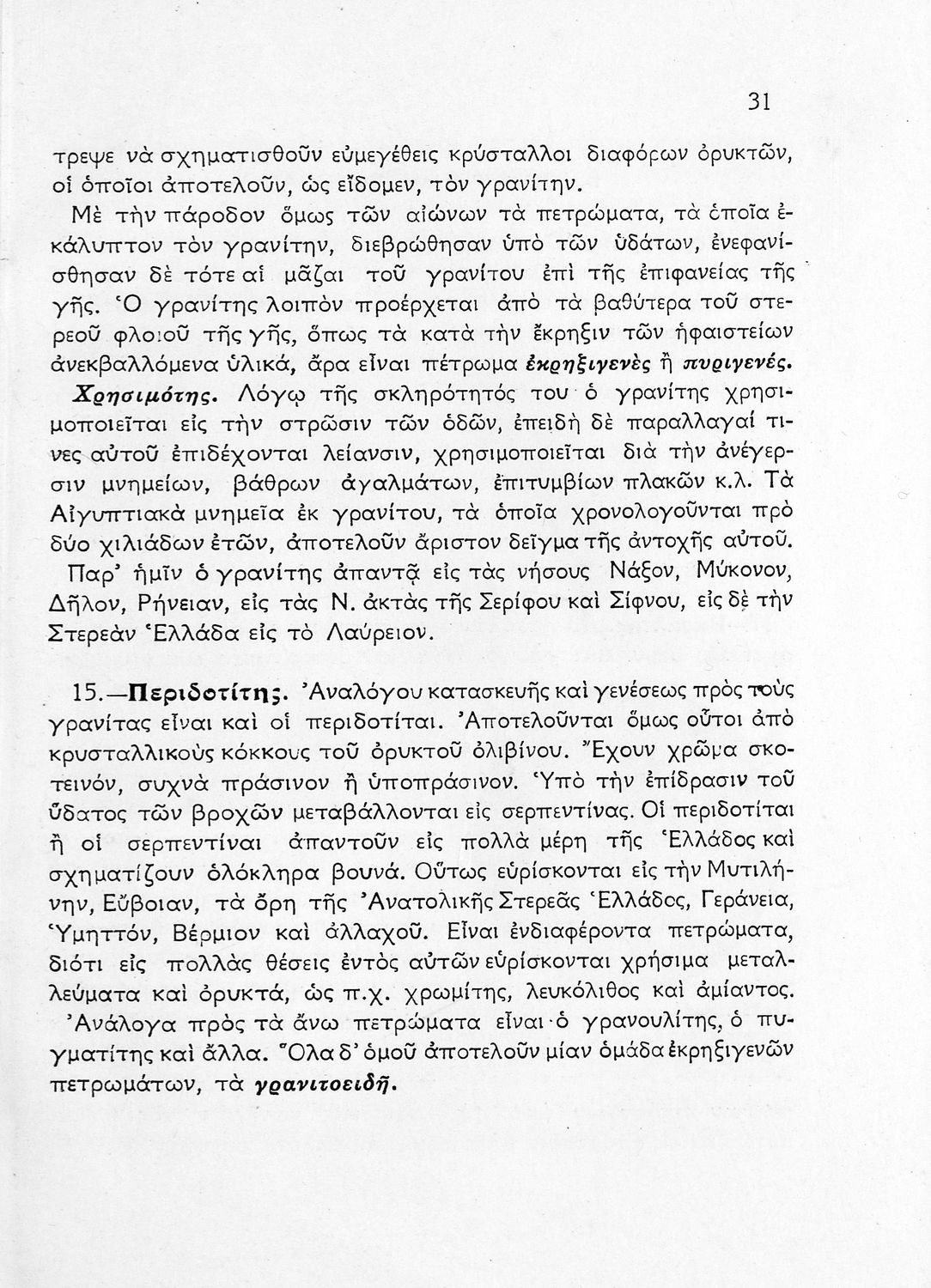 Σχολικό εγχειρίδιο Γεωλογίας/Ορυκτολογίας για την Γ΄ τάξη των Αστικών Σχολείων χωρισμένο σε χθονογραφία, δυναμική και ιστορική γεωλογία και γενική και ειδική ορυκτολογία.