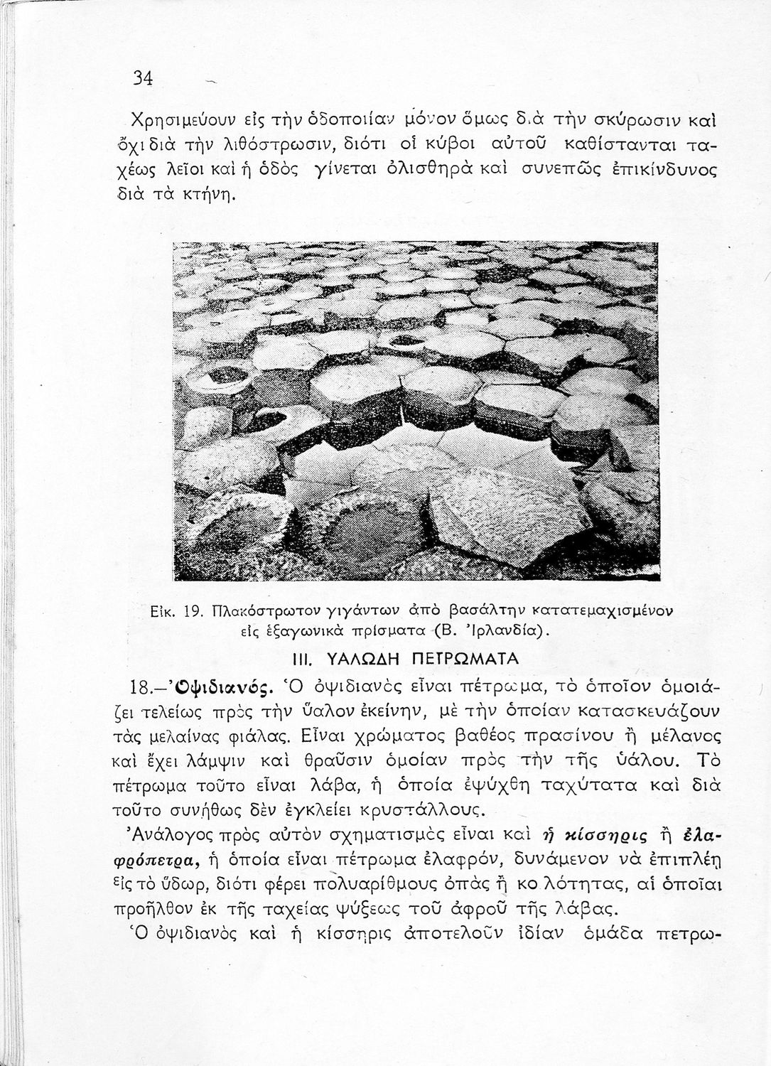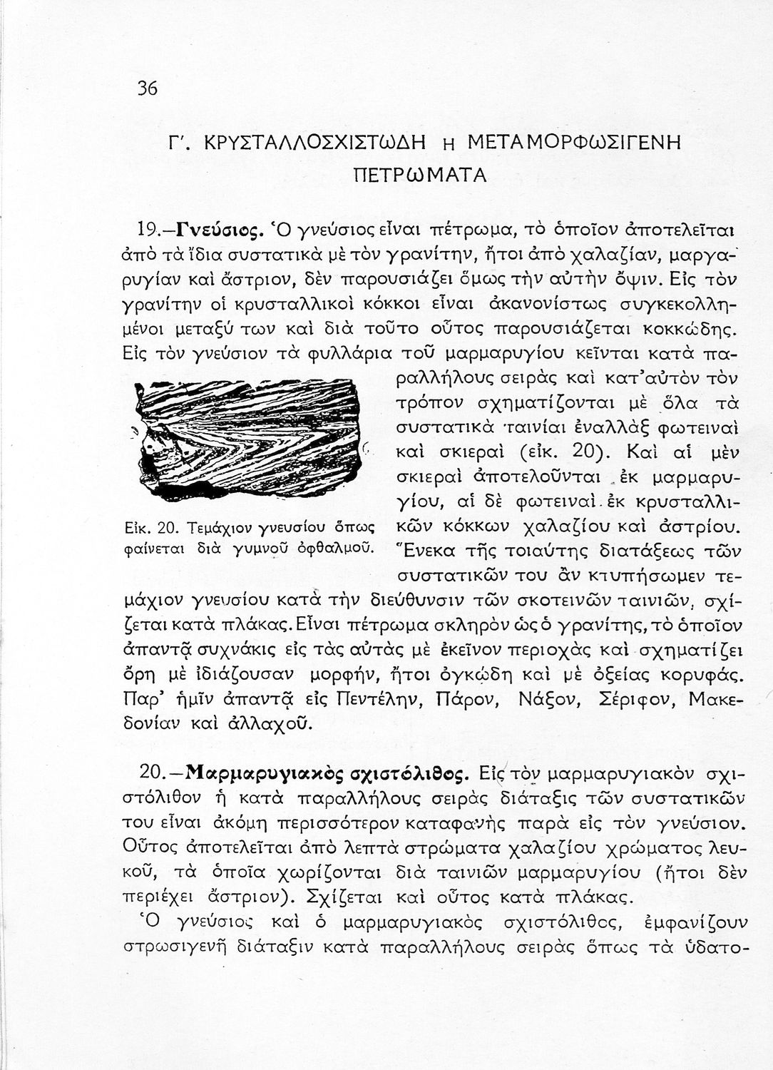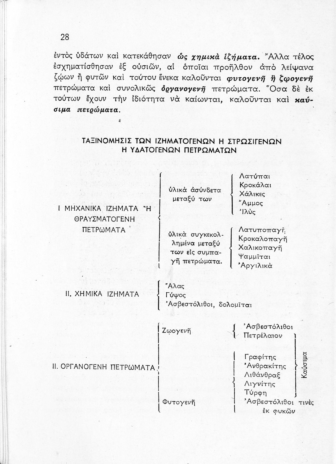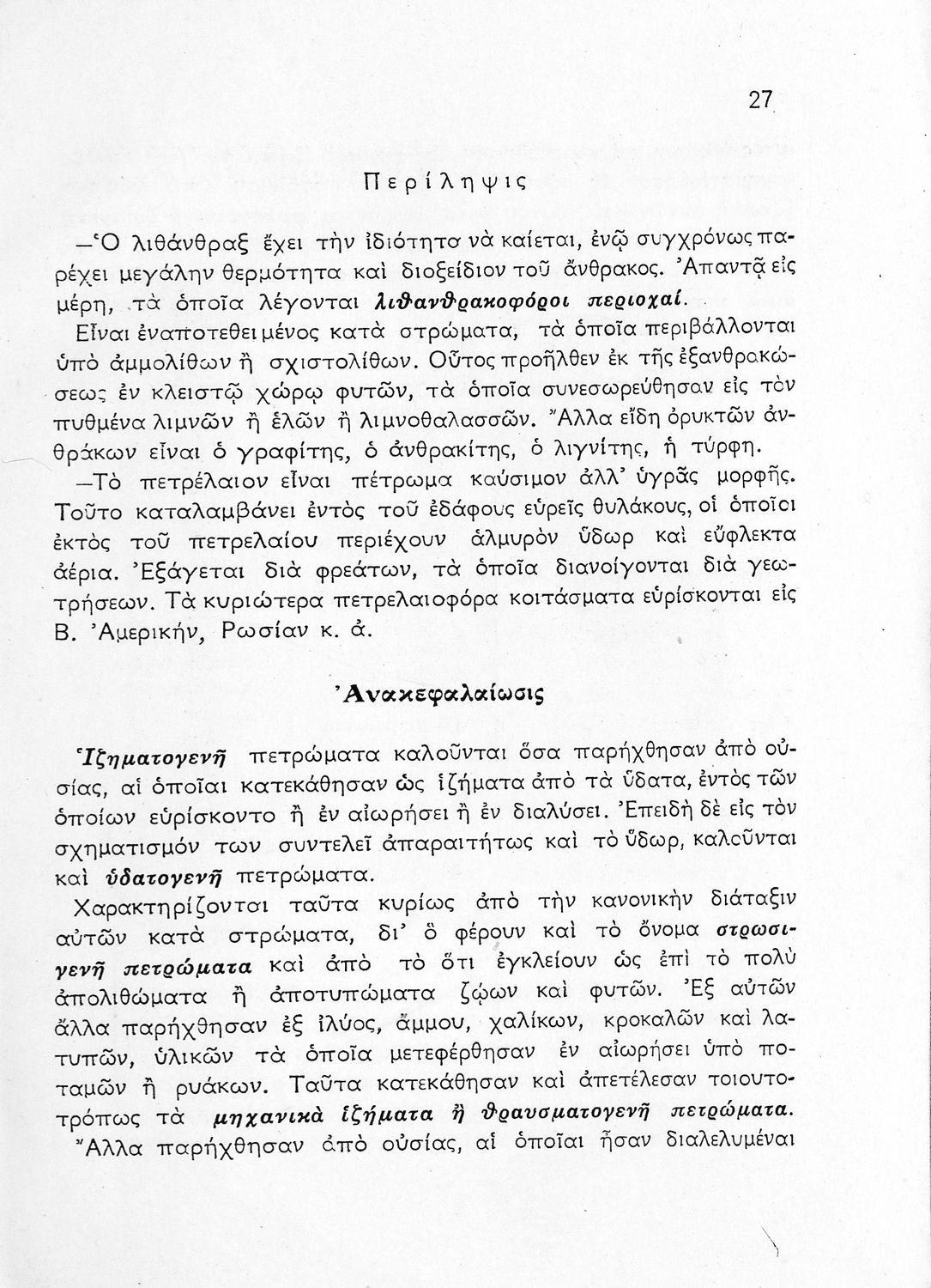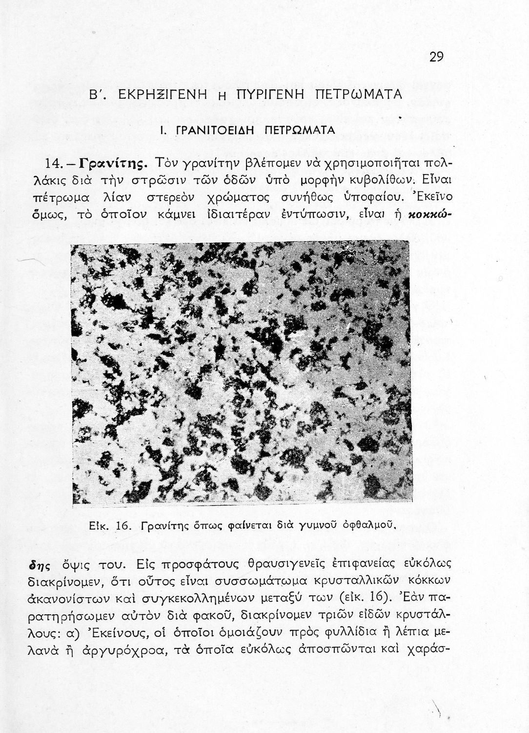 Σχολικό εγχειρίδιο Γεωλογίας/Ορυκτολογίας για την Γ΄ τάξη των Αστικών Σχολείων χωρισμένο σε χθονογραφία, δυναμική και ιστορική γεωλογία και γενική και ειδική ορυκτολογία.