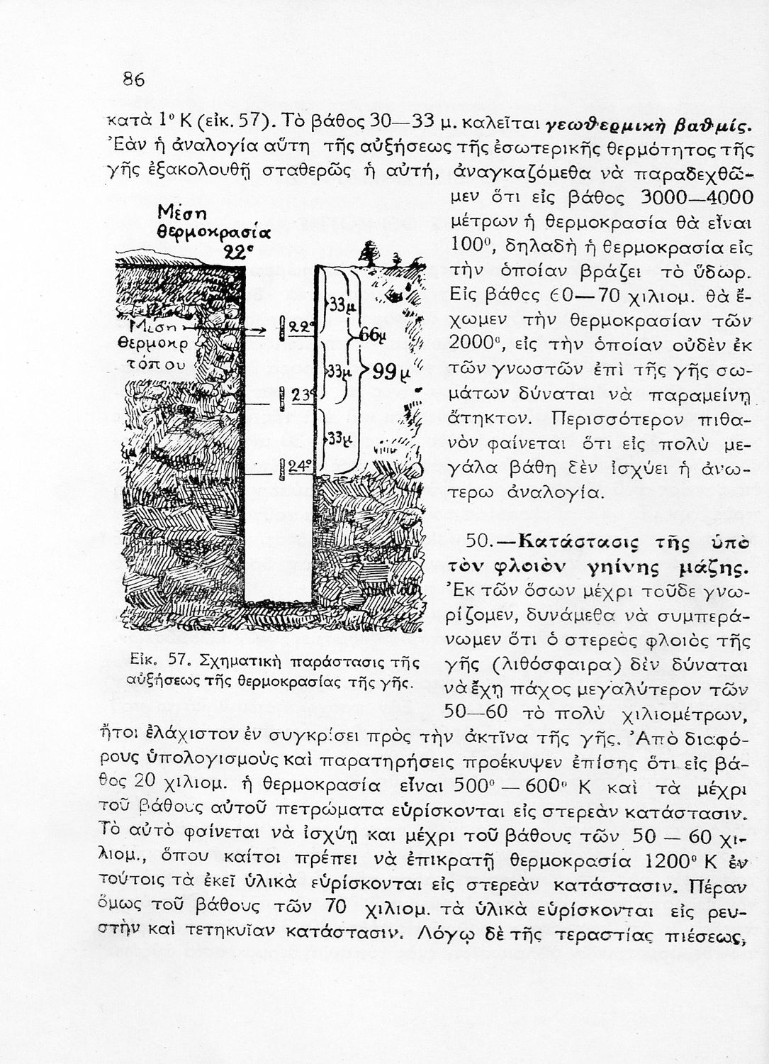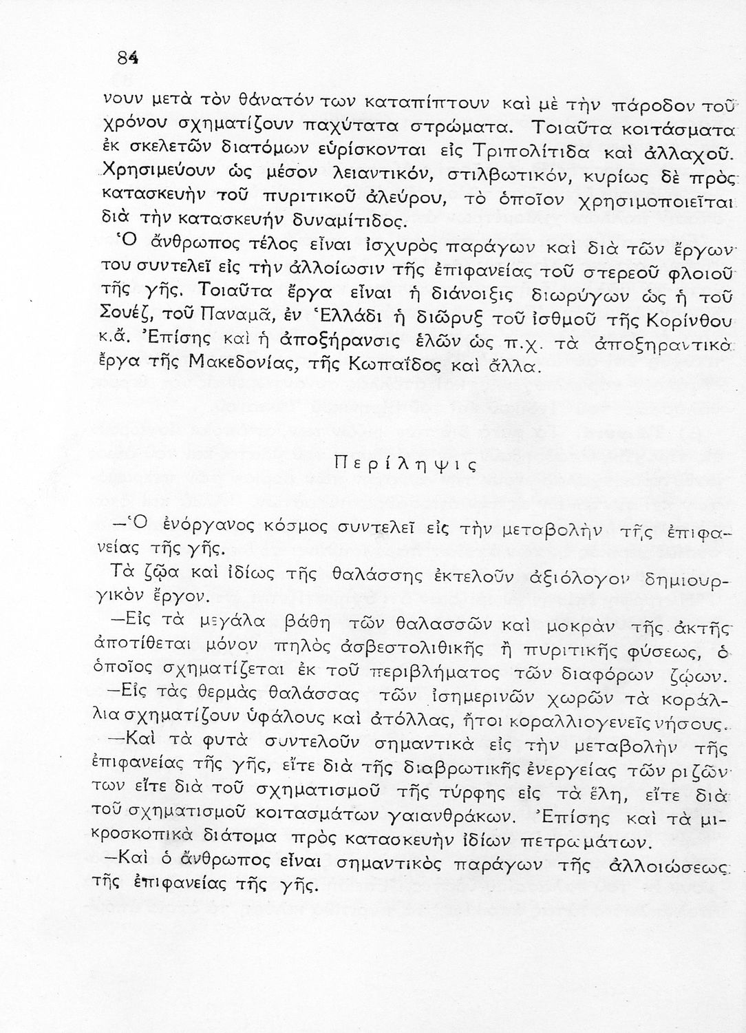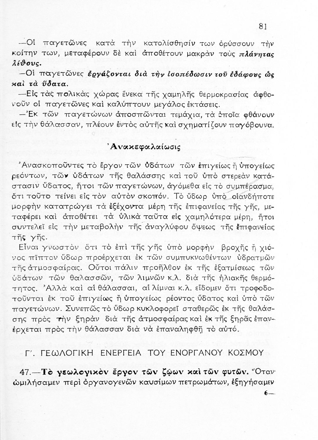 Σχολικό εγχειρίδιο Γεωλογίας/Ορυκτολογίας για την Γ΄ τάξη των Αστικών Σχολείων χωρισμένο σε χθονογραφία, δυναμική και ιστορική γεωλογία και γενική και ειδική ορυκτολογία.