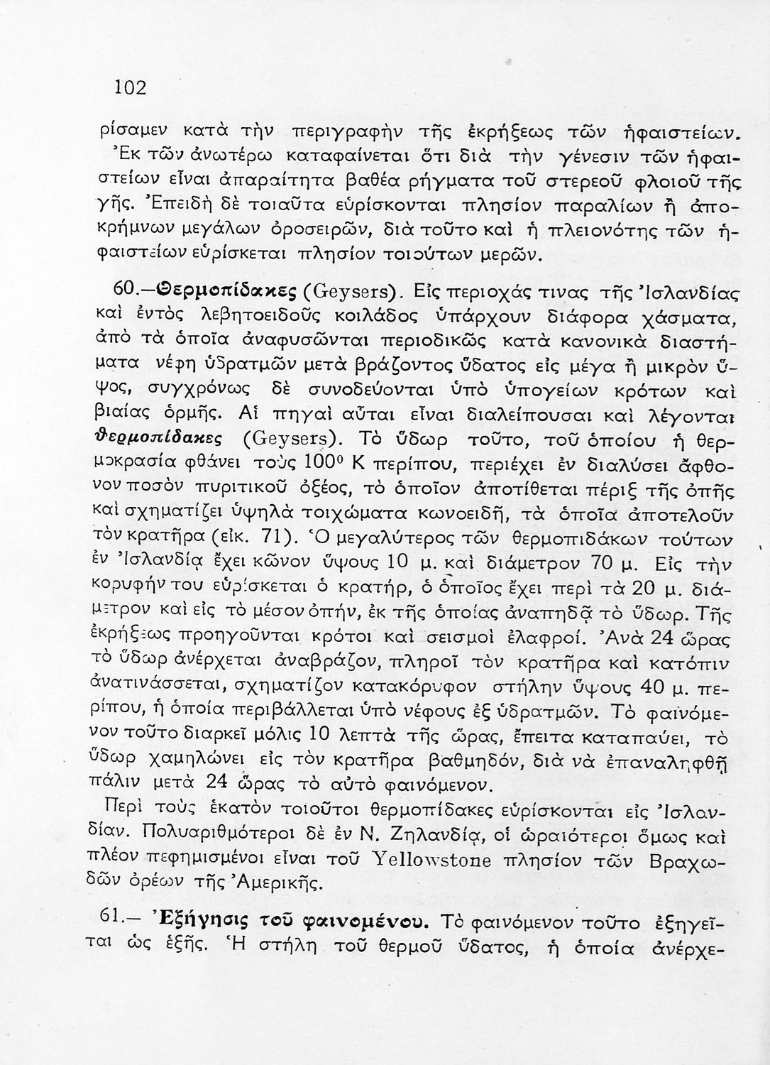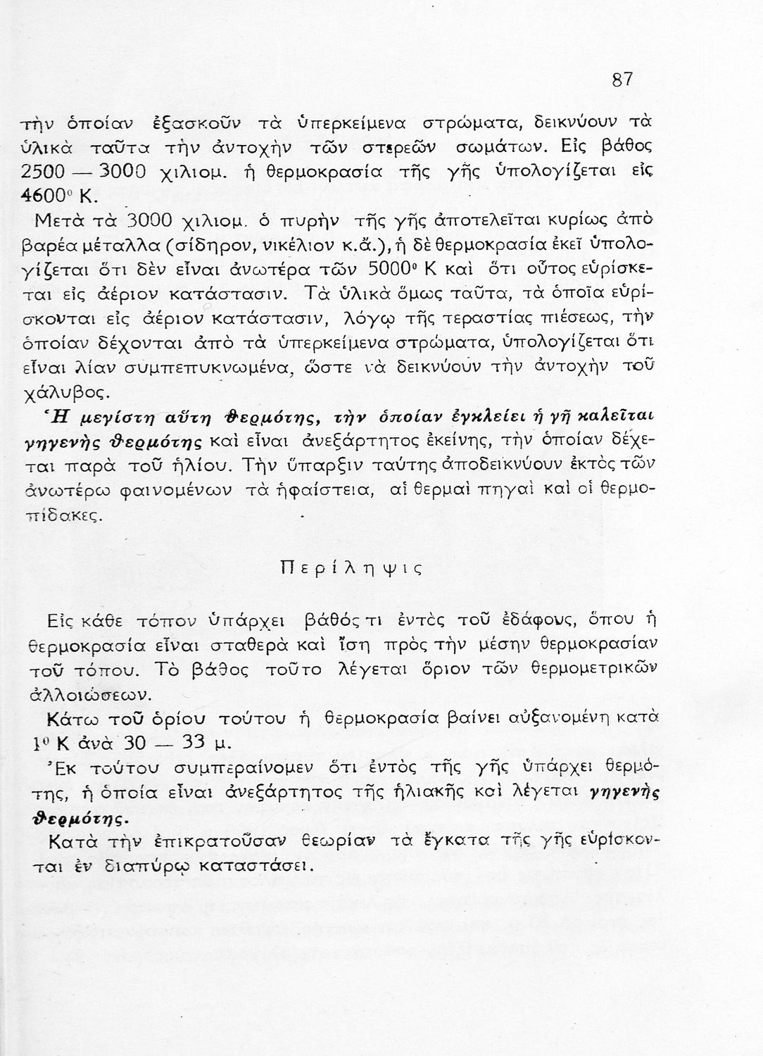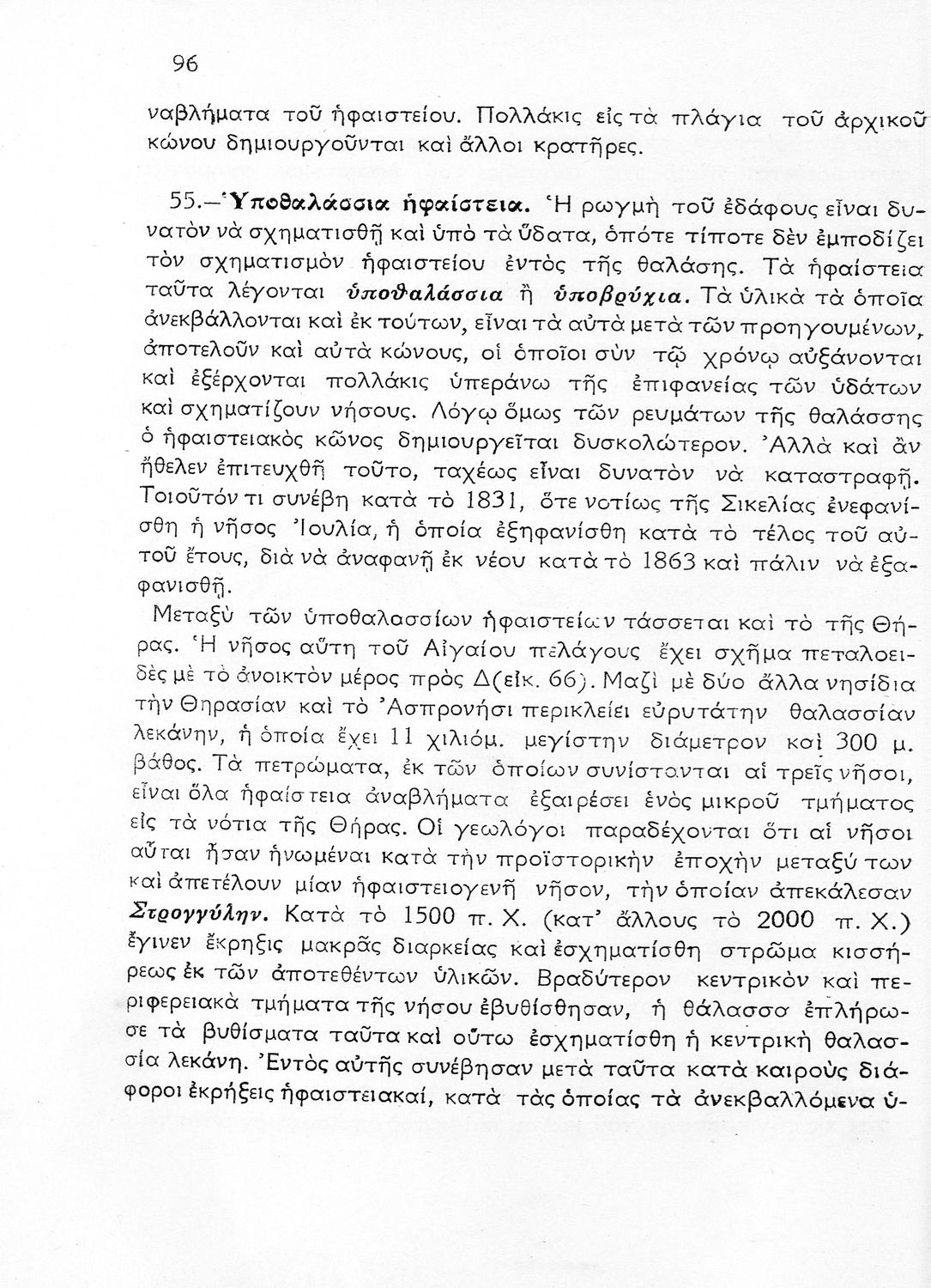 Σχολικό εγχειρίδιο Γεωλογίας/Ορυκτολογίας για την Γ΄ τάξη των Αστικών Σχολείων χωρισμένο σε χθονογραφία, δυναμική και ιστορική γεωλογία και γενική και ειδική ορυκτολογία.