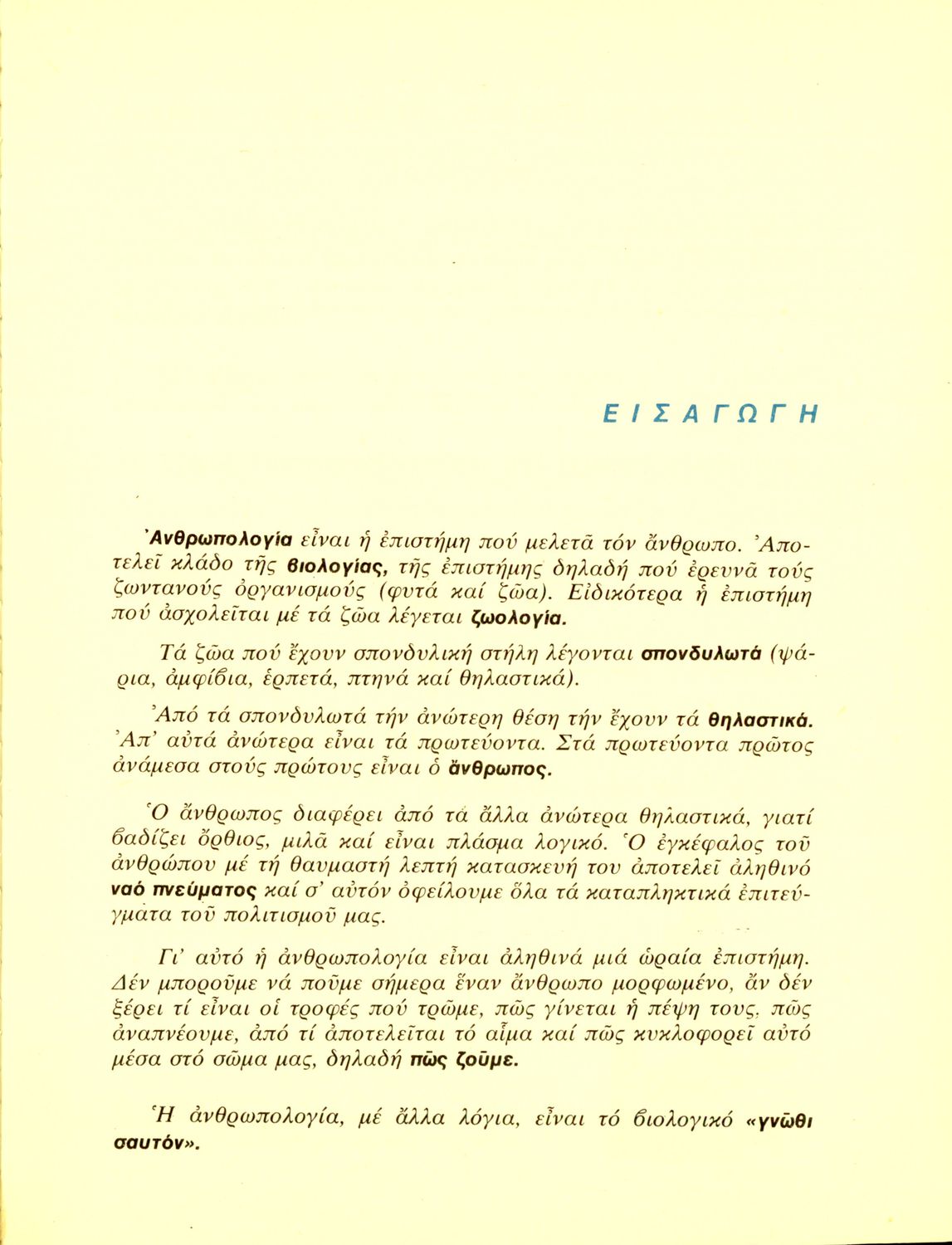 Παρουσίαση περιεχομένου: Σχολικό εγχειρίδιο Ανθρωπολογίας Β΄ Λυκείου που εστιάζει στην κατασκευή, ανάπτυξη και λειτουργία του ανθρώπινου οργανισμού και τη σχέση του ανθρώπου με το φυσικό περιβάλλον. Περιέχει και αναφορά στις ανθρώπινες φυλές.