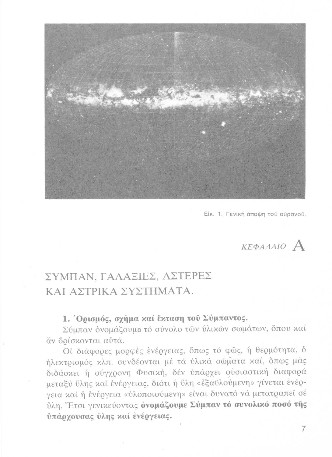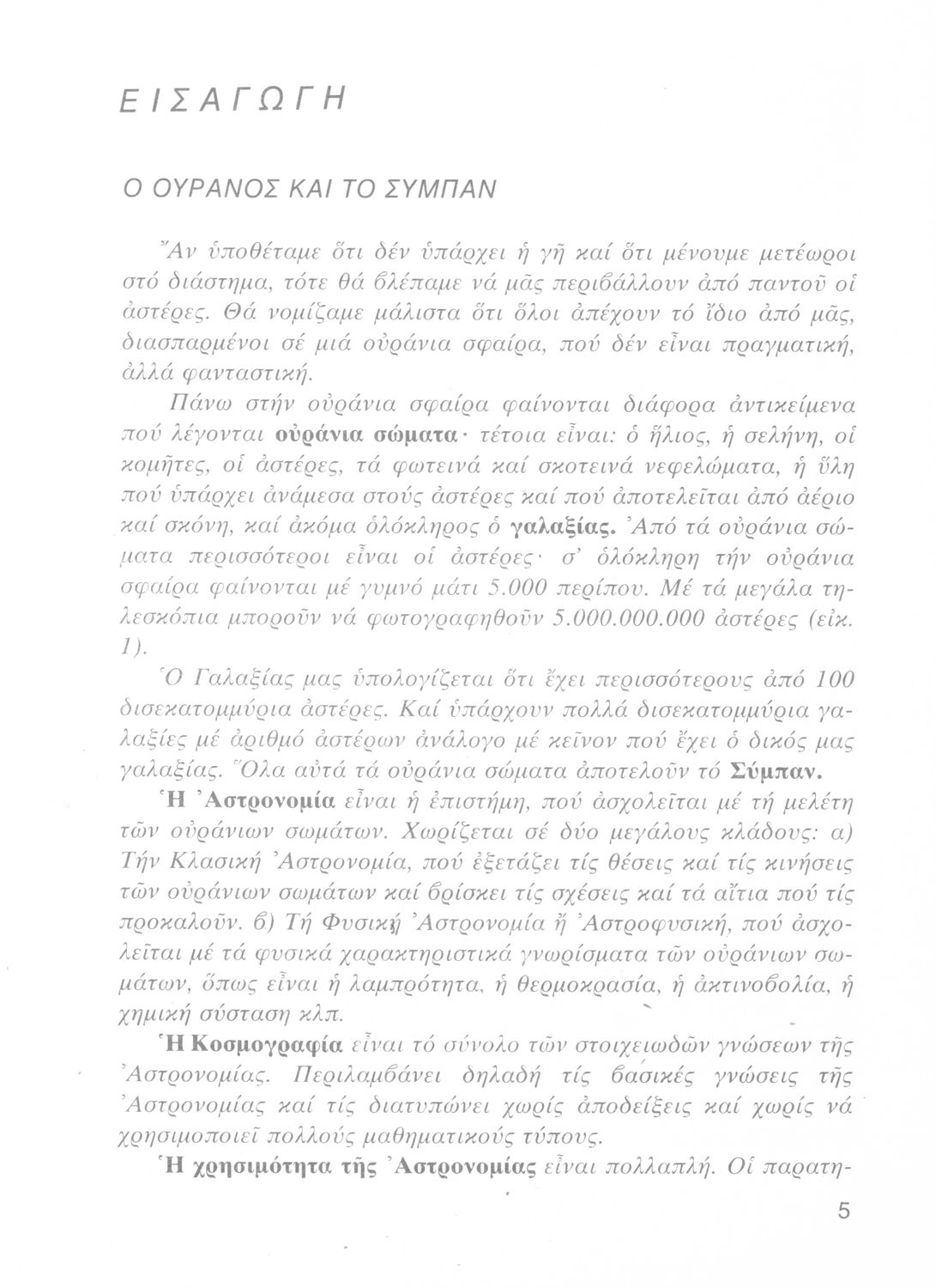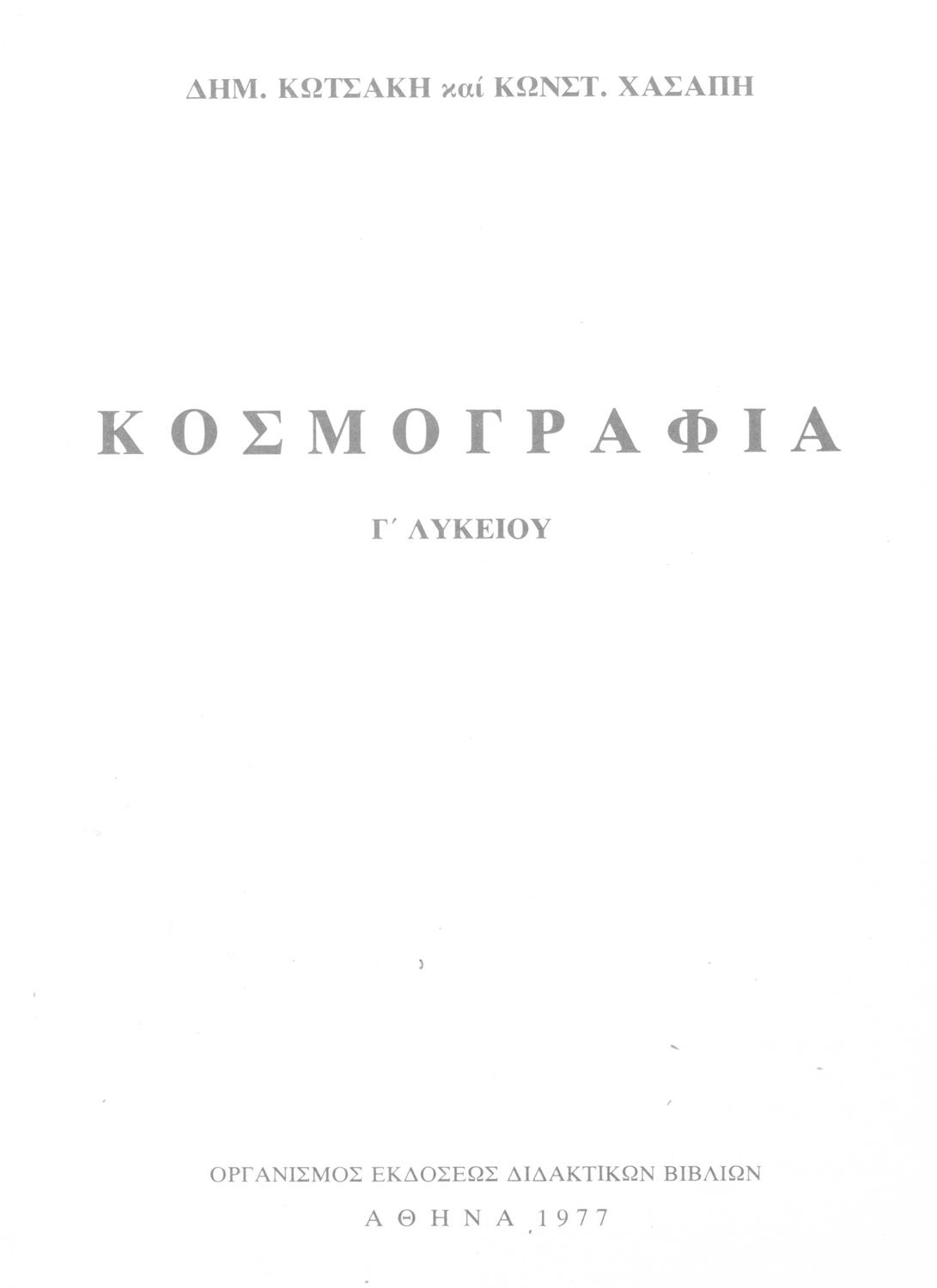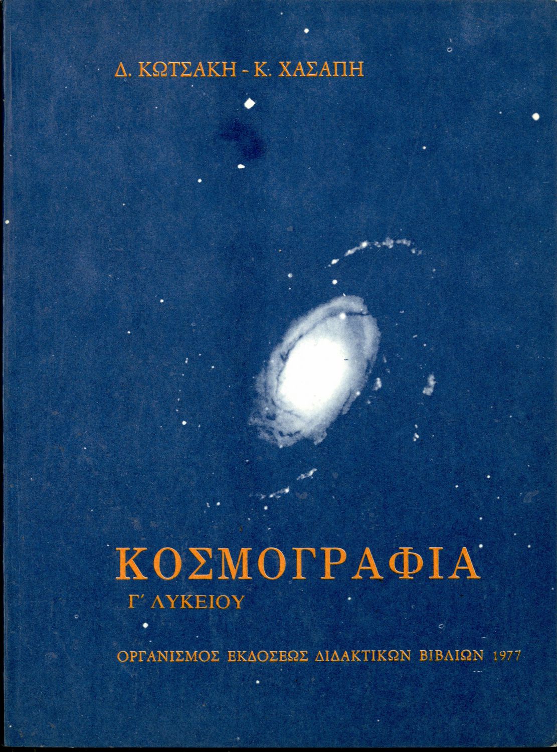 Σχολικό εγχειρίδιο Κοσμογραφίας Γ΄ Λυκείου που πραγματεύεται τη μορφή, σύσταση, μέγεθος και κίνηση των γαλαξιών και των πλανητών. Περιέχει στοιχεία αστροναυτικής και πίνακα με 88 αστερισμούς, τα διεθνή ονόματα