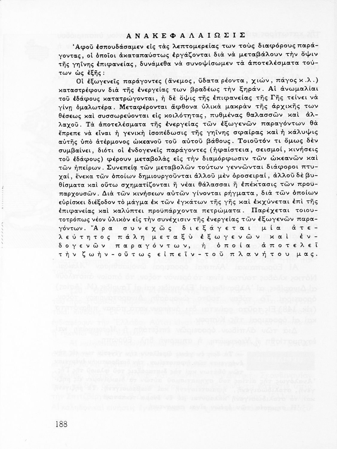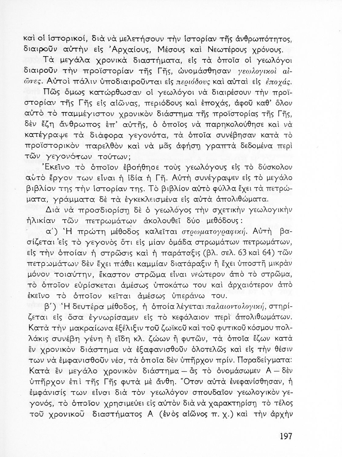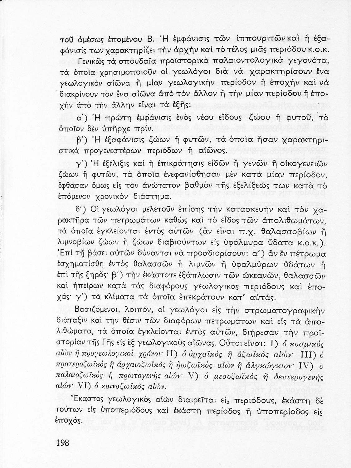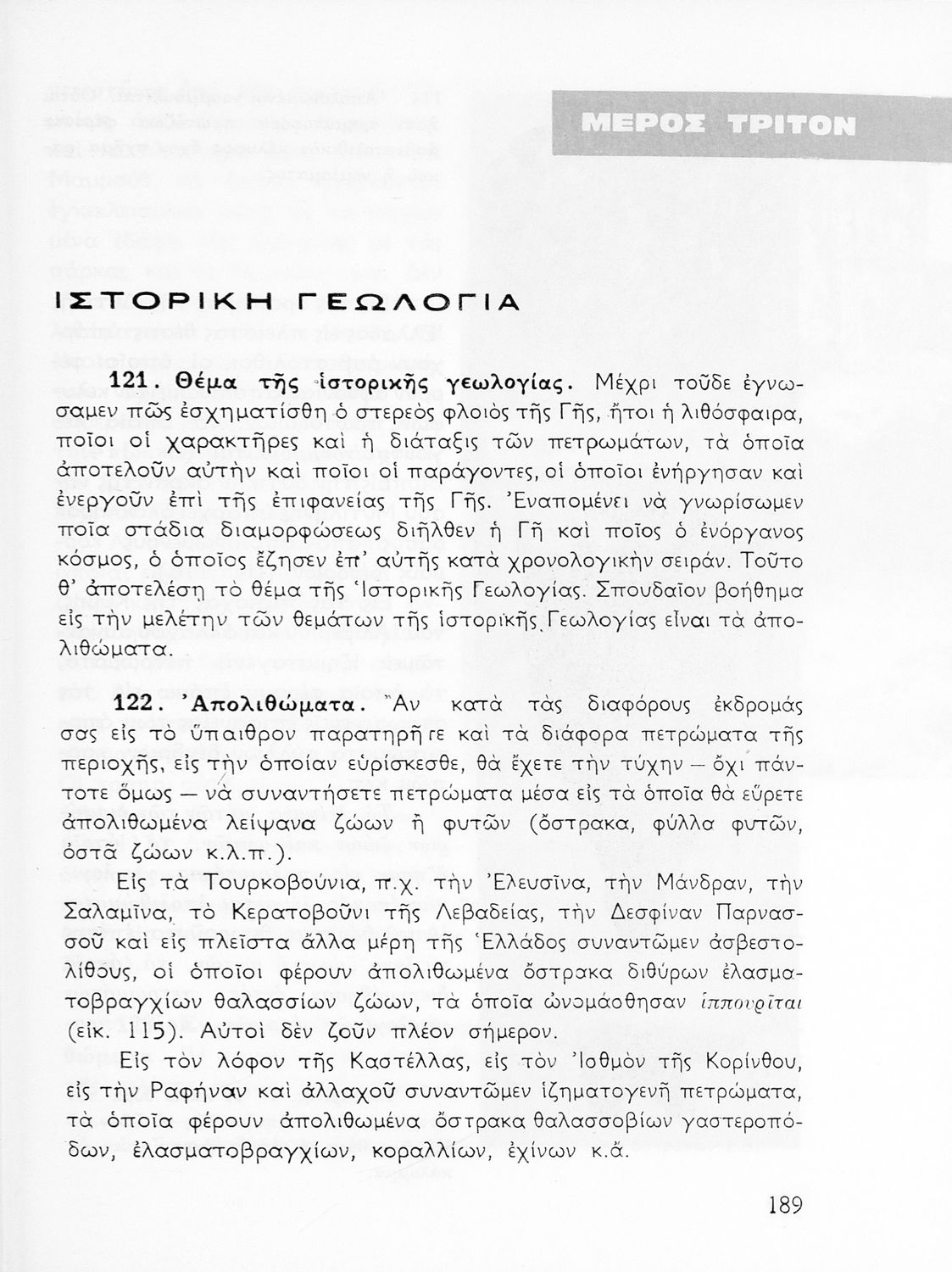 Σχολικό εγχειρίδιο Γεωλογίας/Ορυκτολογίας για την Α΄ Λυκείου που περιλαμβάνει χθονογραφική, δυναμική και ιστορική γεωλογία, και γενική και ειδική ορυκτολογία. Ο συγγραφέας ήταν καθηγητής πανεπιστήμιου και η συγγραφέας φυσικός. Περιέχει παράρτημα με «Στοιχεία Μαθηματικής Γεωγραφίας» από τη γεωγραφία Δ’ τάξης του Αλκίνοου Μάζη (εκδ 1963).