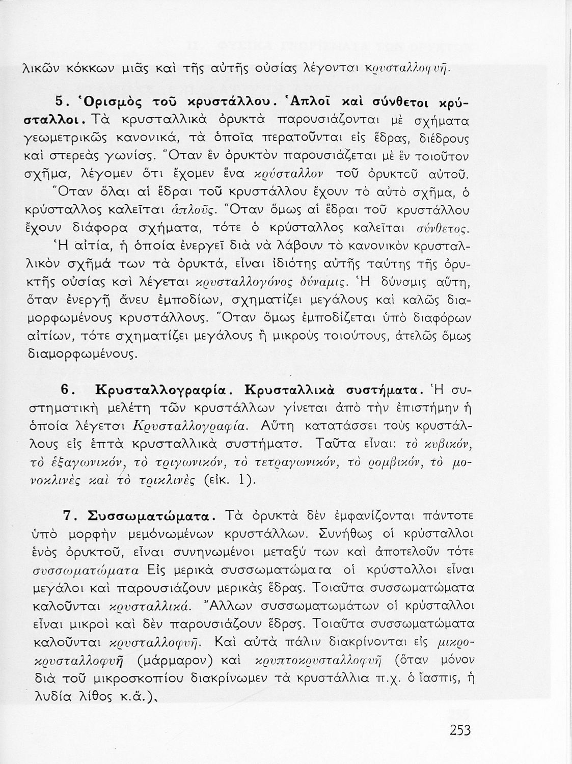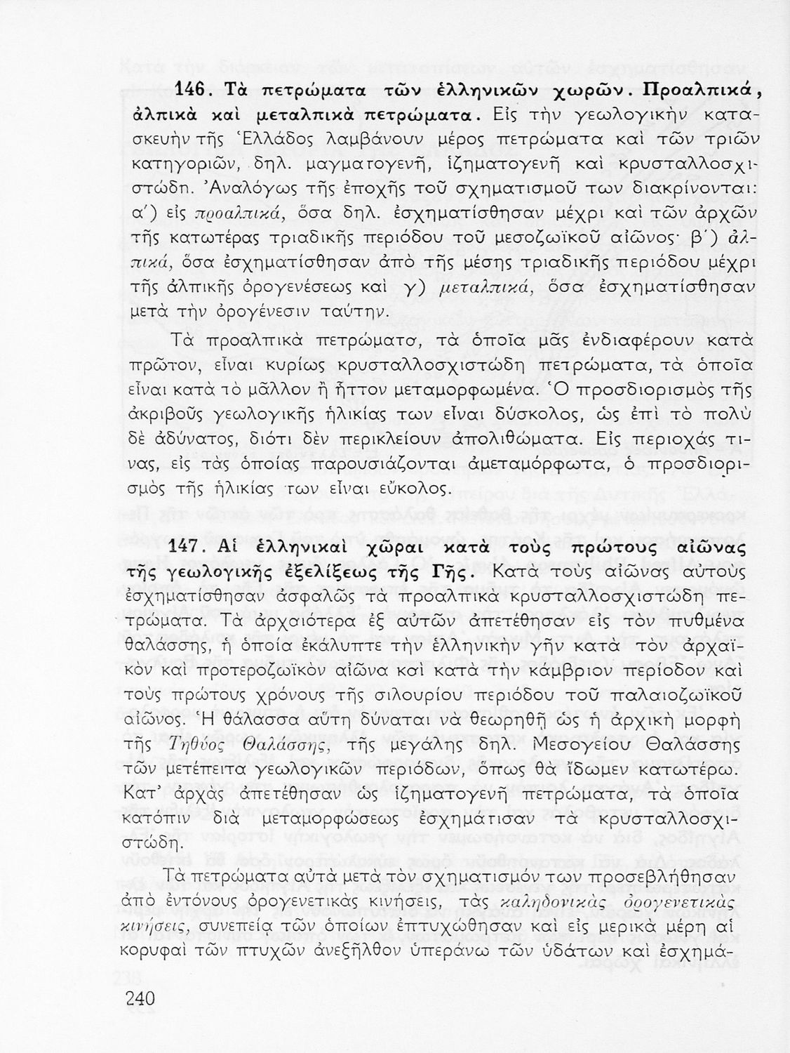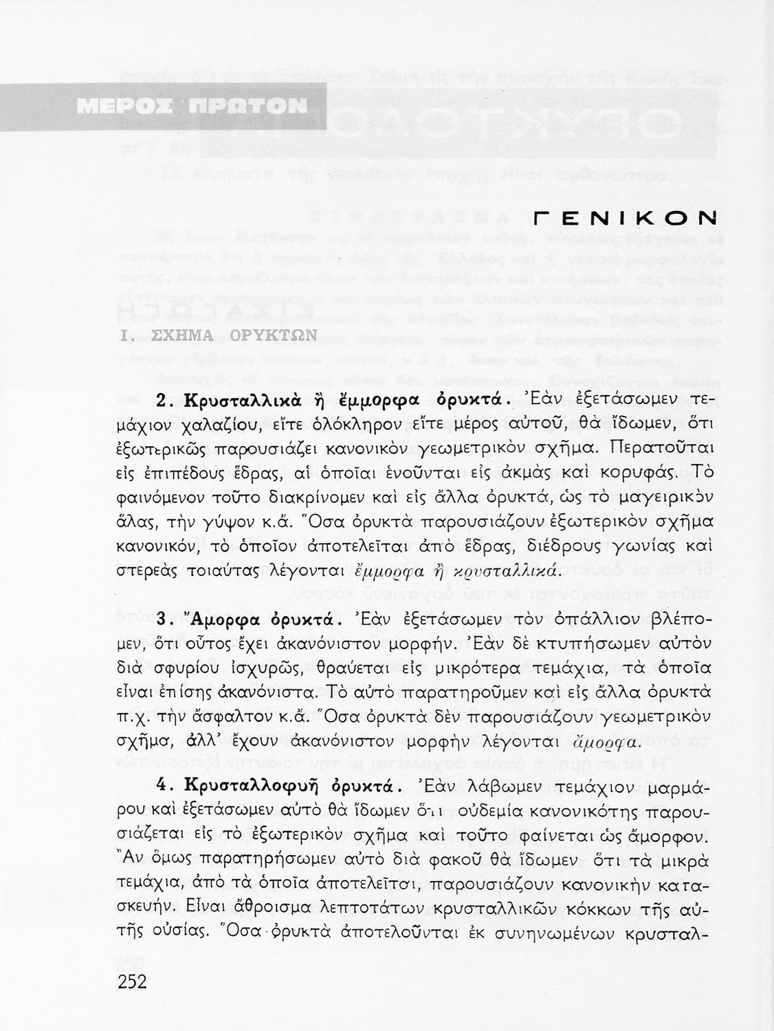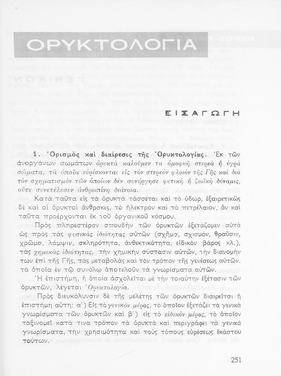 Σχολικό εγχειρίδιο Γεωλογίας/Ορυκτολογίας για την Α΄ Λυκείου που περιλαμβάνει χθονογραφική, δυναμική και ιστορική γεωλογία, και γενική και ειδική ορυκτολογία. Ο συγγραφέας ήταν καθηγητής πανεπιστήμιου και η συγγραφέας φυσικός. Περιέχει παράρτημα με «Στοιχεία Μαθηματικής Γεωγραφίας» από τη γεωγραφία Δ’ τάξης του Αλκίνοου Μάζη (εκδ 1963).