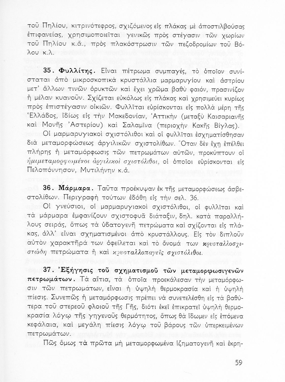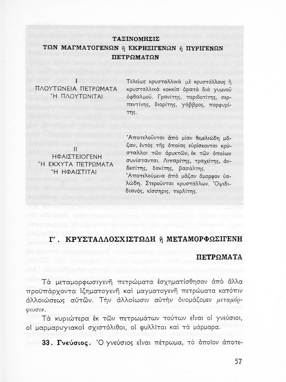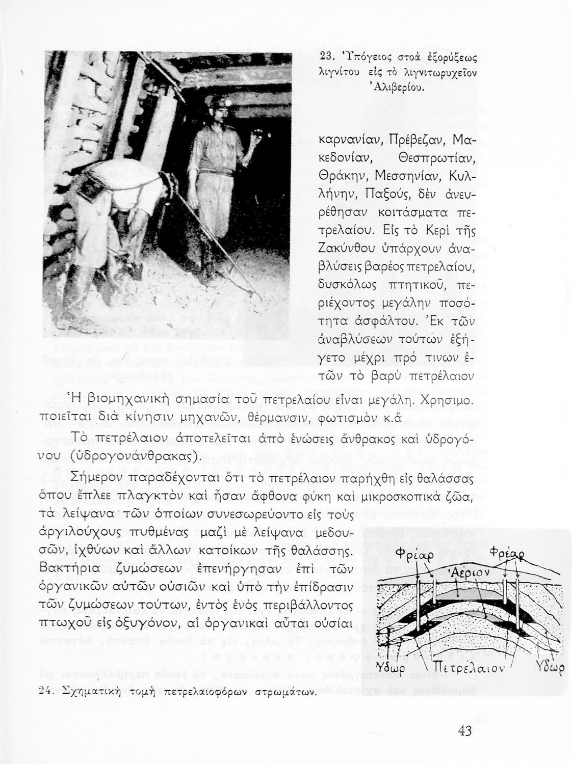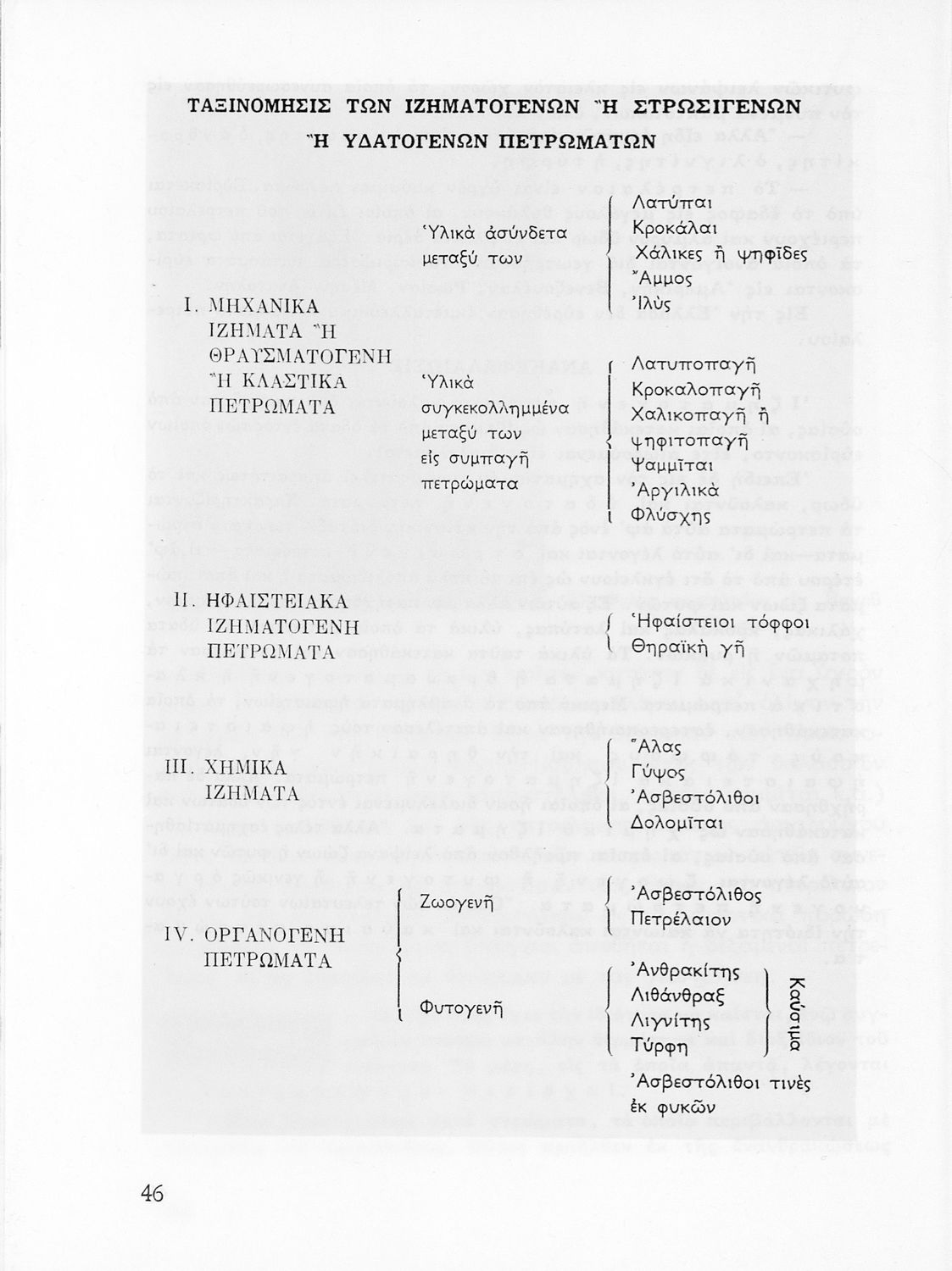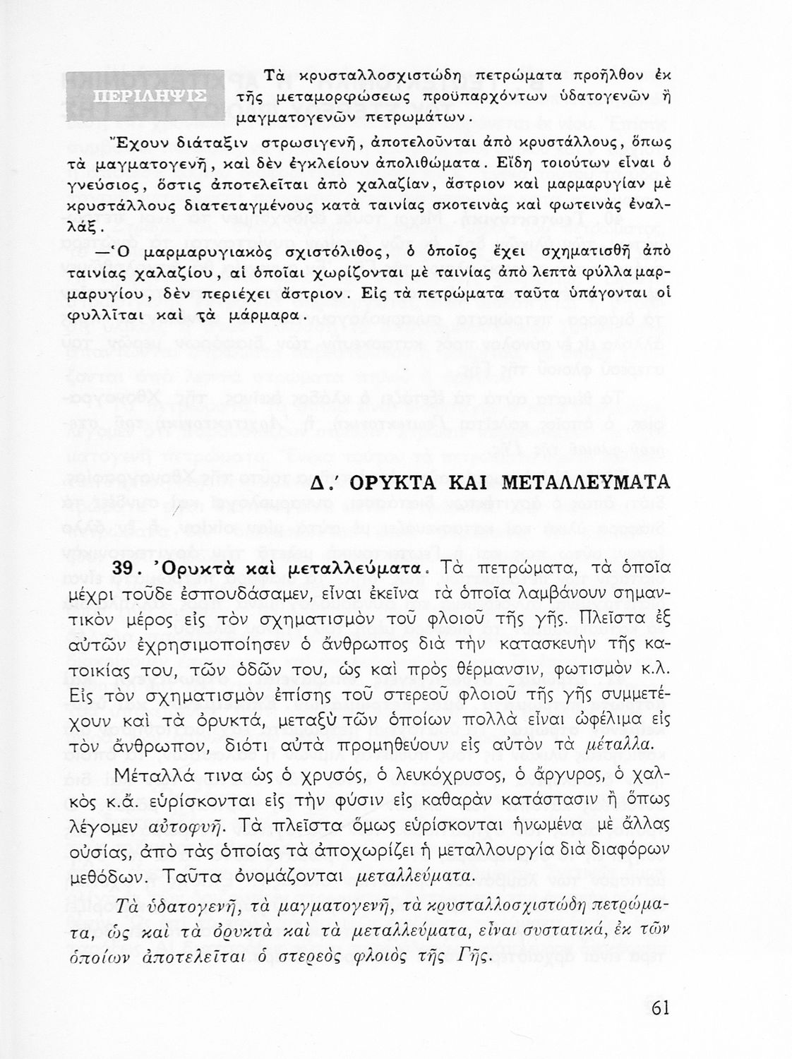 Σχολικό εγχειρίδιο Γεωλογίας/Ορυκτολογίας για την Α΄ Λυκείου που περιλαμβάνει χθονογραφική, δυναμική και ιστορική γεωλογία, και γενική και ειδική ορυκτολογία. Ο συγγραφέας ήταν καθηγητής πανεπιστήμιου και η συγγραφέας φυσικός. Περιέχει παράρτημα με «Στοιχεία Μαθηματικής Γεωγραφίας» από τη γεωγραφία Δ’ τάξης του Αλκίνοου Μάζη (εκδ 1963).