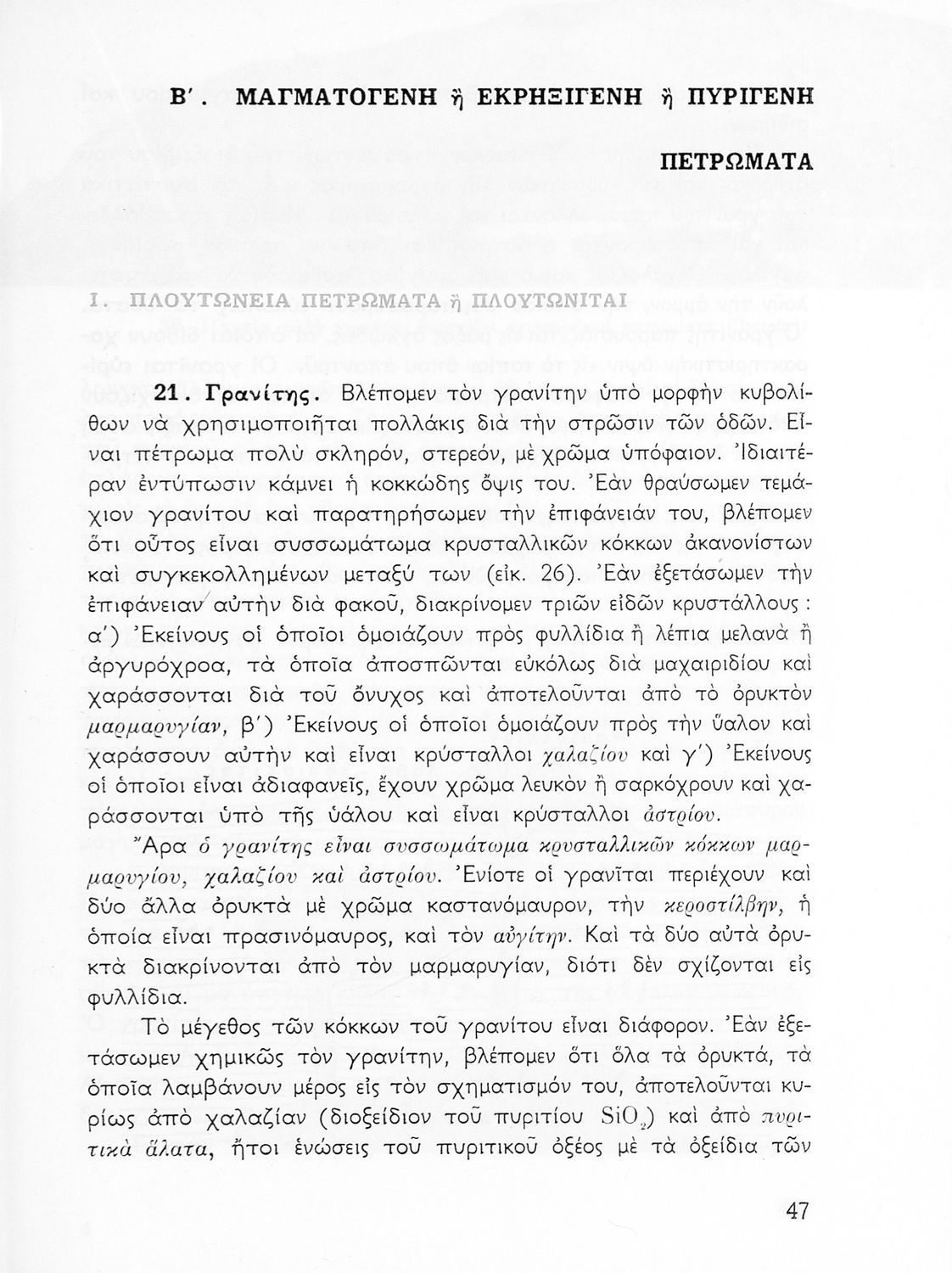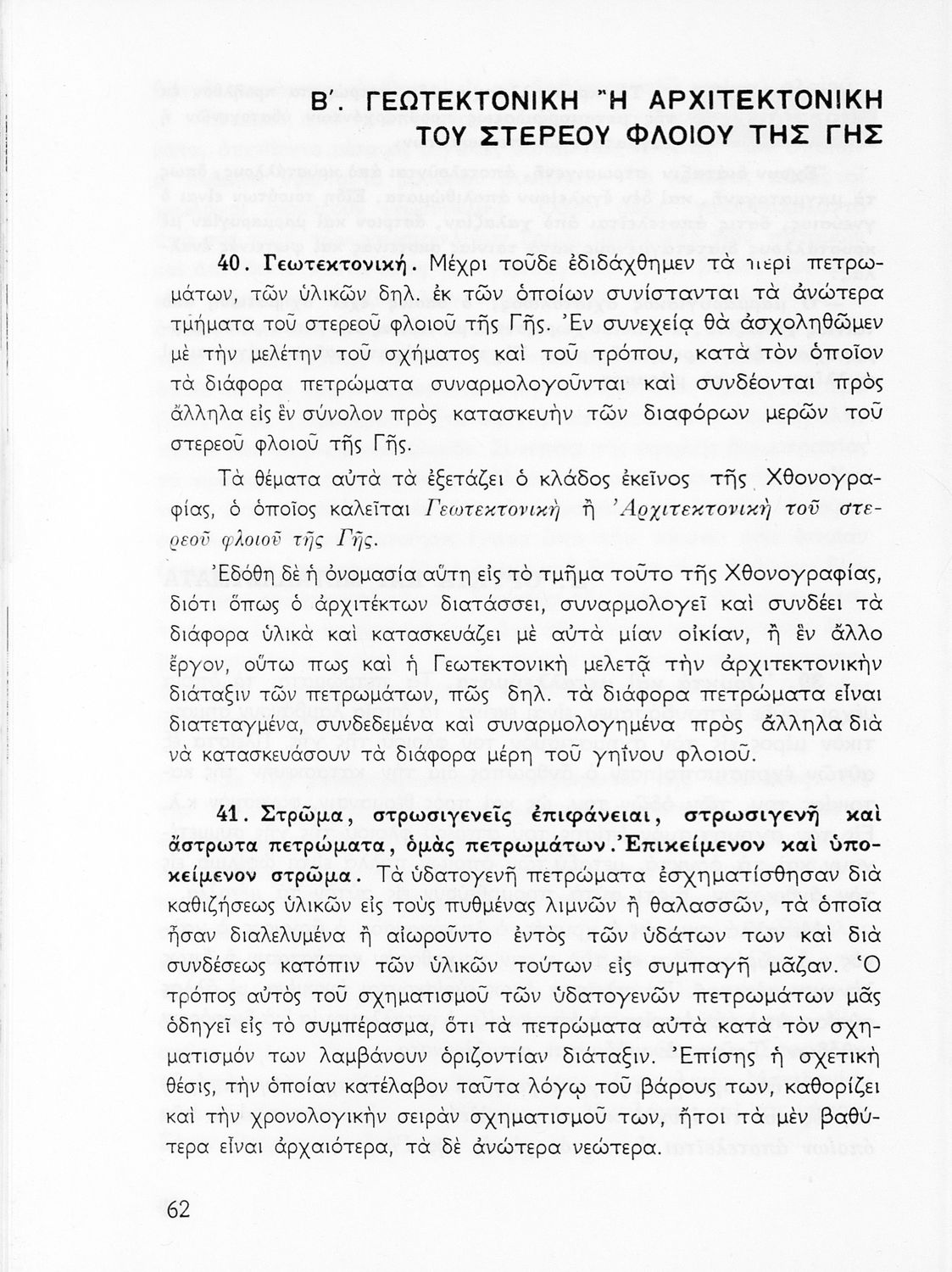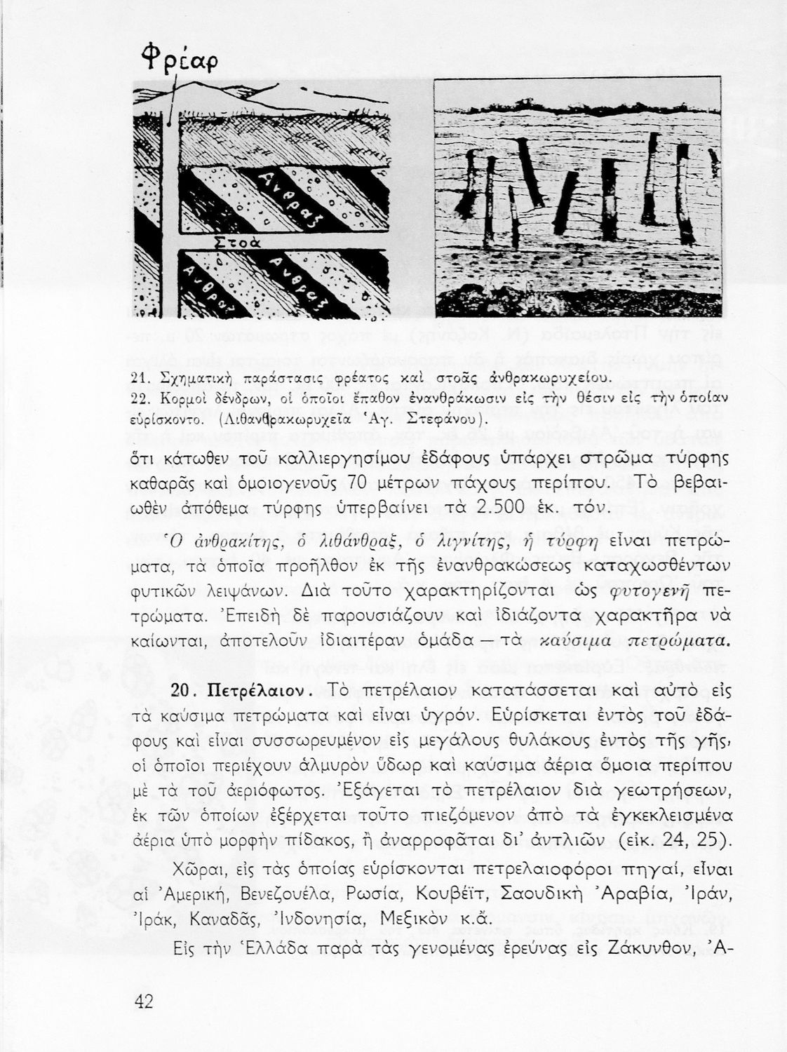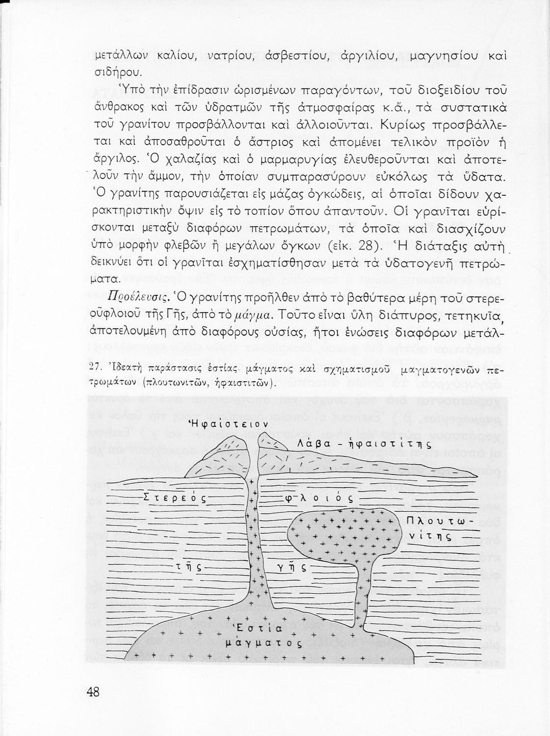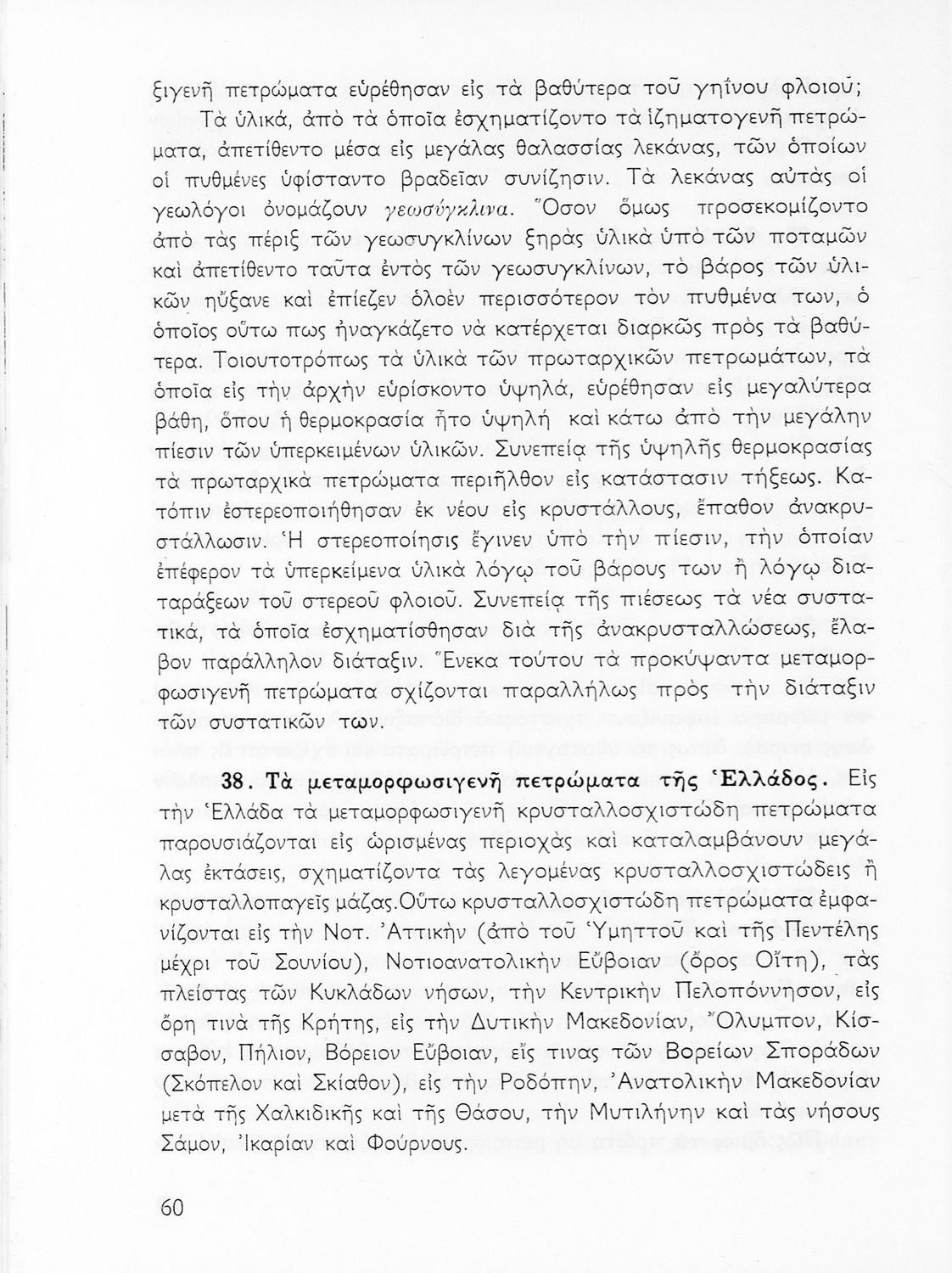 Σχολικό εγχειρίδιο Γεωλογίας/Ορυκτολογίας για την Α΄ Λυκείου που περιλαμβάνει χθονογραφική, δυναμική και ιστορική γεωλογία, και γενική και ειδική ορυκτολογία. Ο συγγραφέας ήταν καθηγητής πανεπιστήμιου και η συγγραφέας φυσικός. Περιέχει παράρτημα με «Στοιχεία Μαθηματικής Γεωγραφίας» από τη γεωγραφία Δ’ τάξης του Αλκίνοου Μάζη (εκδ 1963).