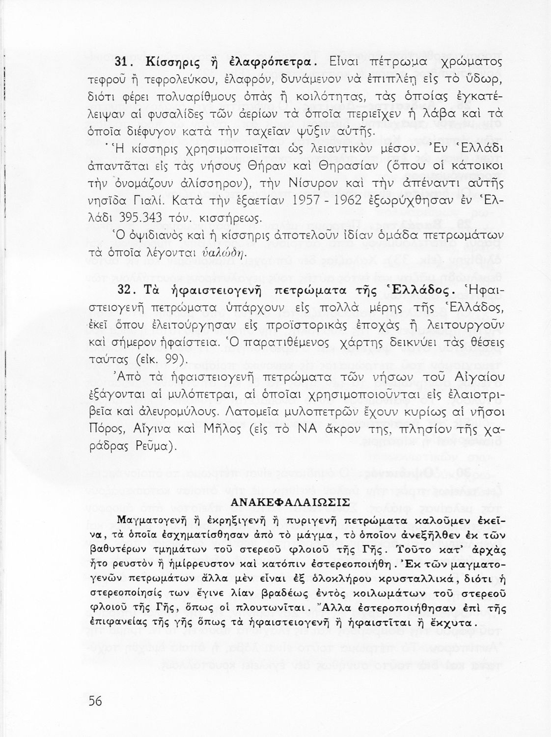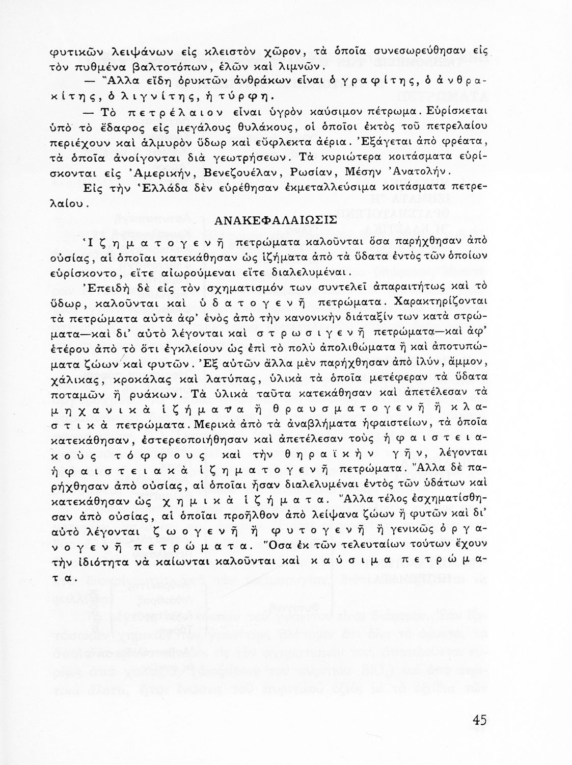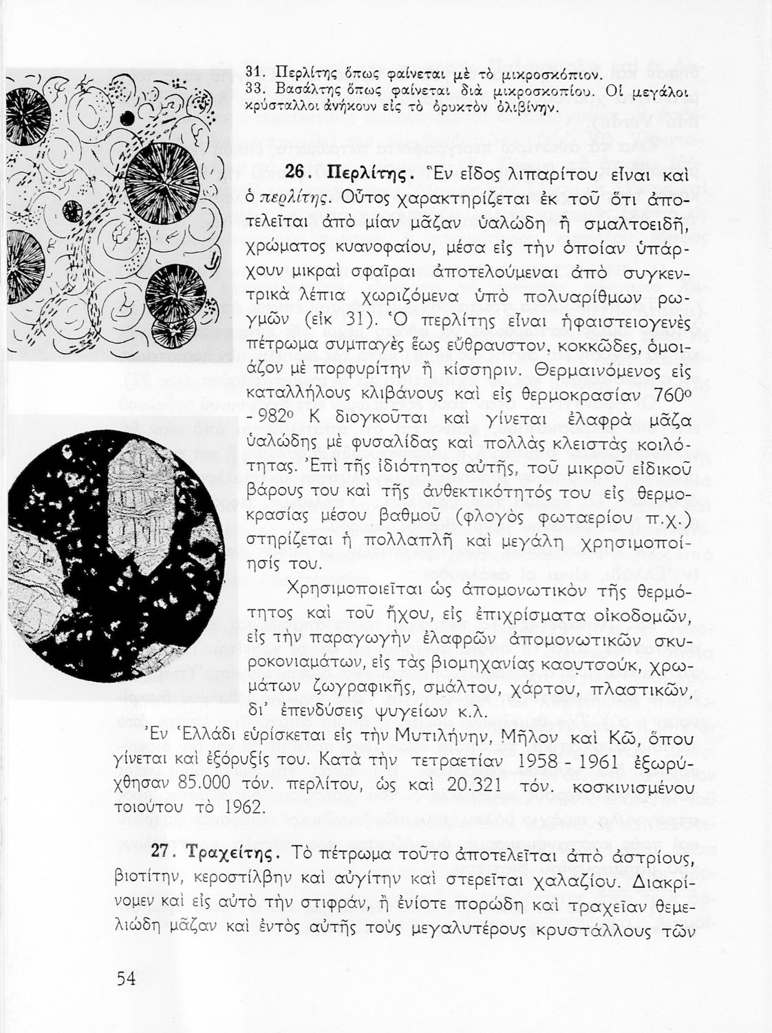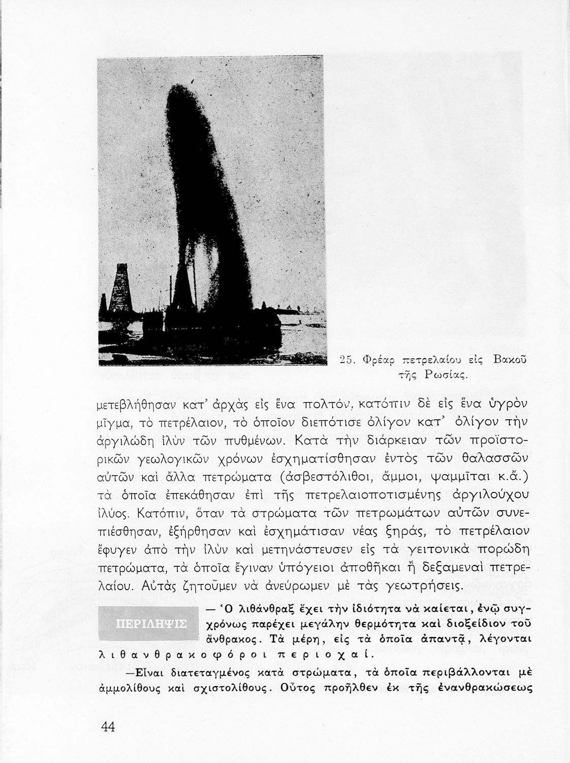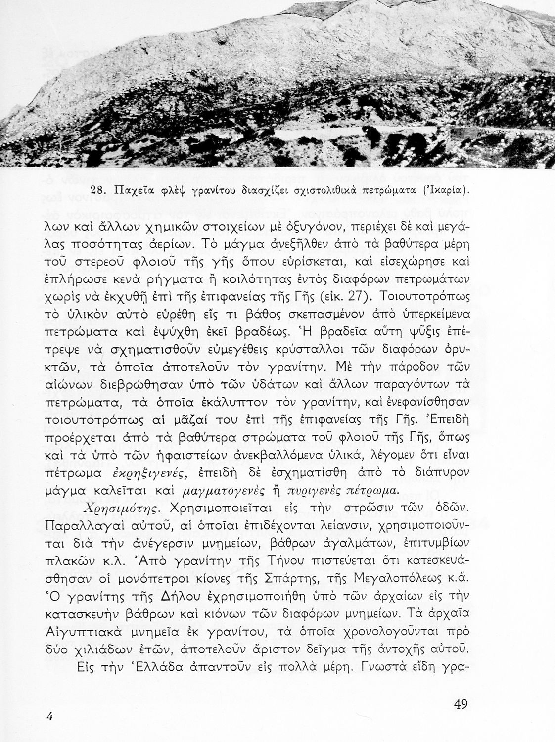 Σχολικό εγχειρίδιο Γεωλογίας/Ορυκτολογίας για την Α΄ Λυκείου που περιλαμβάνει χθονογραφική, δυναμική και ιστορική γεωλογία, και γενική και ειδική ορυκτολογία. Ο συγγραφέας ήταν καθηγητής πανεπιστήμιου και η συγγραφέας φυσικός. Περιέχει παράρτημα με «Στοιχεία Μαθηματικής Γεωγραφίας» από τη γεωγραφία Δ’ τάξης του Αλκίνοου Μάζη (εκδ 1963).