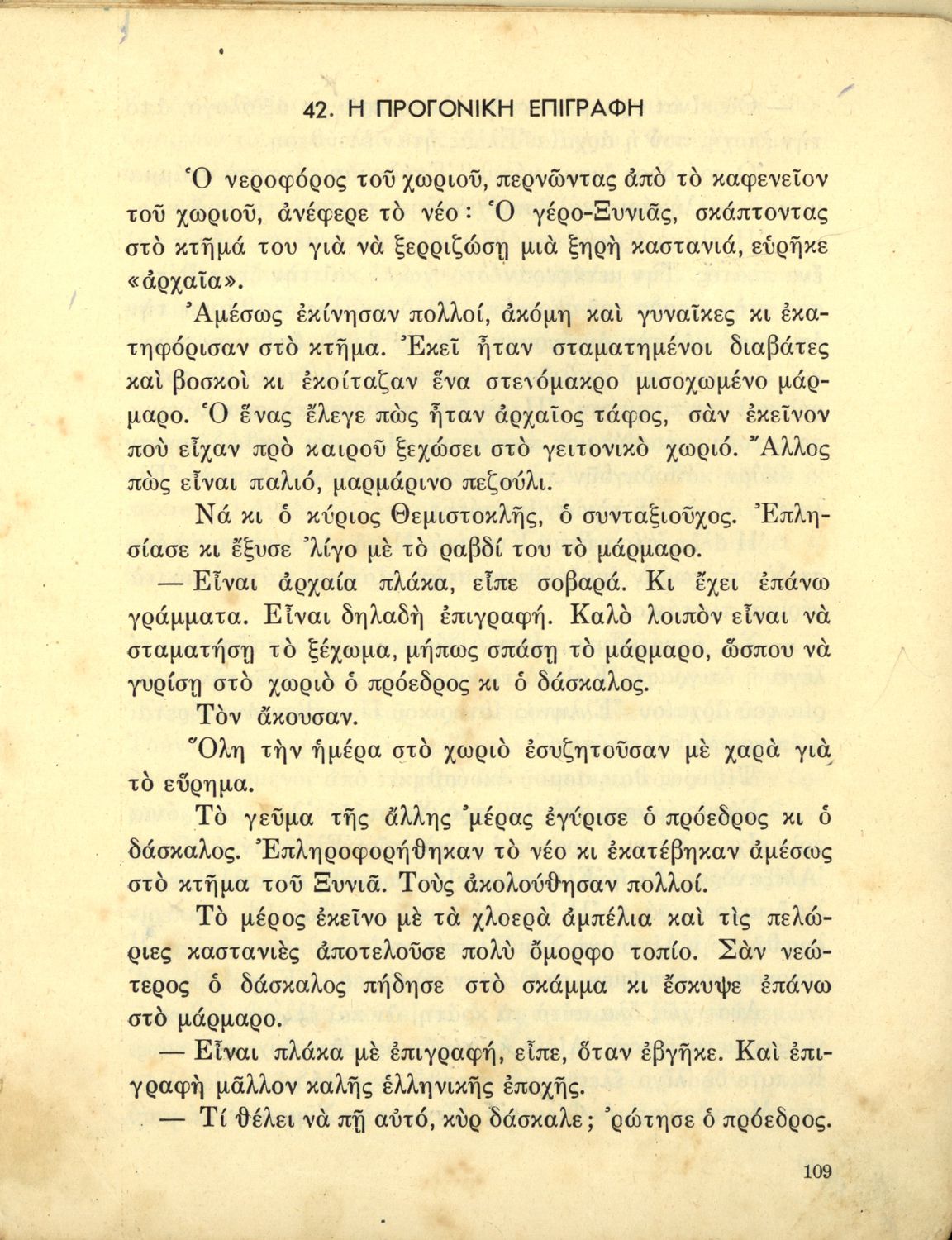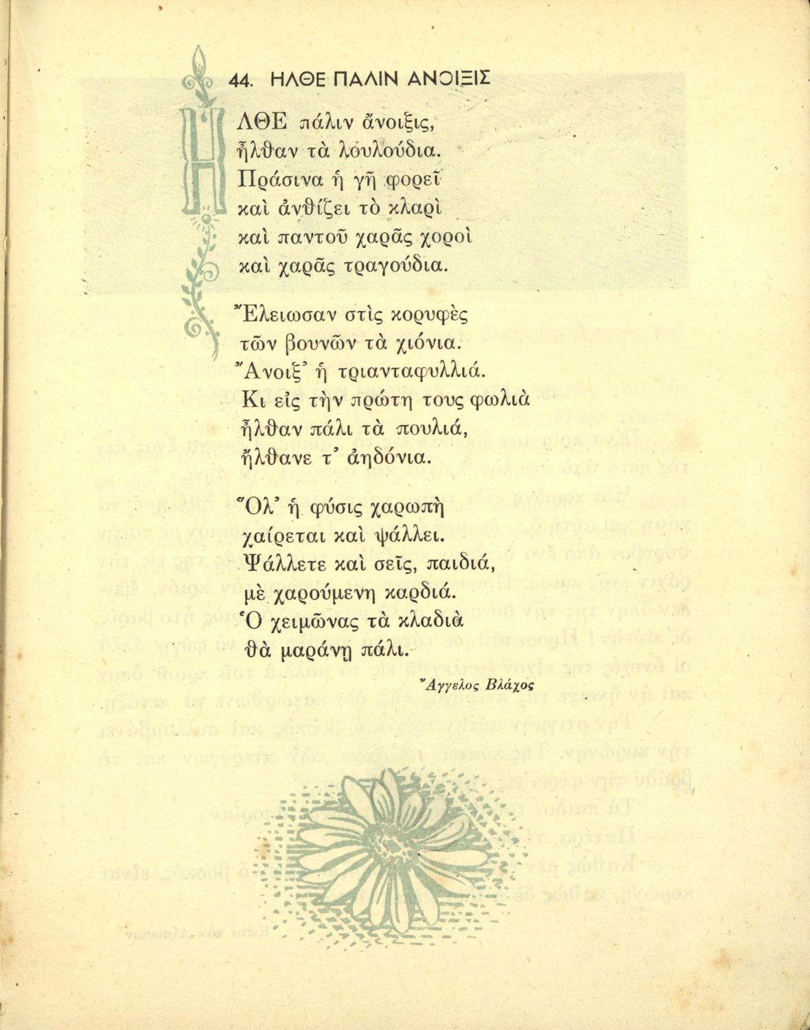 Αναγνωστικό Δ' Δημοτικού που είναι χωρισμένο σύμφωνα με τις εποχές του χρόνου και περιλαμβάνει ποιήματα και πεζά εμπνευσμένα από τη ζωή στην ύπαιθρο, την εθνική, οικογενειακή και κοινωνική ζωή, τη θρησκευτική παράδοση, τις ασχολίες των ανθρώπων, και την ελληνική φύση, ιστορία και μυθολογία.