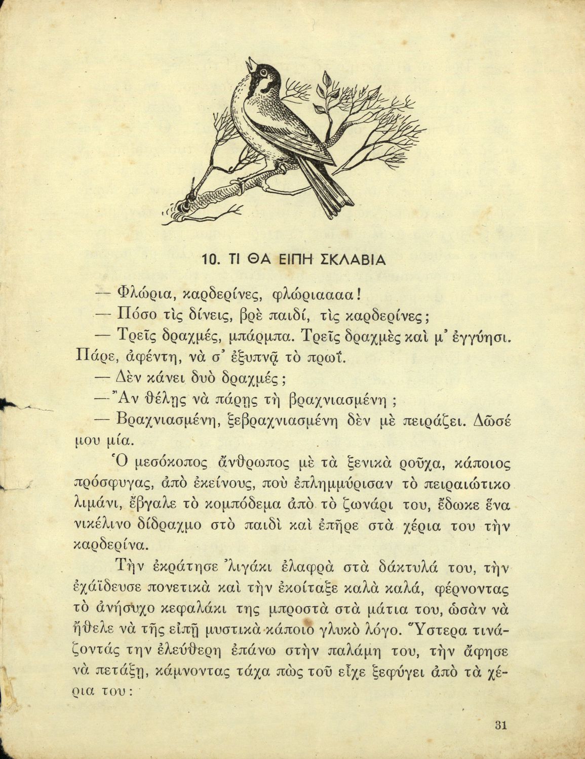 Αναγνωστικό Δ' Δημοτικού που είναι χωρισμένο σύμφωνα με τις εποχές του χρόνου και περιλαμβάνει ποιήματα και πεζά εμπνευσμένα από τη ζωή στην ύπαιθρο, την εθνική, οικογενειακή και κοινωνική ζωή, τη θρησκευτική παράδοση, τις ασχολίες των ανθρώπων, και την ελληνική φύση, ιστορία και μυθολογία.