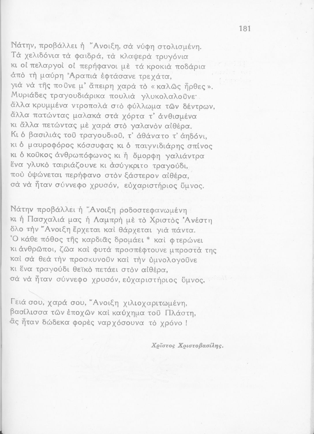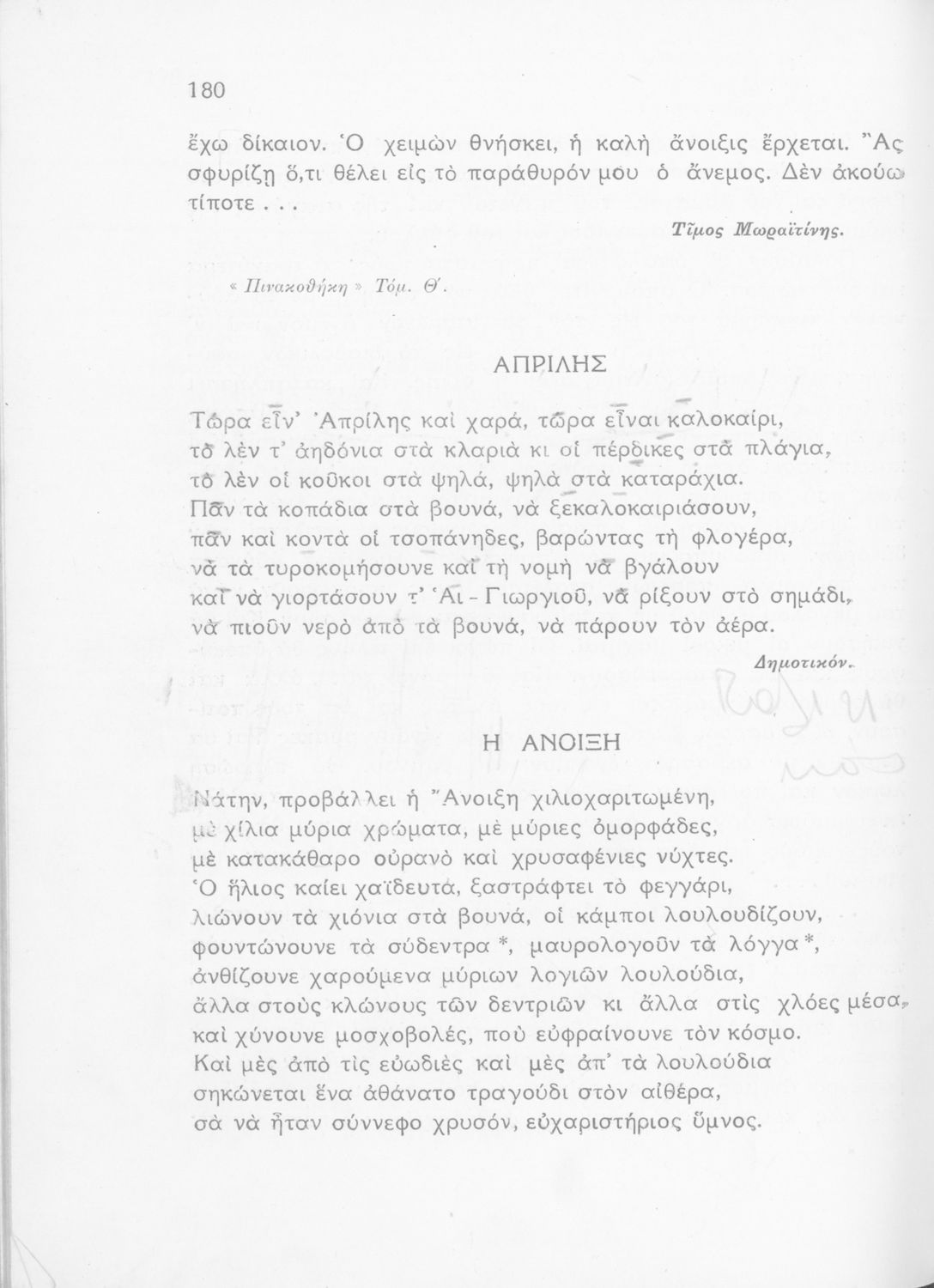 Σχολικό εγχειρίδιο Νέων Ελληνικών Γ΄ Γυμνασίου και Α' Αστικού Σχολείου που περιλαμβάνει ποιήματα και πεζά Ελλήνων συγγραφέων εμπνευσμένα από τη θρησκευτική ζωή, την αρχαία και νεώτερη ελληνική ιστορία, την οικογενειακή και κοινωνική ζωή και την ελληνική ύπαιθρο. Περιέχει και παράρτημα με βιογραφίες των συγγραφέων και λεξιλόγιο.