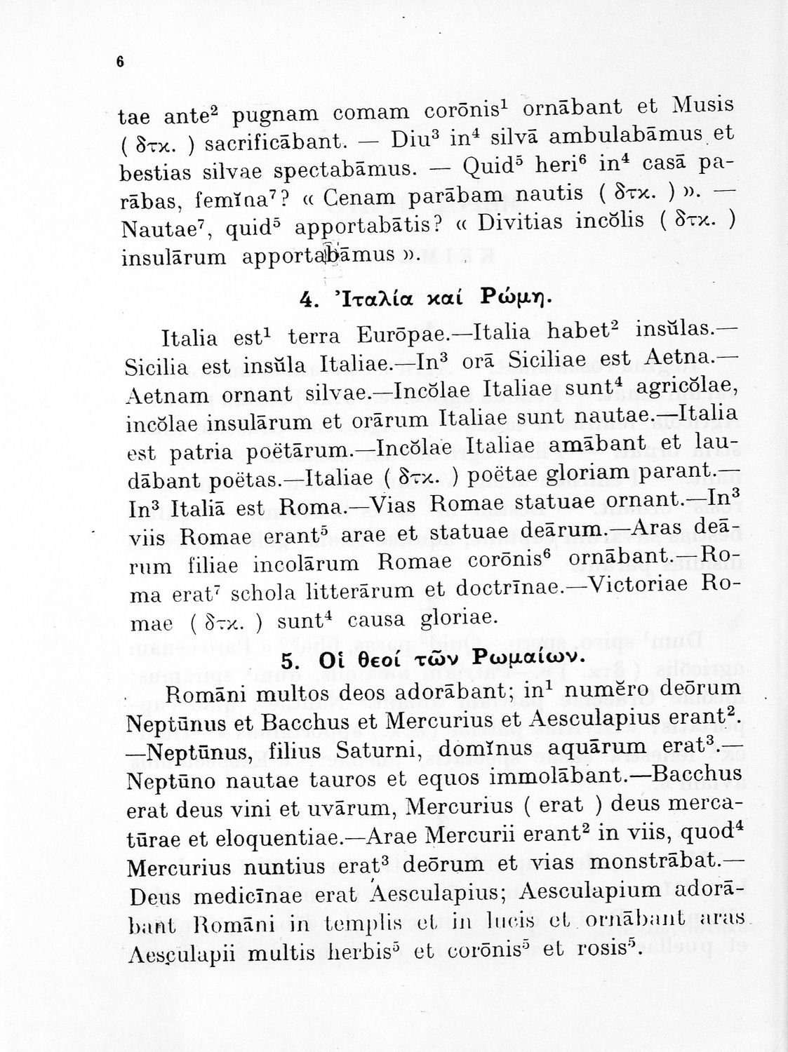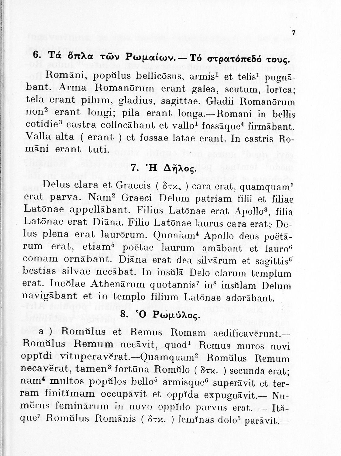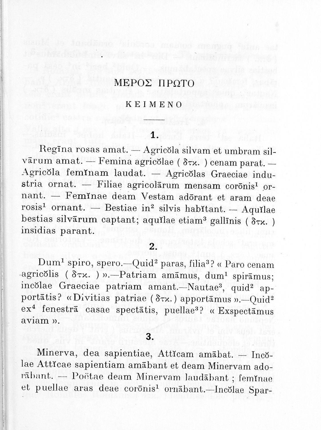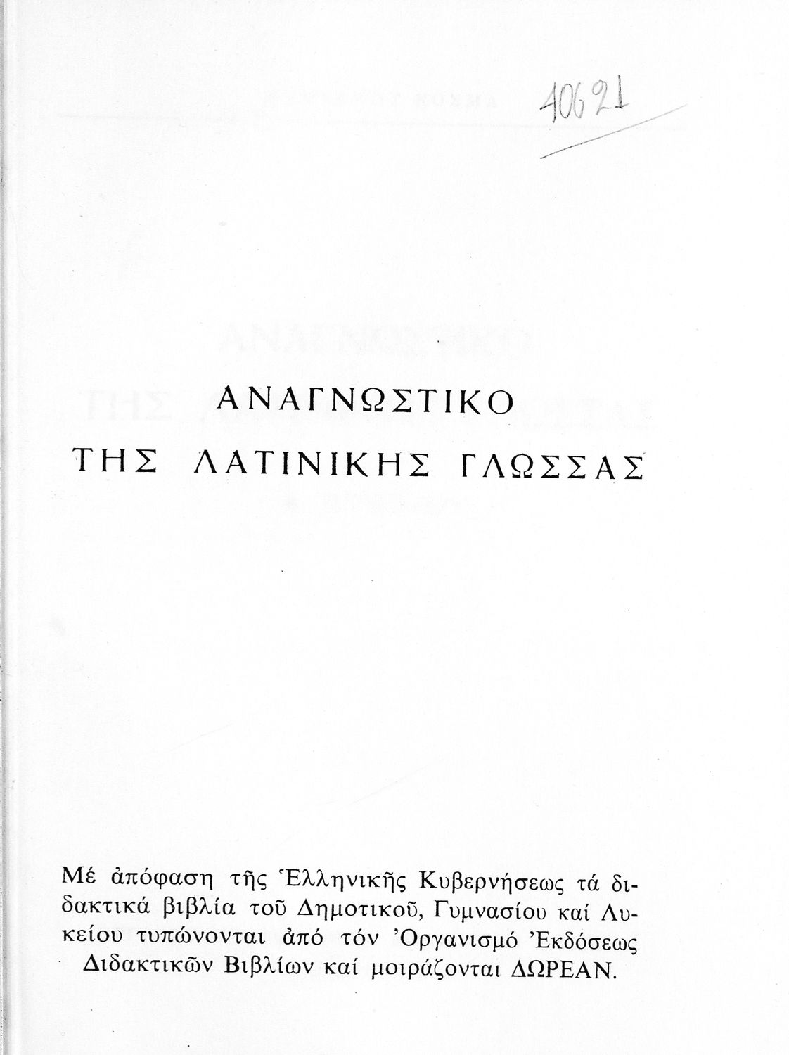 Σχολικό εγχειρίδιο Λατινικών Α΄, Β΄, Γ' Γυμνασίου που περιλαμβάνει γραμματική και συντακτικό και είναι χωρισμένο σε φθογγολογικό, τυπολογικό και ετυμολογικό μέρος.