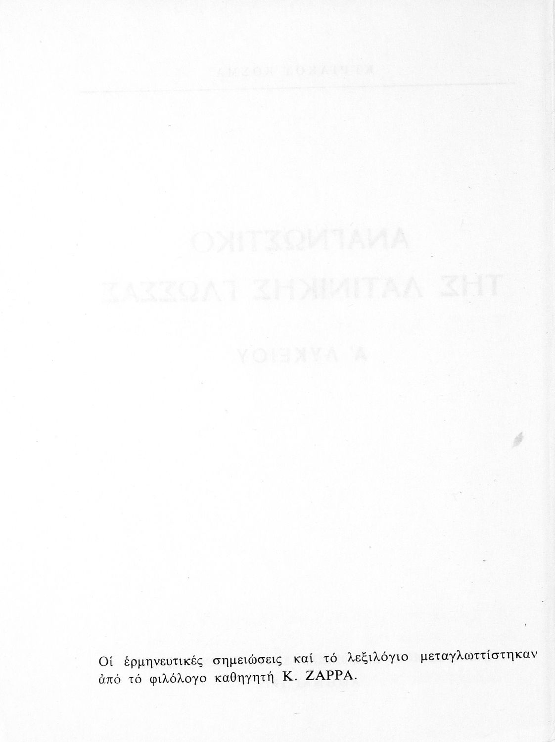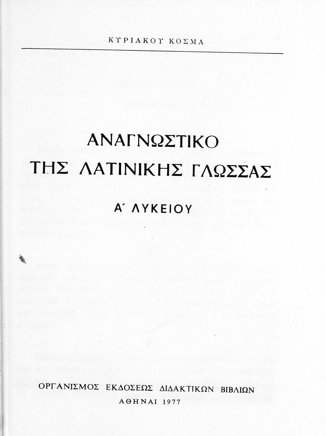 Σχολικό εγχειρίδιο Λατινικών Α΄, Β΄ και Γ΄ Λυκείου που περιλαμβάνει γραμματική και συντακτικό και είναι χωρισμένο σε φθογγολογικό, τυπολογικό και ετυμολογικό μέρος.