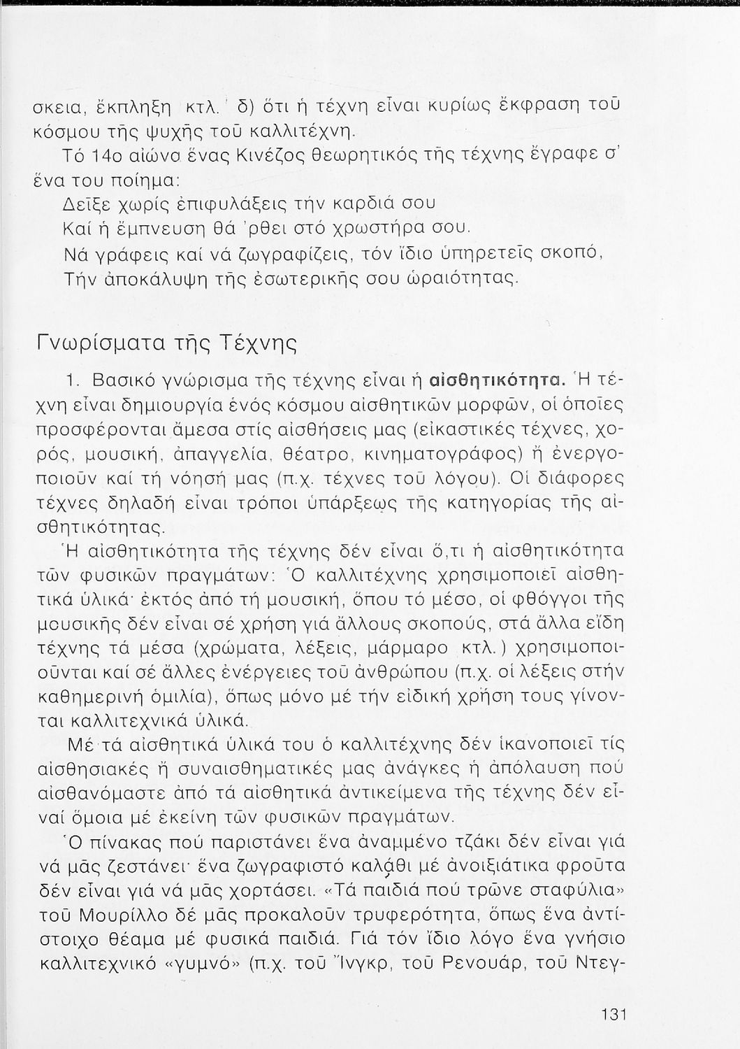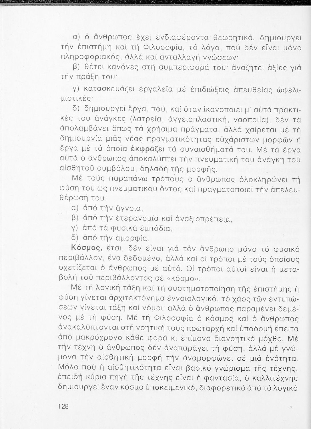 Σχολικό εγχειρίδιο Φιλοσοφίας Γ΄ Λυκείου που ακολουθεί μια ιστορική πραγμάτευση επιστημολογικών, ηθικών και αισθητικών ζητημάτων και καλύπτει δύο περιόδους: α) την ελληνική αρχαιότητα και β) την σύγχρονη ευρωπαϊκή σκέψη από τον Descartes και τον Kant στον λογικό θετικισμό και τον νεοκαντιανισμό. Περιέχει εκτενές κεφάλαιο για τους προσωκρατικούς.
