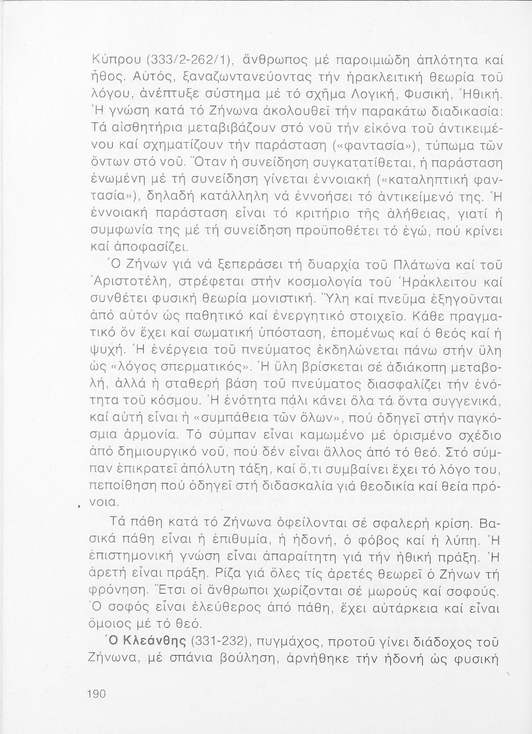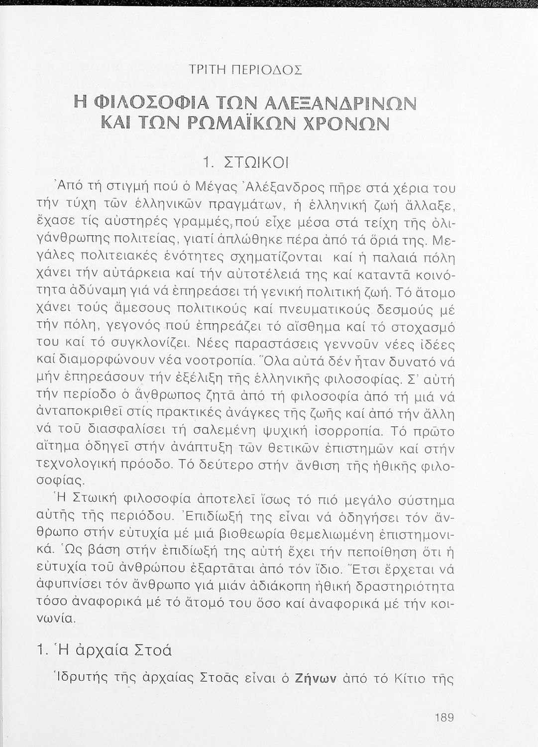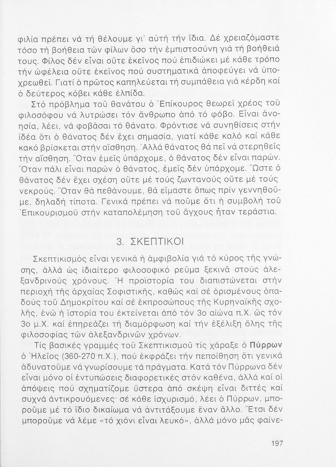 Σχολικό εγχειρίδιο Φιλοσοφίας Γ΄ Λυκείου που ακολουθεί μια ιστορική πραγμάτευση επιστημολογικών, ηθικών και αισθητικών ζητημάτων και καλύπτει δύο περιόδους: α) την ελληνική αρχαιότητα και β) την σύγχρονη ευρωπαϊκή σκέψη από τον Descartes και τον Kant στον λογικό θετικισμό και τον νεοκαντιανισμό. Περιέχει εκτενές κεφάλαιο για τους προσωκρατικούς.