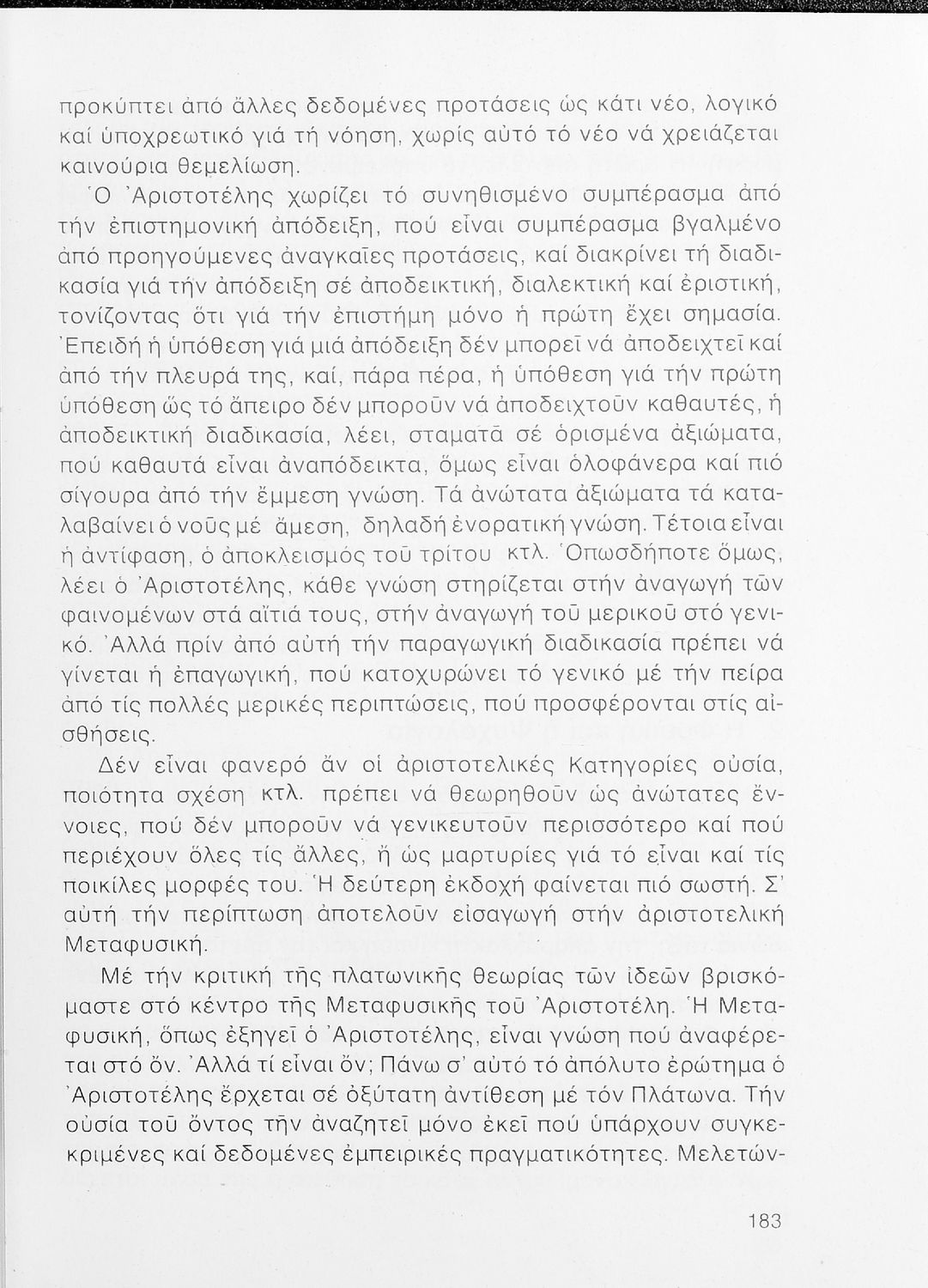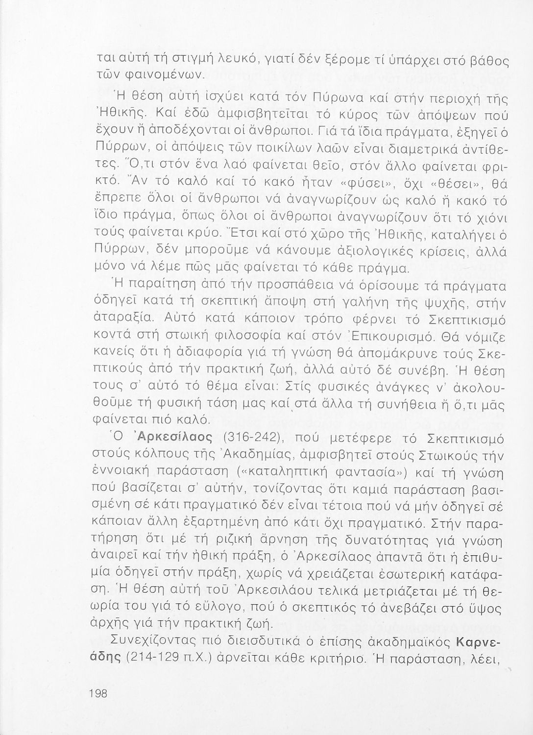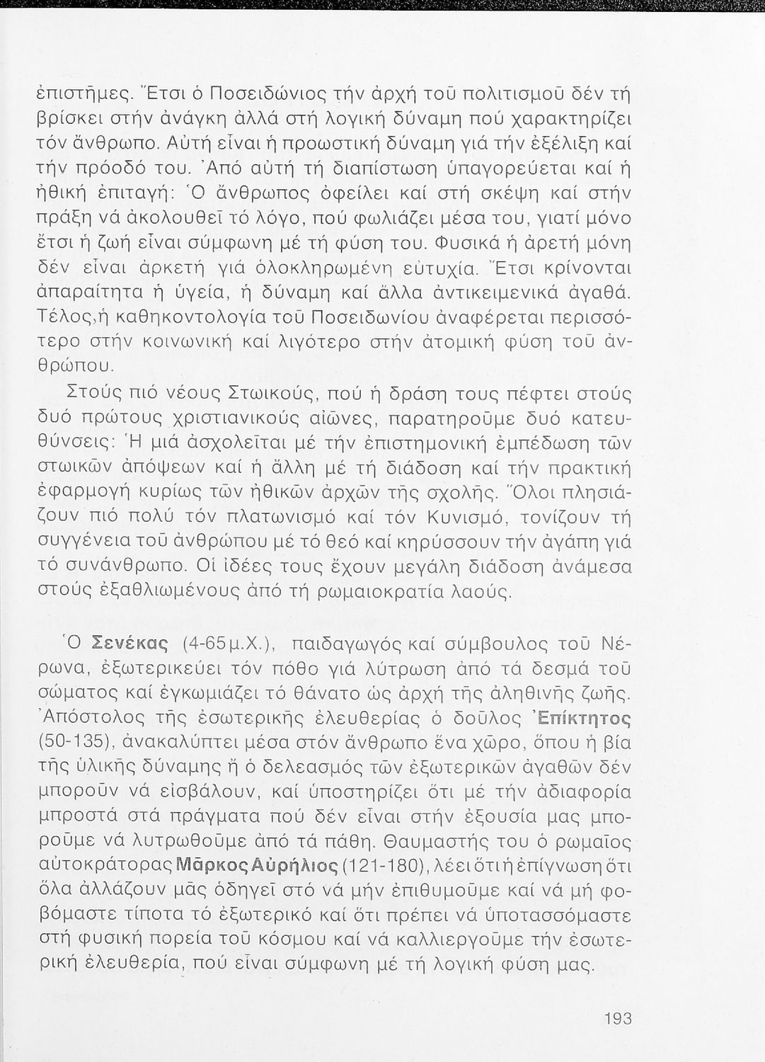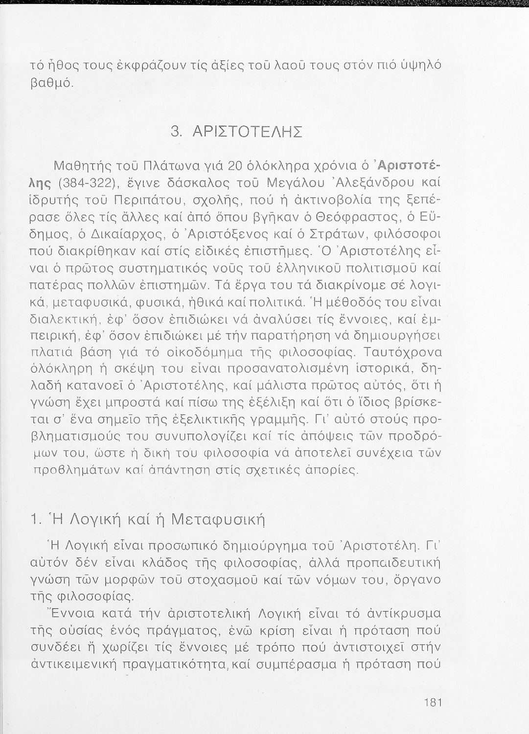 Σχολικό εγχειρίδιο Φιλοσοφίας Γ΄ Λυκείου που ακολουθεί μια ιστορική πραγμάτευση επιστημολογικών, ηθικών και αισθητικών ζητημάτων και καλύπτει δύο περιόδους: α) την ελληνική αρχαιότητα και β) την σύγχρονη ευρωπαϊκή σκέψη από τον Descartes και τον Kant στον λογικό θετικισμό και τον νεοκαντιανισμό. Περιέχει εκτενές κεφάλαιο για τους προσωκρατικούς.