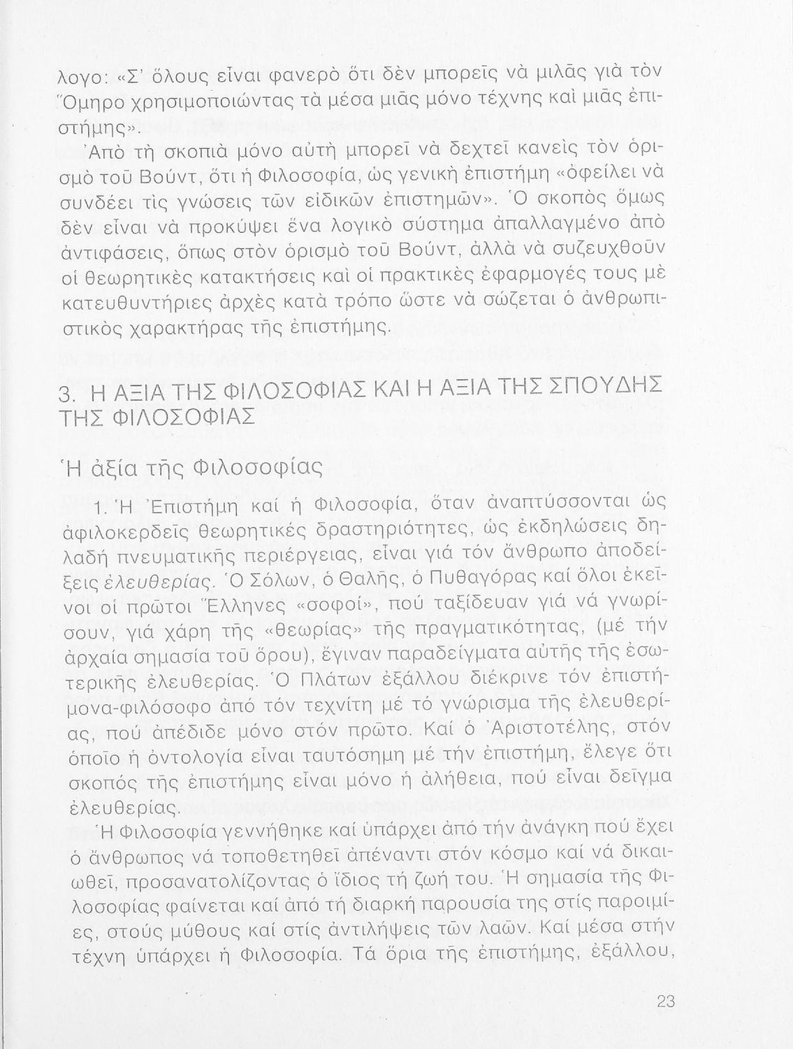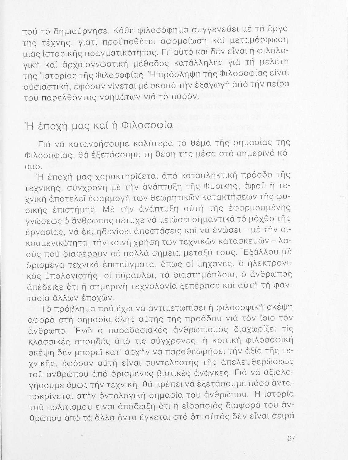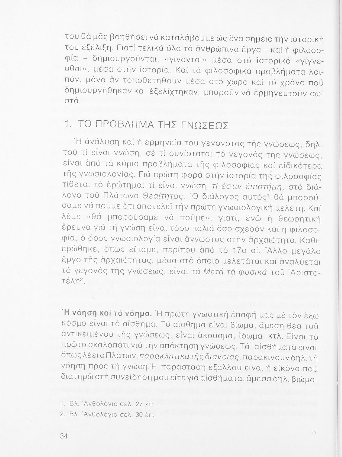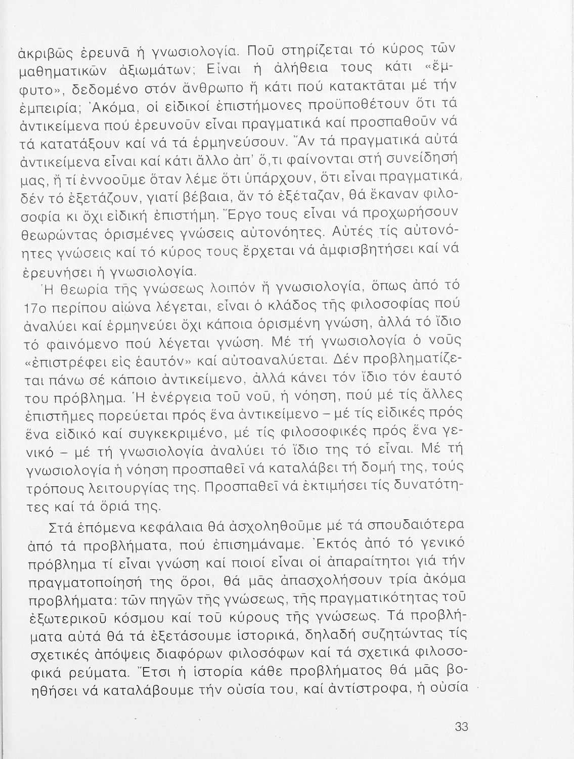 Σχολικό εγχειρίδιο Φιλοσοφίας Γ΄ Λυκείου που ακολουθεί μια ιστορική πραγμάτευση επιστημολογικών, ηθικών και αισθητικών ζητημάτων και καλύπτει δύο περιόδους: α) την ελληνική αρχαιότητα και β) την σύγχρονη ευρωπαϊκή σκέψη από τον Descartes και τον Kant στον λογικό θετικισμό και τον νεοκαντιανισμό. Περιέχει εκτενές κεφάλαιο για τους προσωκρατικούς.