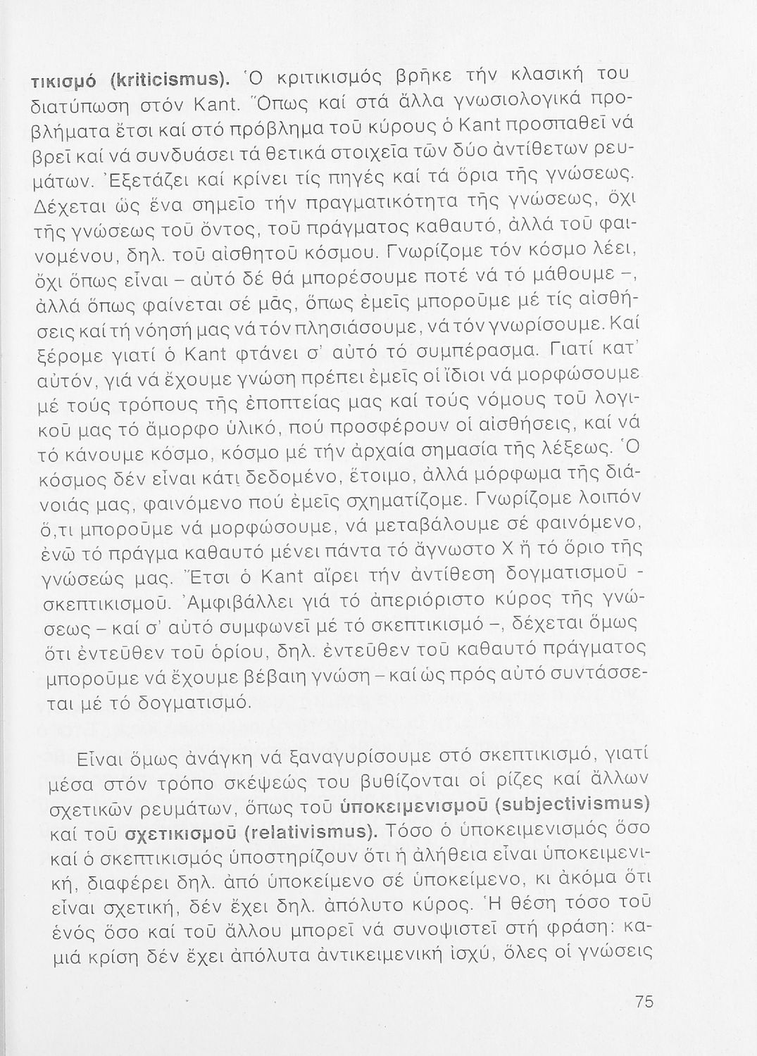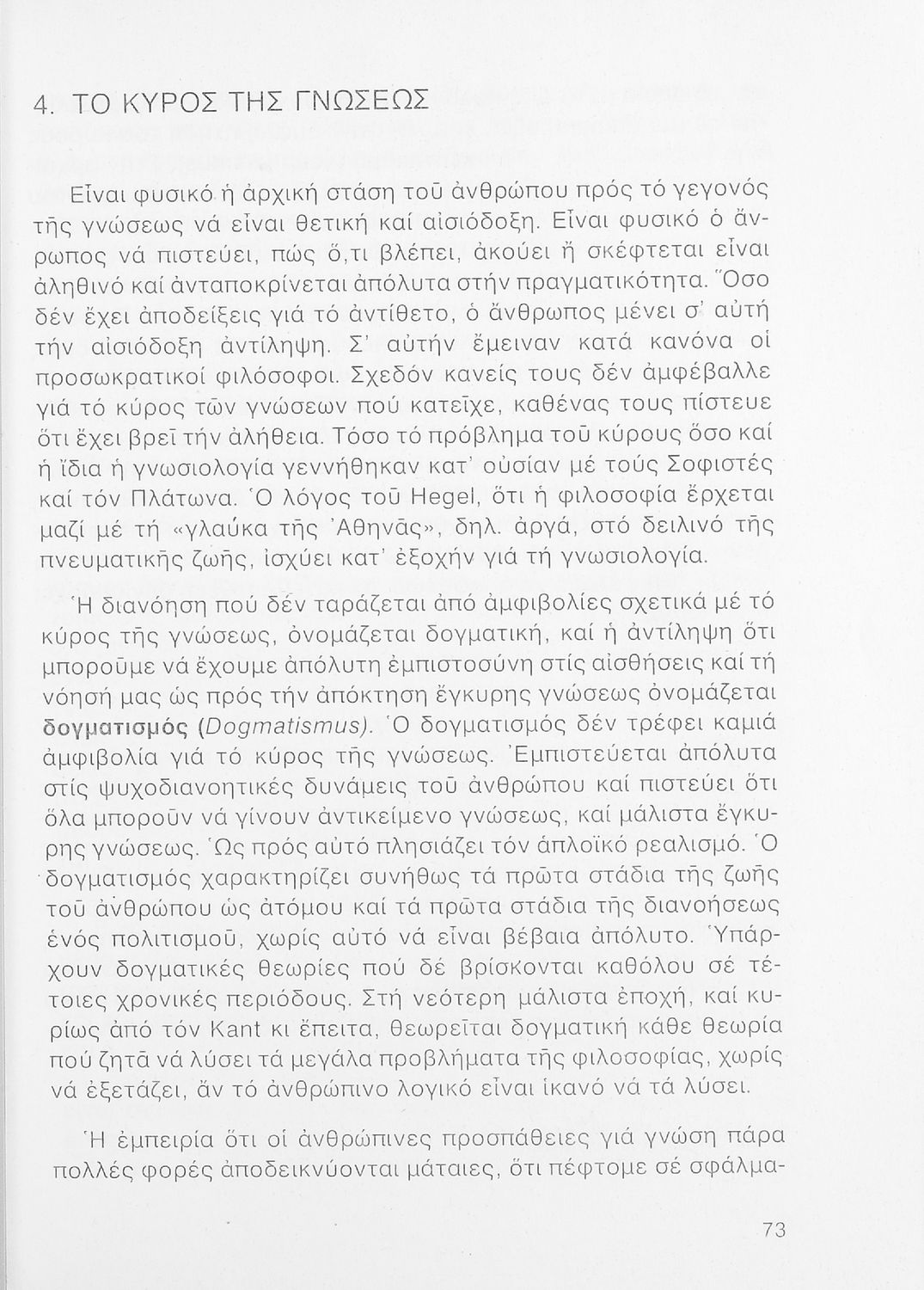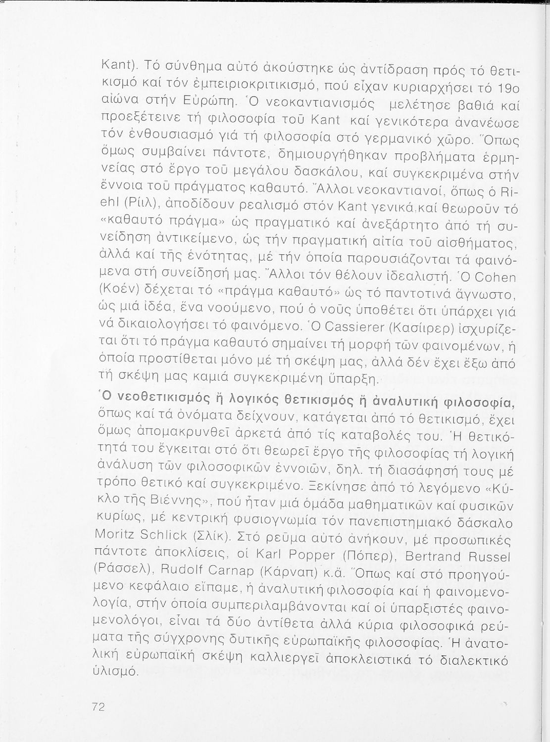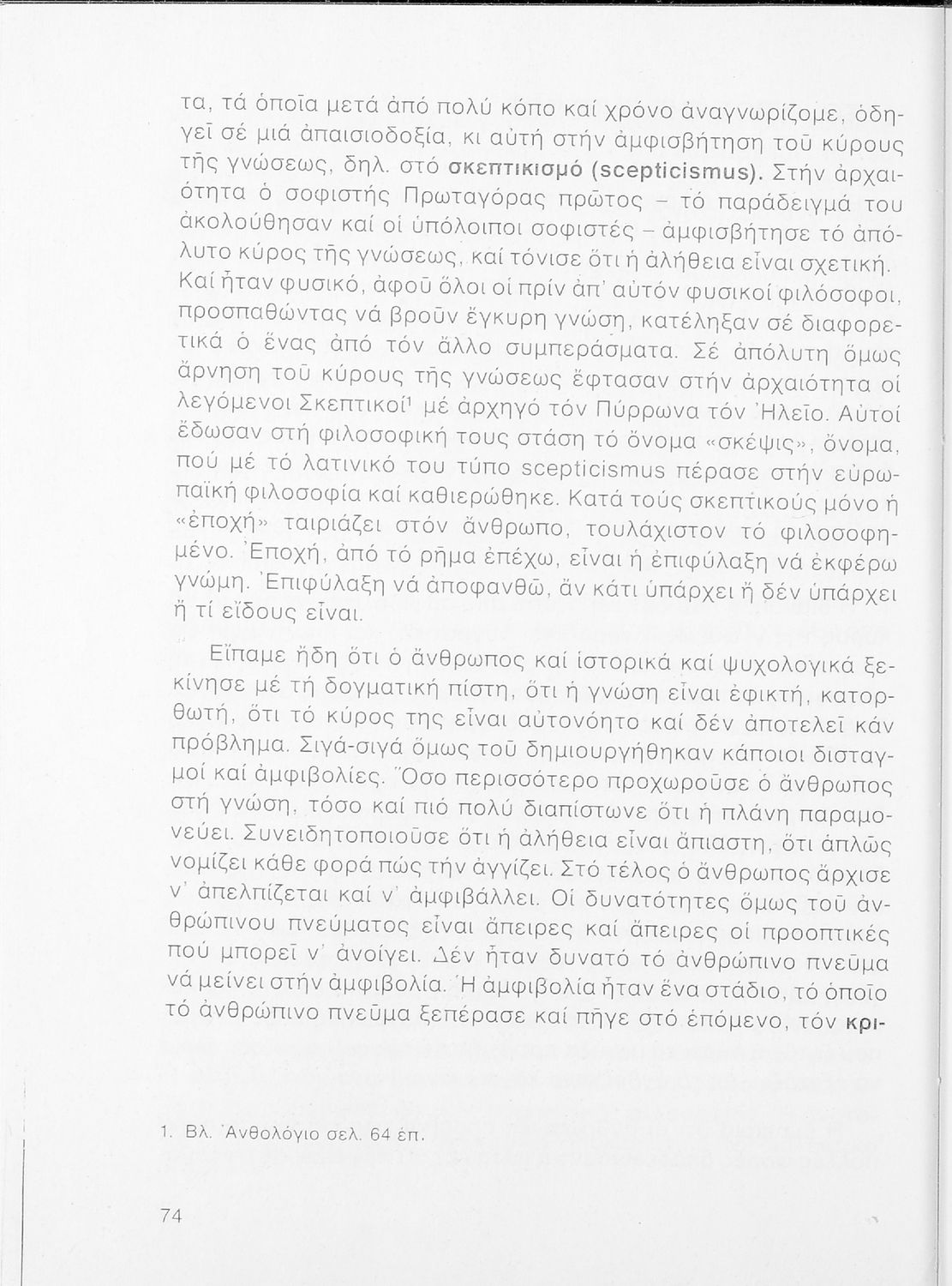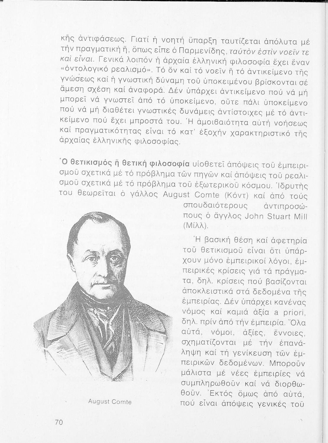Σχολικό εγχειρίδιο Φιλοσοφίας Γ΄ Λυκείου που ακολουθεί μια ιστορική πραγμάτευση επιστημολογικών, ηθικών και αισθητικών ζητημάτων και καλύπτει δύο περιόδους: α) την ελληνική αρχαιότητα και β) την σύγχρονη ευρωπαϊκή σκέψη από τον Descartes και τον Kant στον λογικό θετικισμό και τον νεοκαντιανισμό. Περιέχει εκτενές κεφάλαιο για τους προσωκρατικούς.