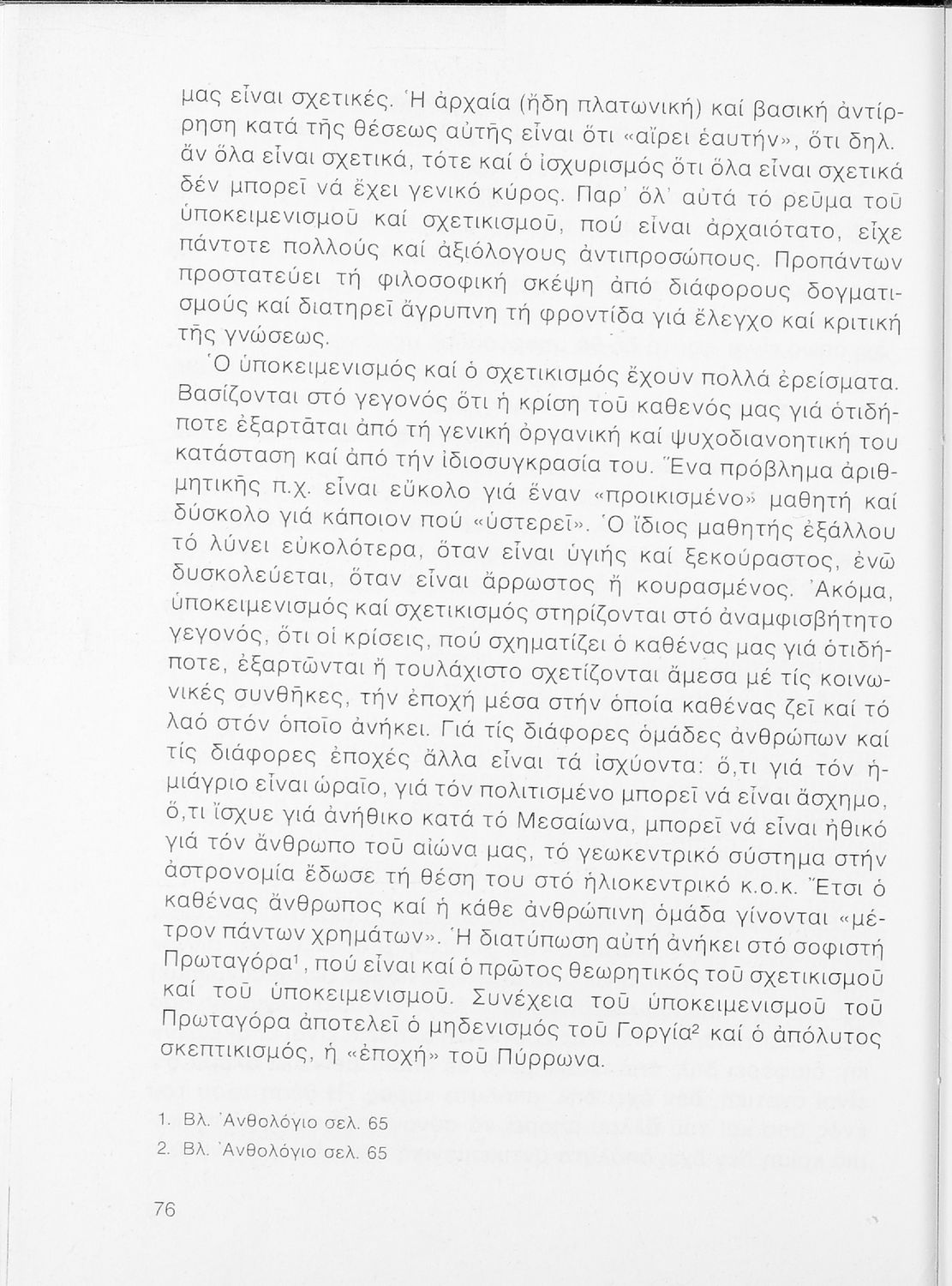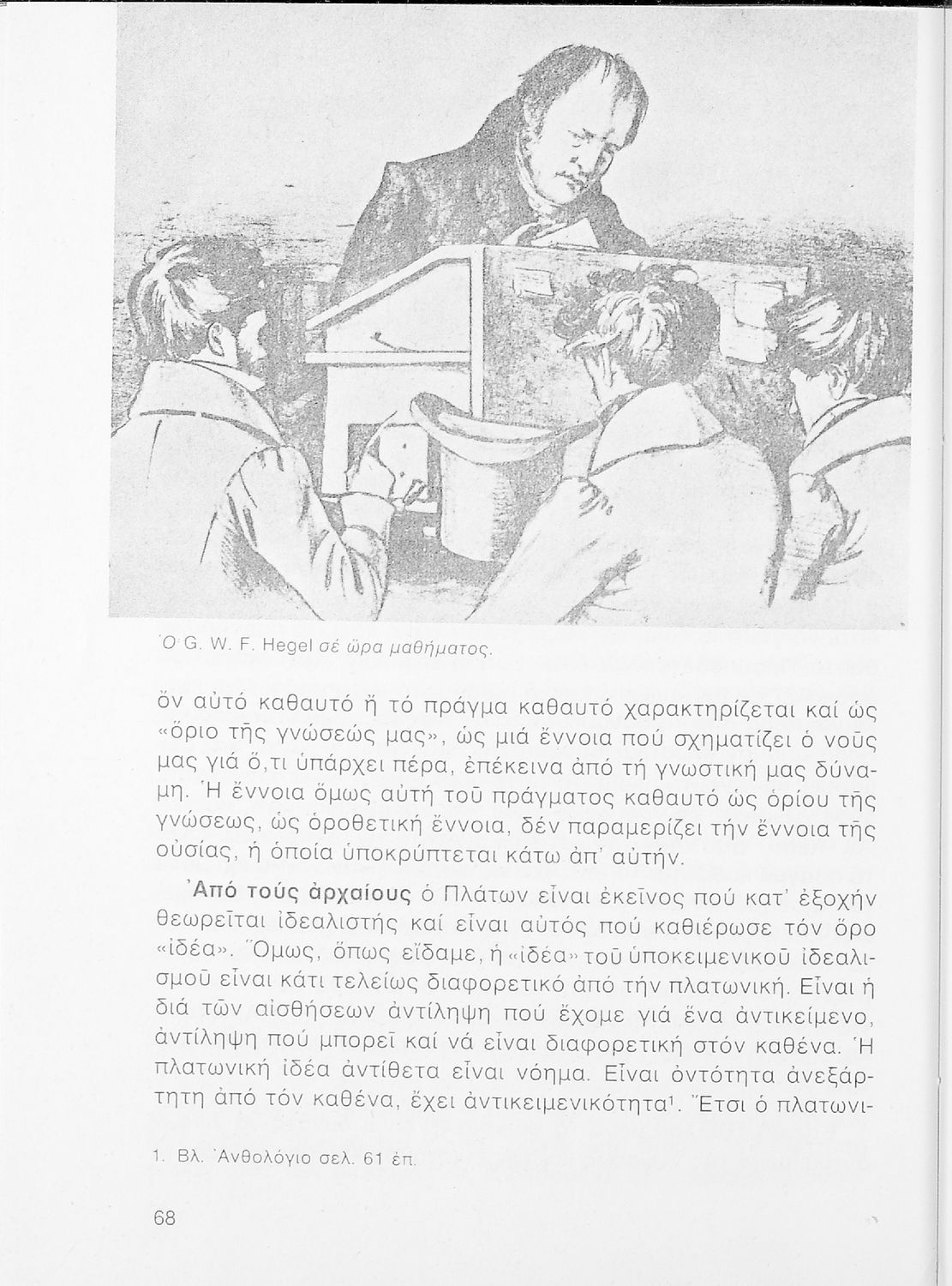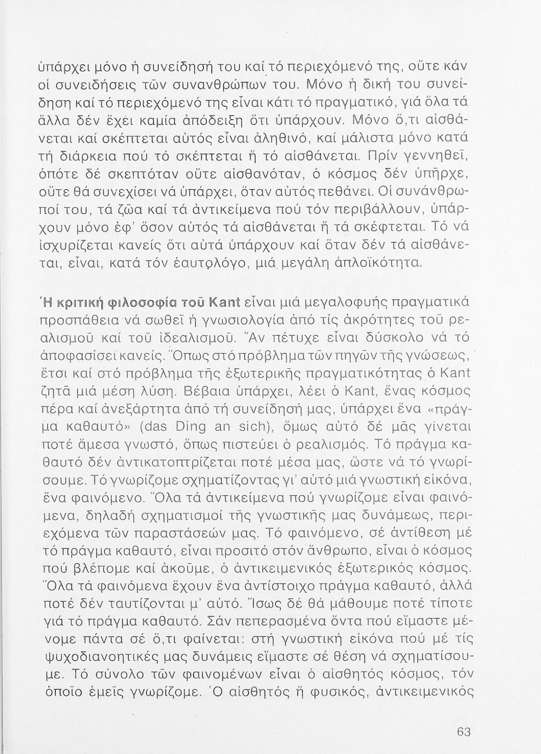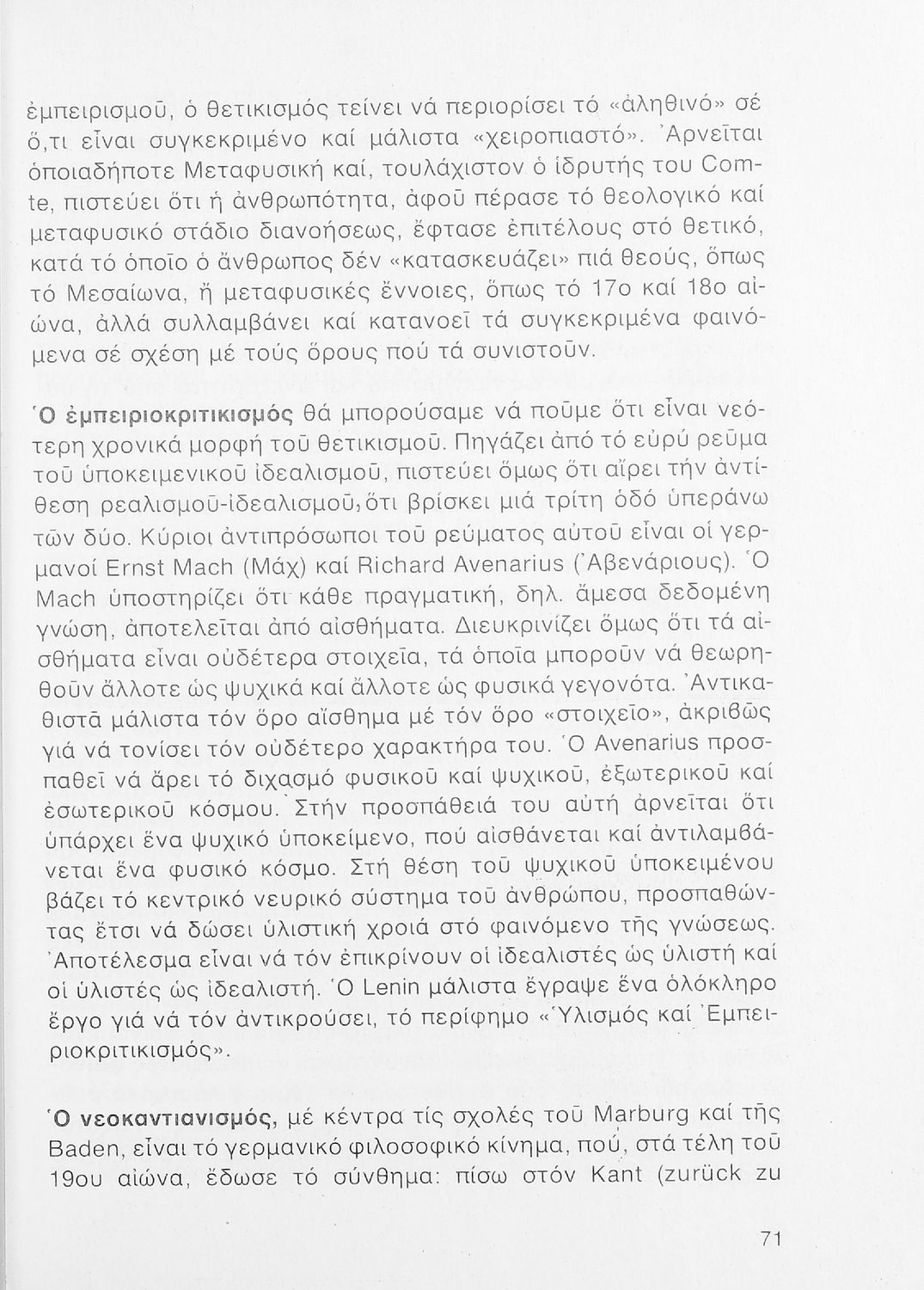 Σχολικό εγχειρίδιο Φιλοσοφίας Γ΄ Λυκείου που ακολουθεί μια ιστορική πραγμάτευση επιστημολογικών, ηθικών και αισθητικών ζητημάτων και καλύπτει δύο περιόδους: α) την ελληνική αρχαιότητα και β) την σύγχρονη ευρωπαϊκή σκέψη από τον Descartes και τον Kant στον λογικό θετικισμό και τον νεοκαντιανισμό. Περιέχει εκτενές κεφάλαιο για τους προσωκρατικούς.