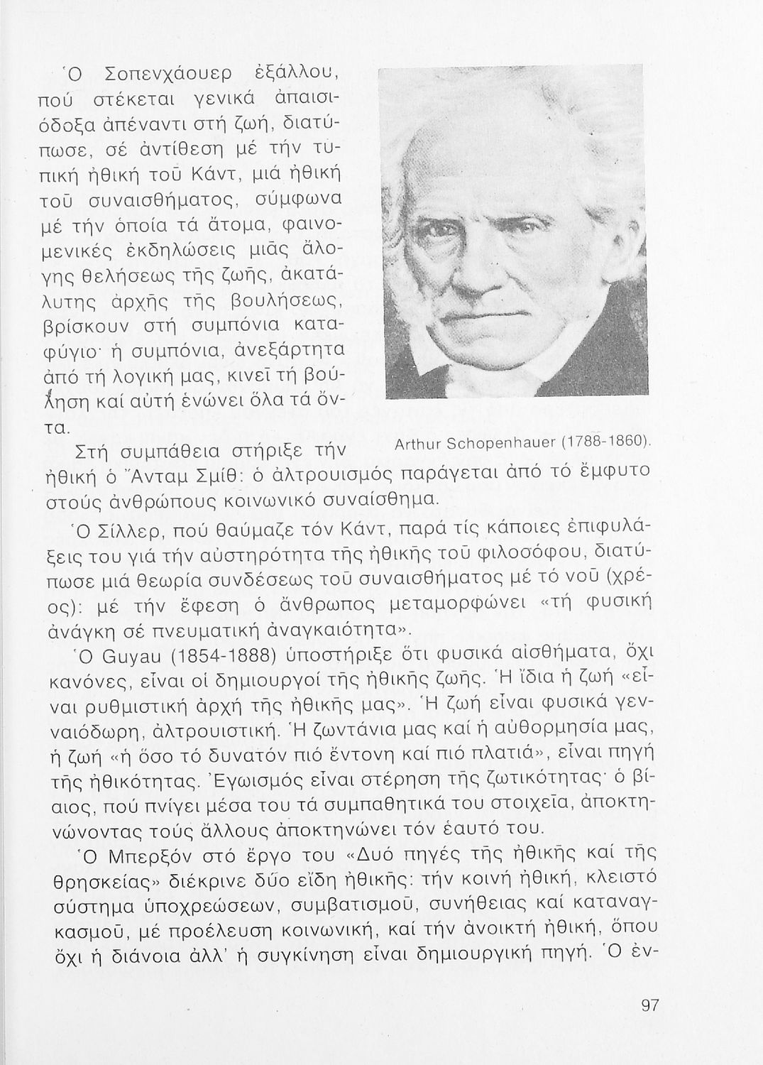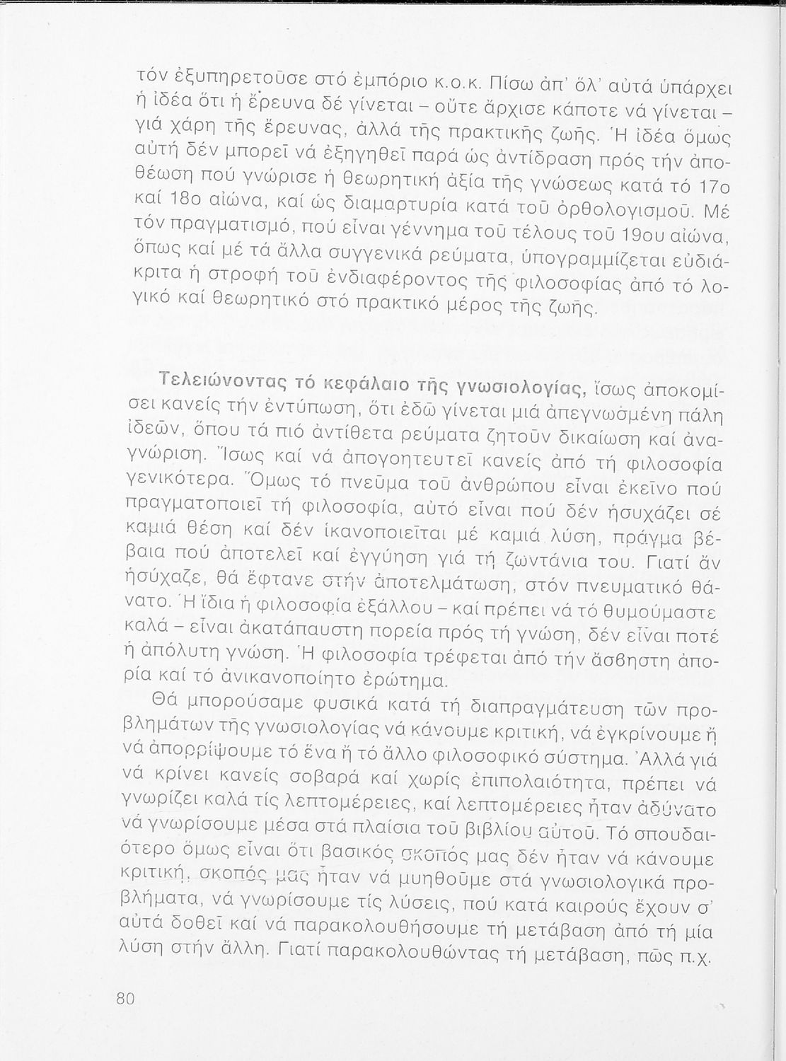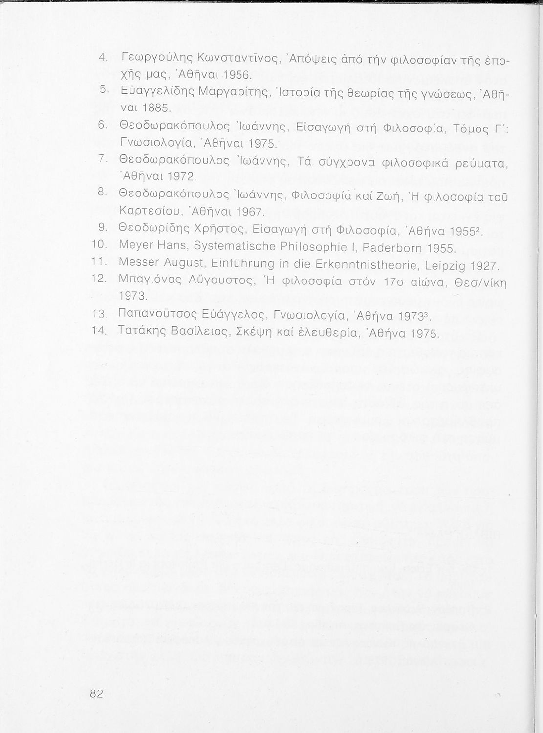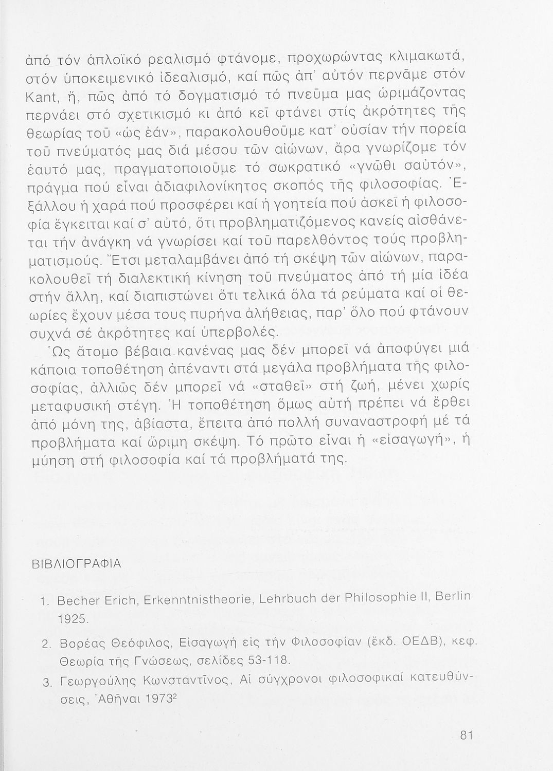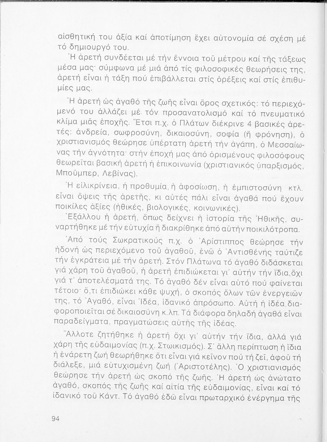 Σχολικό εγχειρίδιο Φιλοσοφίας Γ΄ Λυκείου που ακολουθεί μια ιστορική πραγμάτευση επιστημολογικών, ηθικών και αισθητικών ζητημάτων και καλύπτει δύο περιόδους: α) την ελληνική αρχαιότητα και β) την σύγχρονη ευρωπαϊκή σκέψη από τον Descartes και τον Kant στον λογικό θετικισμό και τον νεοκαντιανισμό. Περιέχει εκτενές κεφάλαιο για τους προσωκρατικούς.