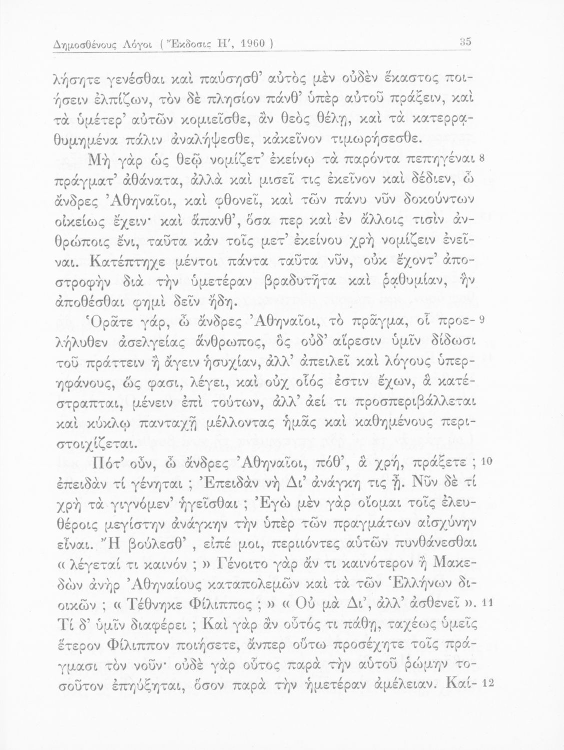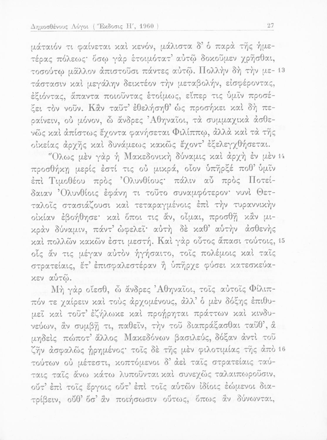 Σχολικό εγχειρίδιο Αρχαίων Ελληνικών Γυμνασίου που περιέχει τους Ολυνθιακούς Α΄ και Β΄ και τους Φιλιππικούς Α΄ και Β΄ του Δημοσθένη, το Λόγο κατά Λεωκράτους του Λυκούργου και τις Επιστολές προς Φίλιππο του Ισοκράτη, και ερμηνευτικά και ετυμολογικά σχόλια.