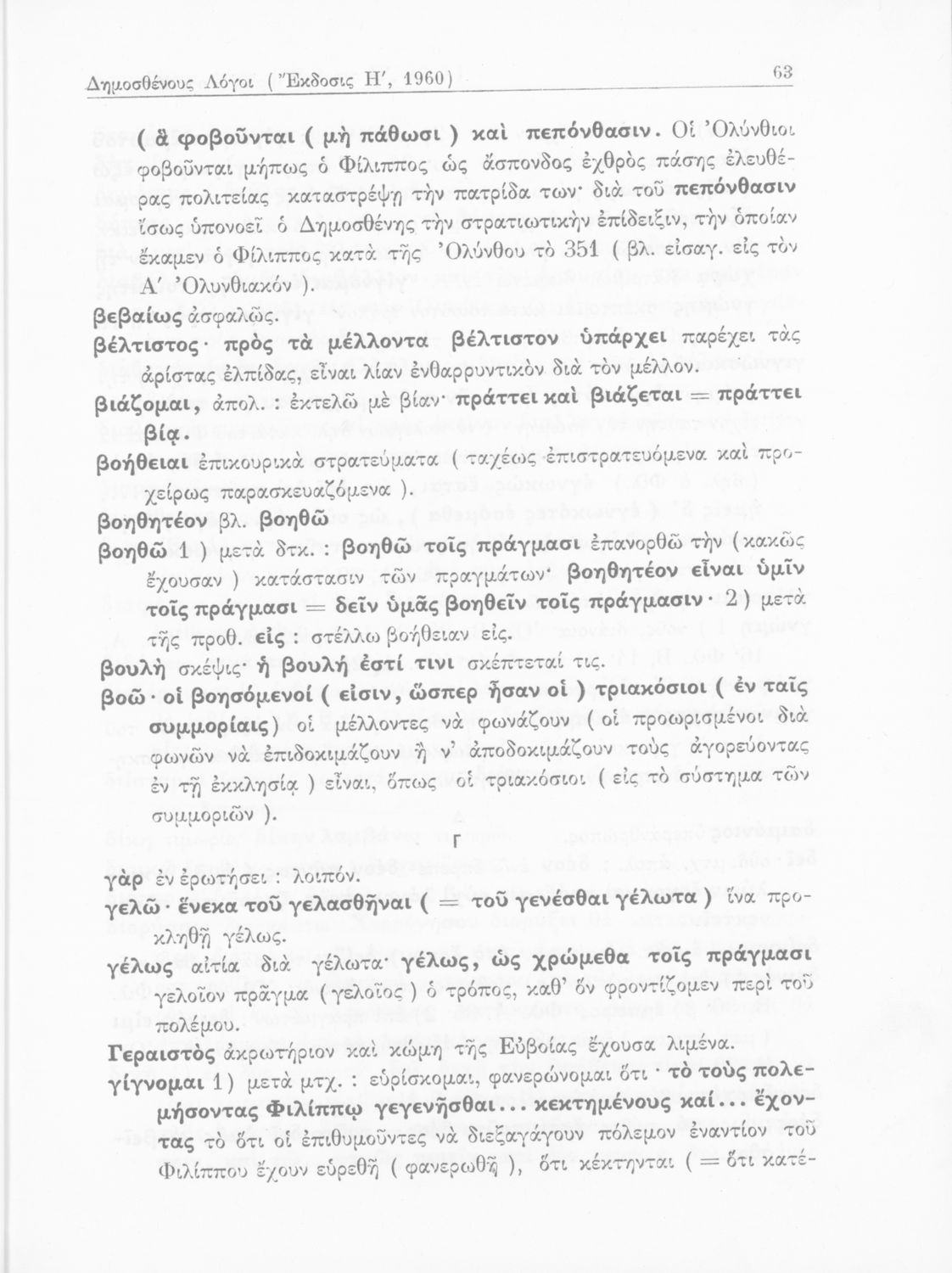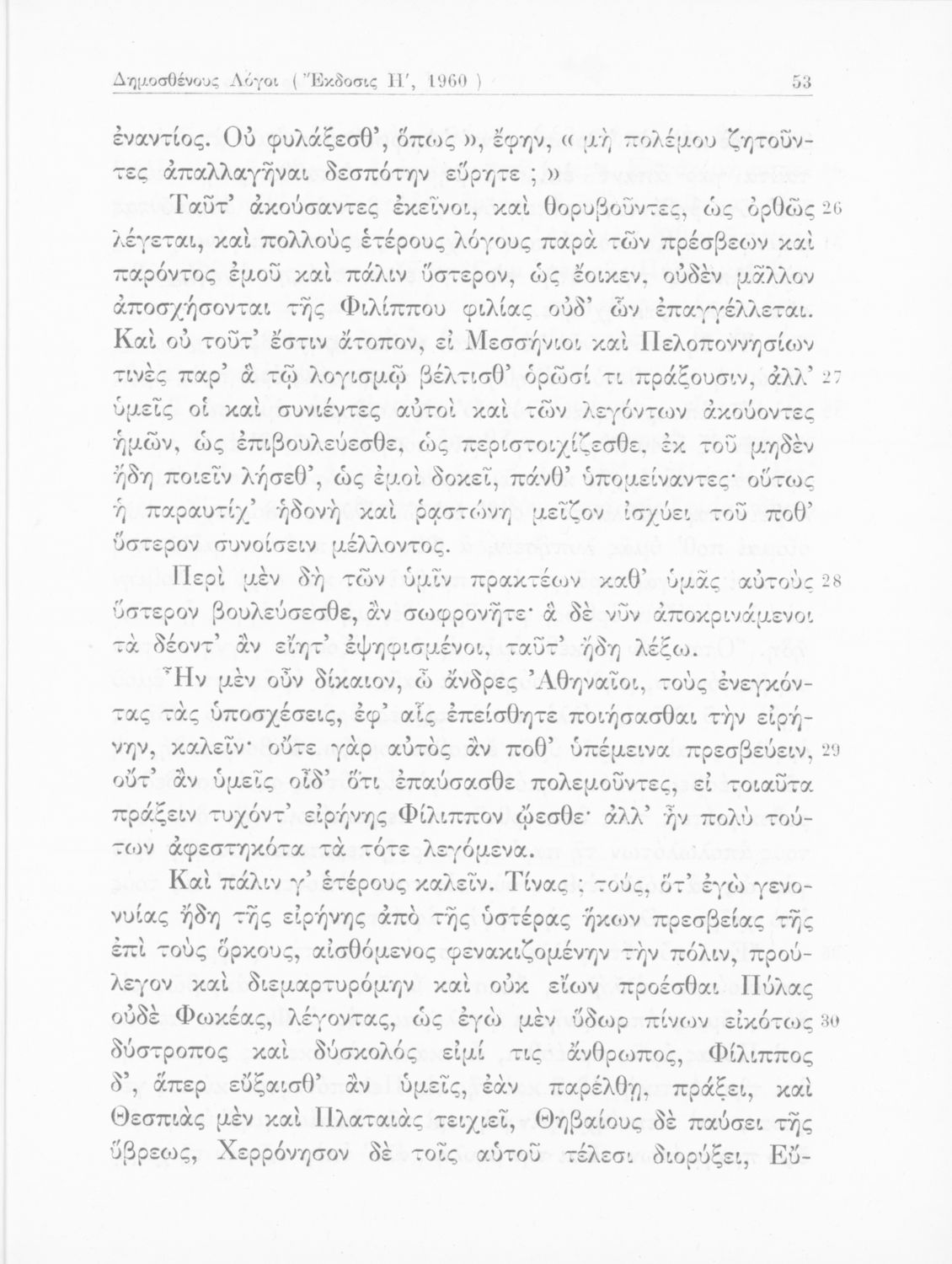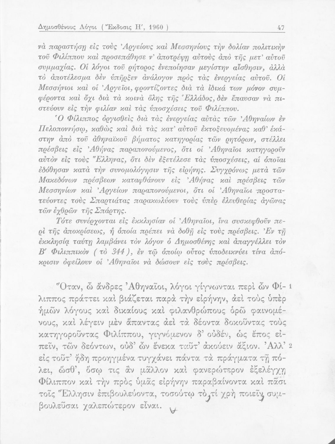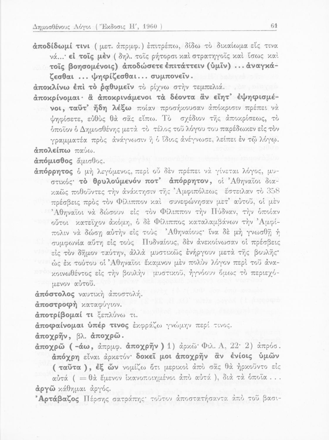 Σχολικό εγχειρίδιο Αρχαίων Ελληνικών Γυμνασίου που περιέχει τους Ολυνθιακούς Α΄ και Β΄ και τους Φιλιππικούς Α΄ και Β΄ του Δημοσθένη, το Λόγο κατά Λεωκράτους του Λυκούργου και τις Επιστολές προς Φίλιππο του Ισοκράτη, και ερμηνευτικά και ετυμολογικά σχόλια.
