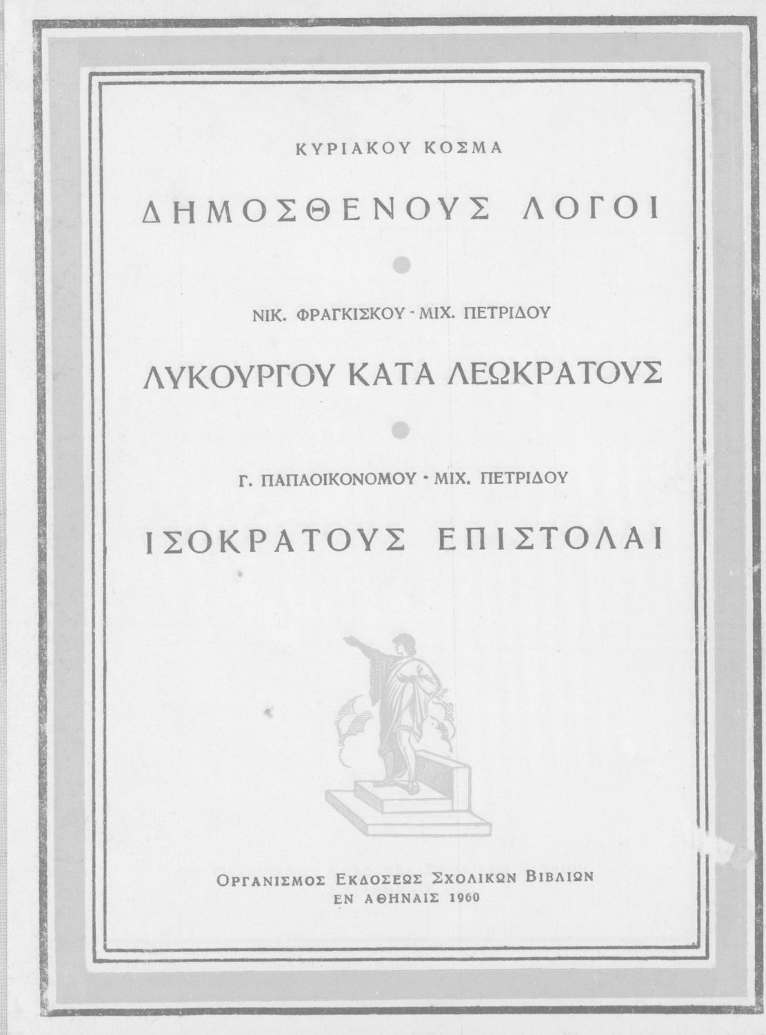 Βαθμίδα εκπαίδευσης: Δευτεροβάθμια Τάξη: Γυμνάσιο Μάθημα: Αρχαία Ελληνικά Γλώσσα: Απλή καθαρεύουσα Παρουσίαση περιεχομένου: Σχολικό εγχειρίδιο Αρχαίων Ελληνικών Γυμνασίου που περιέχει τους Ολυνθιακούς Α΄ και Β΄ και τους Φιλιππικούς Α΄ και Β΄ του Δημοσθένη, το Λόγο κατά Λεωκράτους του Λυκούργου και τις Επιστολές προς Φίλιππο του Ισοκράτη, και ερμηνευτικά και ετυμολογικά σχόλια. |