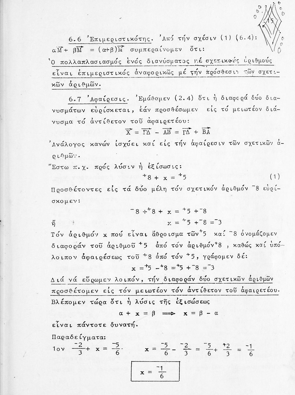 Σχολικό εγχειρίδιο Μαθηματικών Β΄ Γυμνασίου χωρισμένο σε θεωρία και ασκήσεις. Φέρει το σύμβολο της δικτατορίας.
