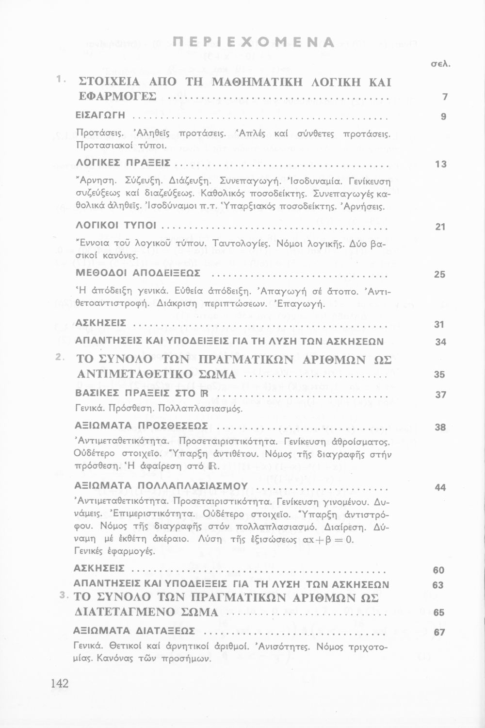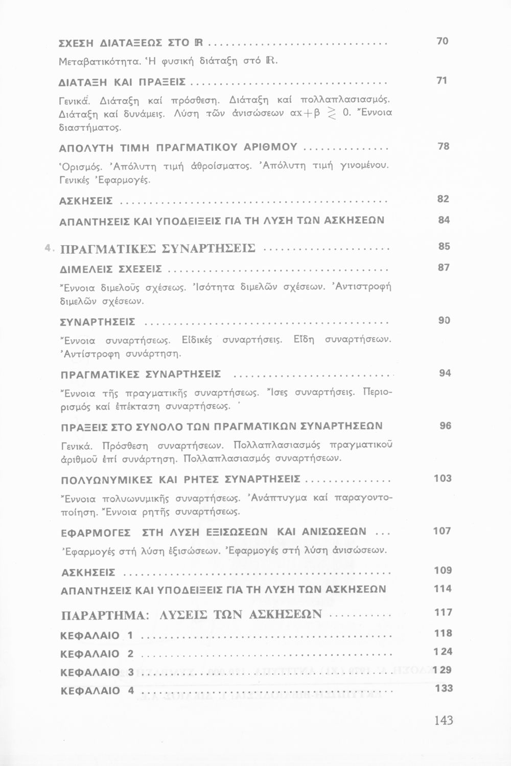 Σχολικό εγχειρίδιο Άλγεβρας Α΄ Λυκείου που είναι χωρισμένο σε αξιώματα, πορίσματα, παραδείγματα και ασκήσεις και εστιάζει στις συναρτήσεις, τις εξισώσεις και τις αριθμητικές πράξεις. Περιλαμβάνει στοιχεία Μαθηματικής Λογικής και αποδείξεων και παράρτημα με τις λύσεις των ασκήσεων.