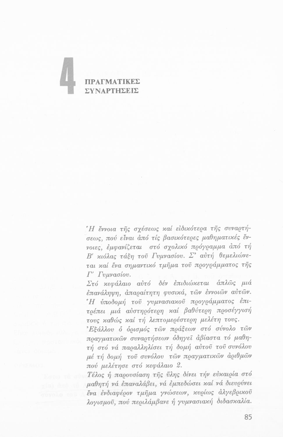 Σχολικό εγχειρίδιο Άλγεβρας Α΄ Λυκείου που είναι χωρισμένο σε αξιώματα, πορίσματα, παραδείγματα και ασκήσεις και εστιάζει στις συναρτήσεις, τις εξισώσεις και τις αριθμητικές πράξεις. Περιλαμβάνει στοιχεία Μαθηματικής Λογικής και αποδείξεων και παράρτημα με τις λύσεις των ασκήσεων.
