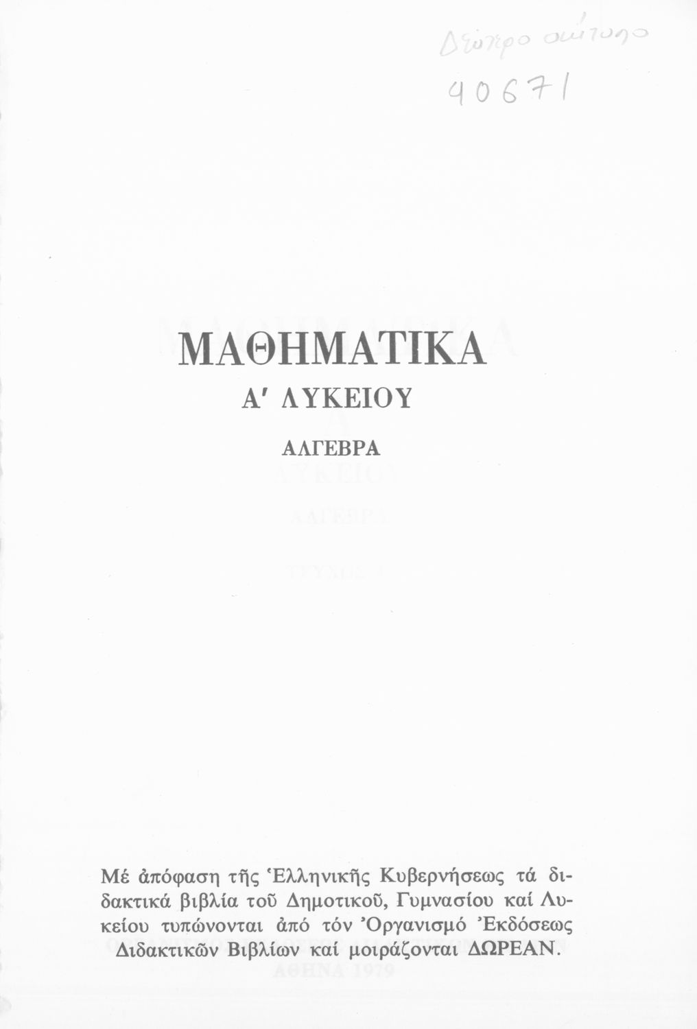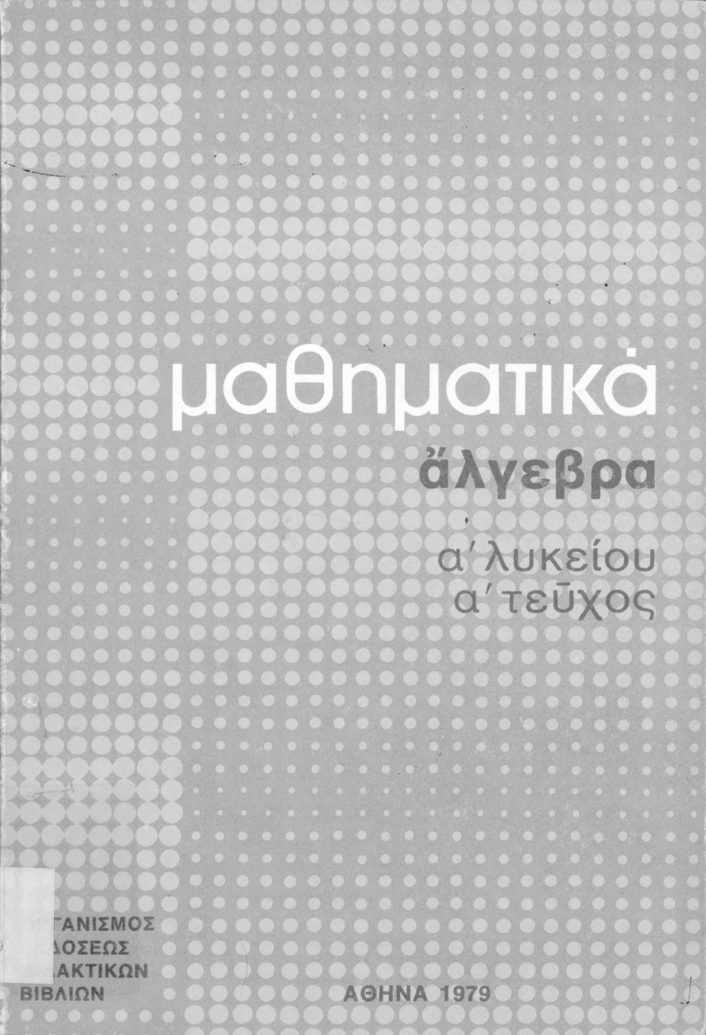 Σχολικό εγχειρίδιο Άλγεβρας Α΄ Λυκείου που είναι χωρισμένο σε αξιώματα, πορίσματα, παραδείγματα και ασκήσεις και εστιάζει στις συναρτήσεις και τις εξισώσεις. Περιέχει παράρτημα με τις λύσεις των ασκήσεων.