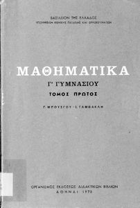 Βαθμίδα εκπαίδευσης: Δευτεροβάθμια Τάξη: Γ' Γυμνασίου Μάθημα: Μαθηματικά Γλώσσα: Απλή καθαρεύουσα Παρουσίαση περιεχομένου: Σχολικό εγχειρίδιο Μαθηματικών Γ΄ Γυμνασίου που περιλαμβάνει θεωρία, παραδείγματα και ασκήσεις. Φέρει το σύμβολο της δικτατορίας. |