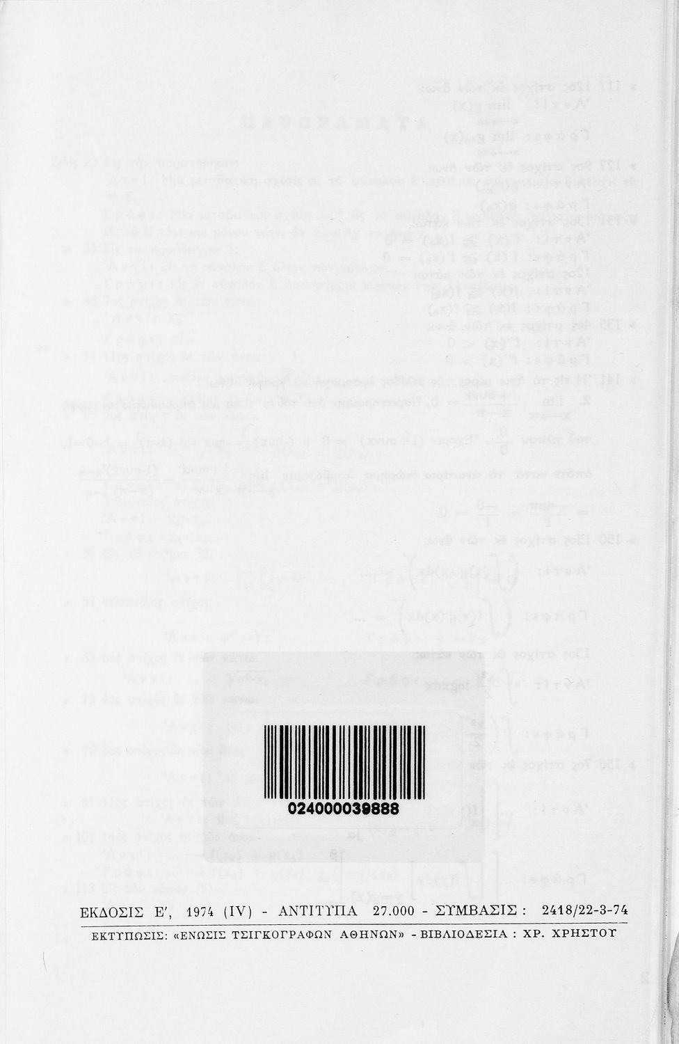 Σχολικό εγχειρίδιο Μαθηματικών Γ΄ Λυκείου που είναι χωρισμένο σε θεωρήματα, παραδείγματα και ασκήσεις και περιλαμβάνει στοιχεία Ανώτερης Άλγεβρας και Μαθηματικής Ανάλυσης.