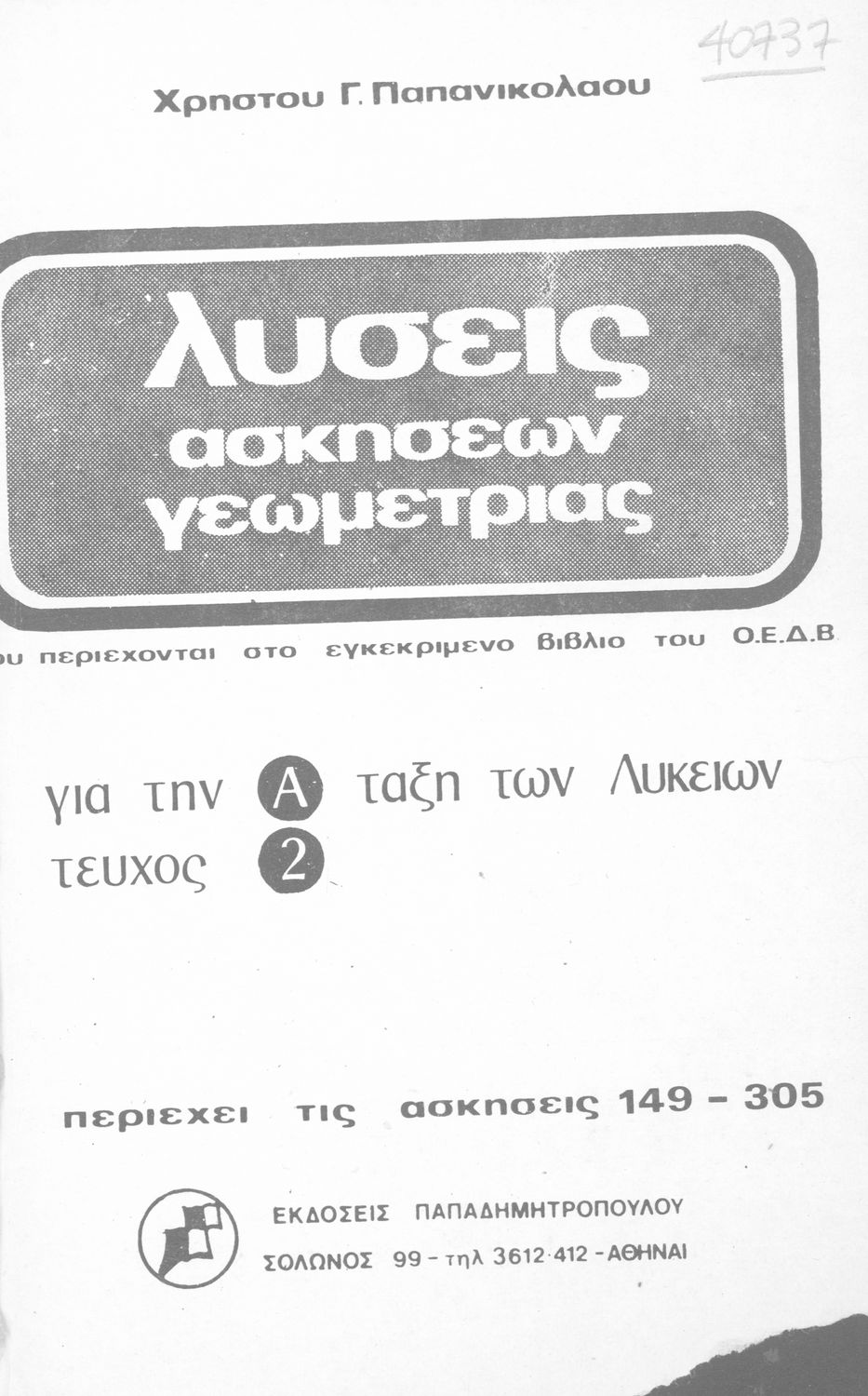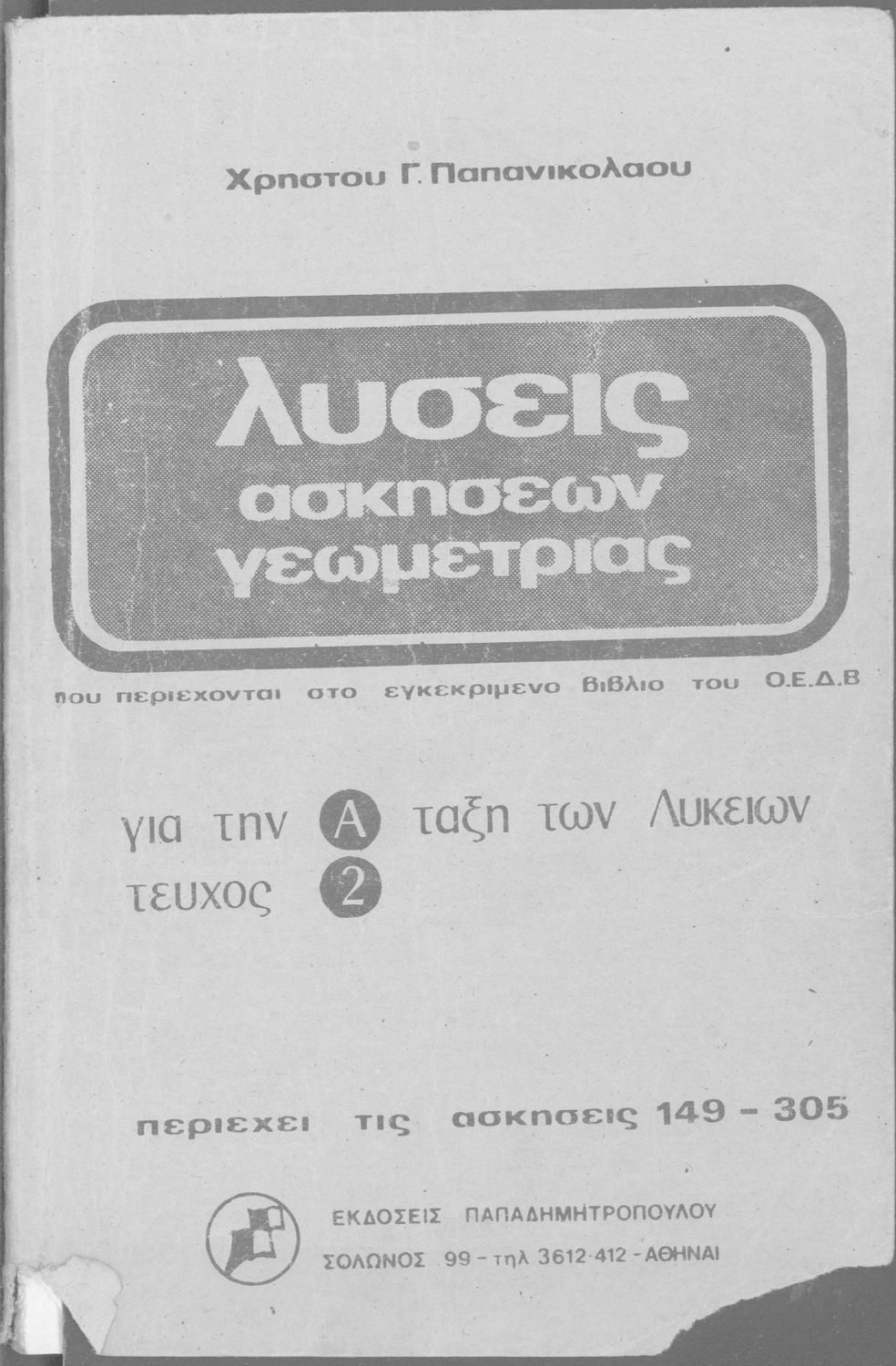 Μαθητικό βοήθημα Γεωμετρίας Α΄ Λυκείου που περιέχει τις λύσεις των ασκήσεων 149-305 του βιβλίου Ευκλείδειος Γεωμετρία για τις τάξεις Α΄, Β΄ και Γ΄ Λυκείου του Ο.Ε.Δ.Β που είχε συγγράψει ο Χρήστος Γ. Παπανικολάου.