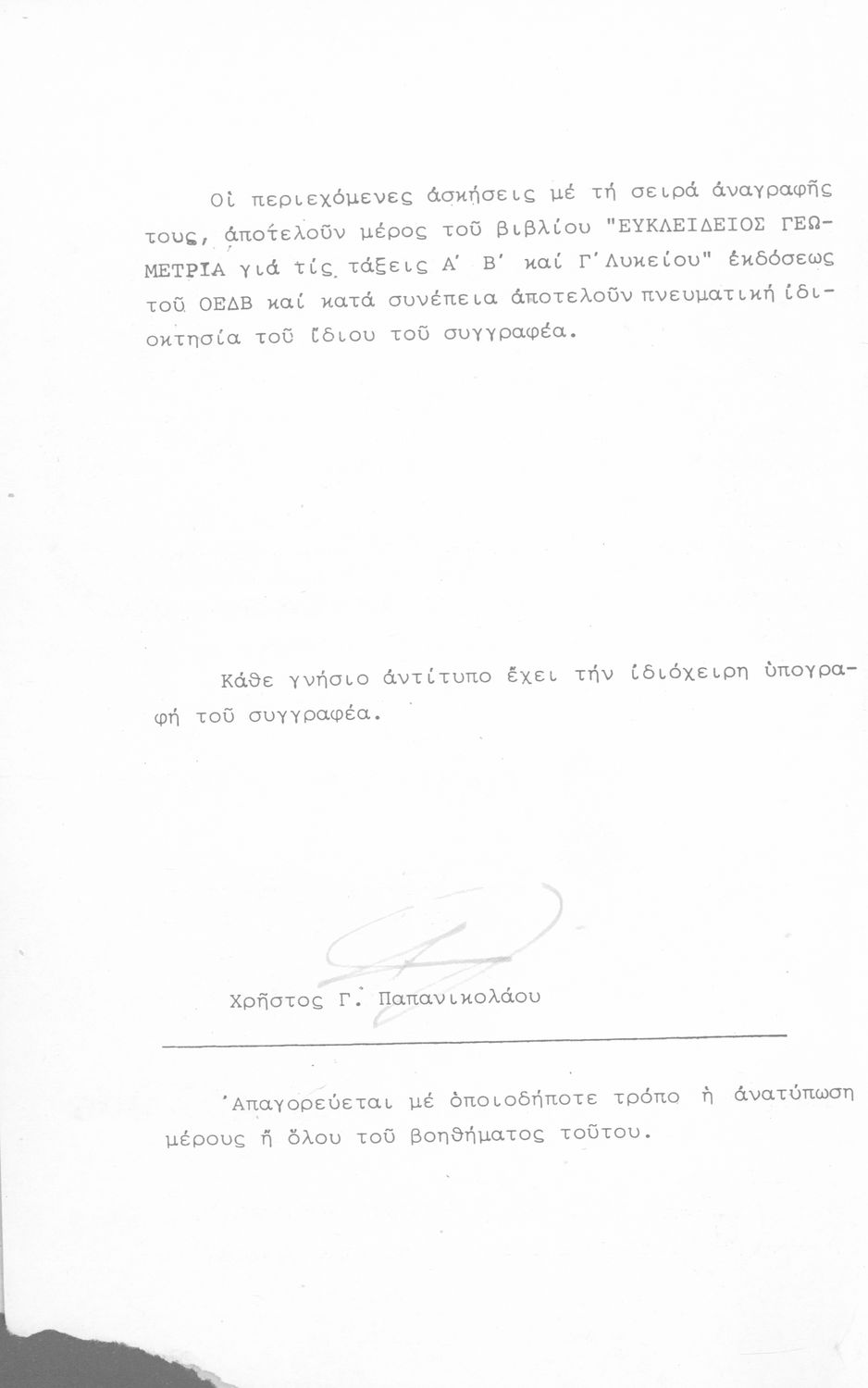 Παρουσίαση περιεχομένου: Μαθητικό βοήθημα Γεωμετρίας Α΄ Λυκείου που περιέχει τις λύσεις των ασκήσεων 149-305 του βιβλίου Ευκλείδειος Γεωμετρία για τις τάξεις Α΄, Β΄ και Γ΄ Λυκείου του Ο.Ε.Δ.Β που είχε συγγράψει ο Χρήστος Γ. Παπανικολάου.
