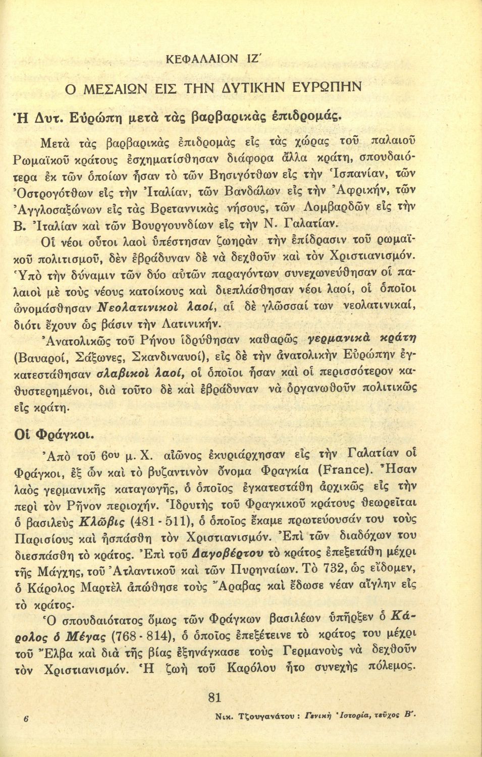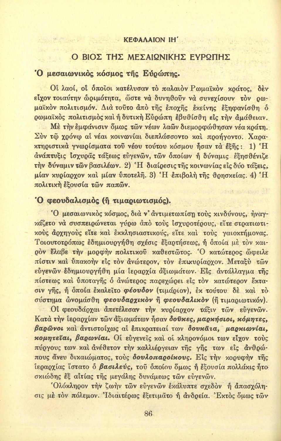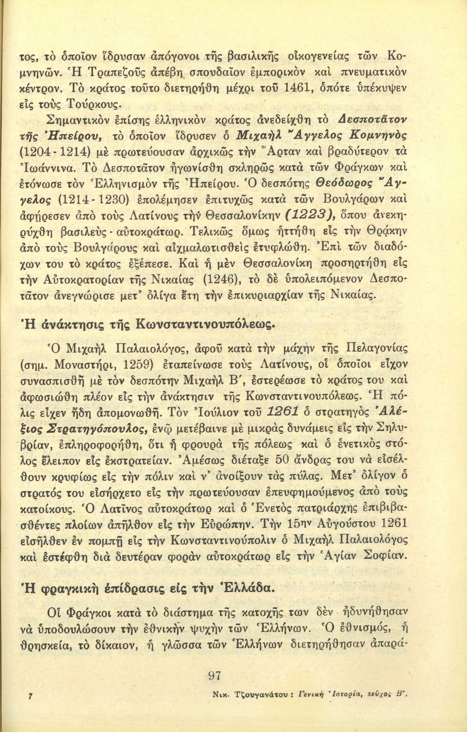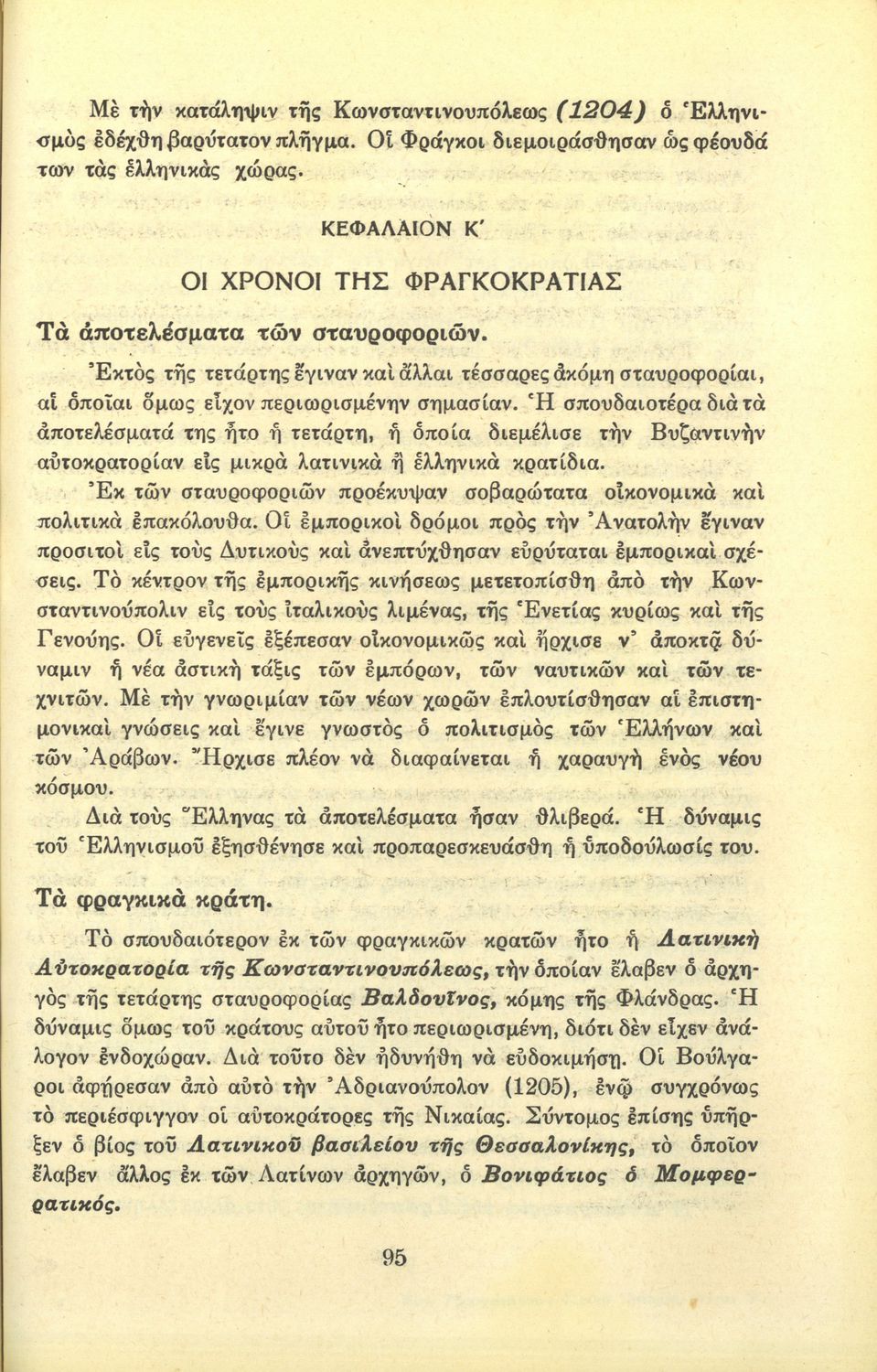 Σχολικό εγχειρίδιο Ιστορίας Β' Ελληνικού Σχολείου που καλύπτει την χρονική περίοδο από τα ελληνιστικά χρόνια, μέχρι την άλωση της Κωνσταντινούπολης από τους Φράγκους. Ο συγγραφέας ήταν Καθηγητής Πανεπιστημίου.