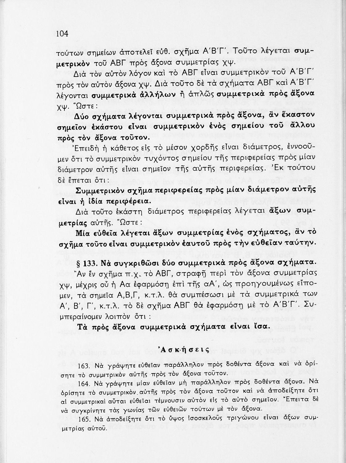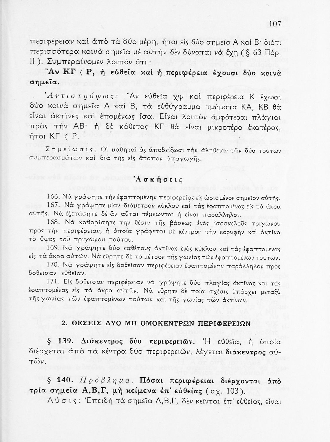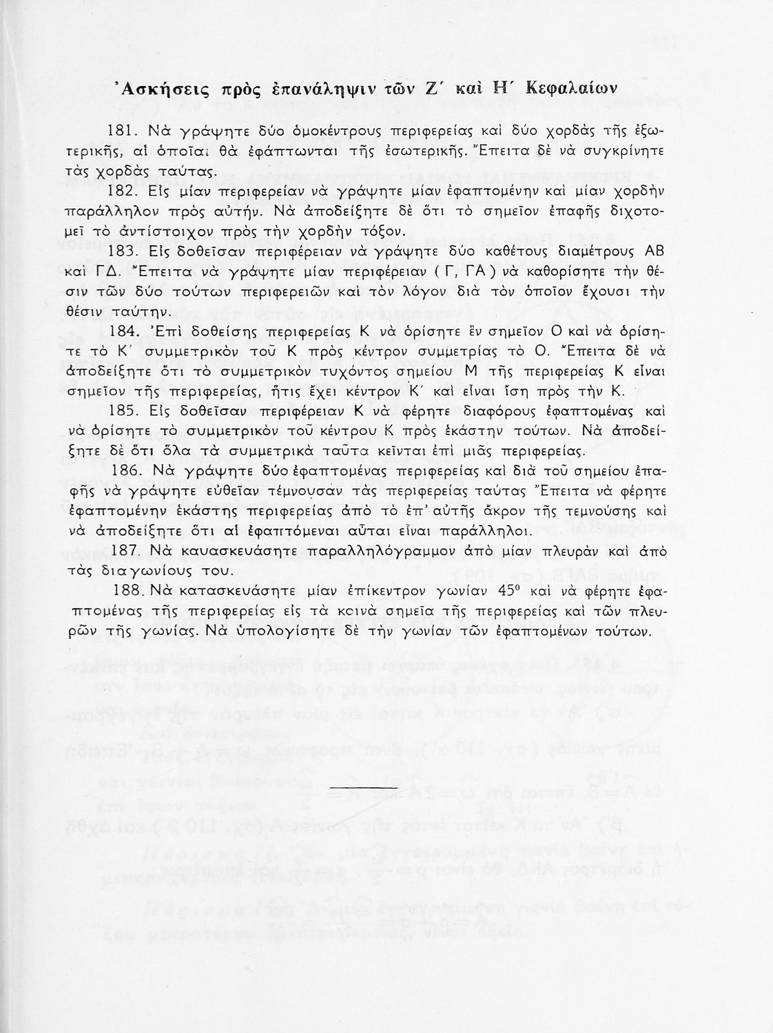 Σχολικό εγχειρίδιο Γεωμετρίας για τις Γ΄, Δ΄, Ε΄, ΣΤ΄ Γυμνασίου που περιλαμβάνει θεωρία και ασκήσεις και είναι χωρισμένο σε Επιπεδομετρία και Στερεομετρία. Φέρει το σύμβολο της δικτατορίας.