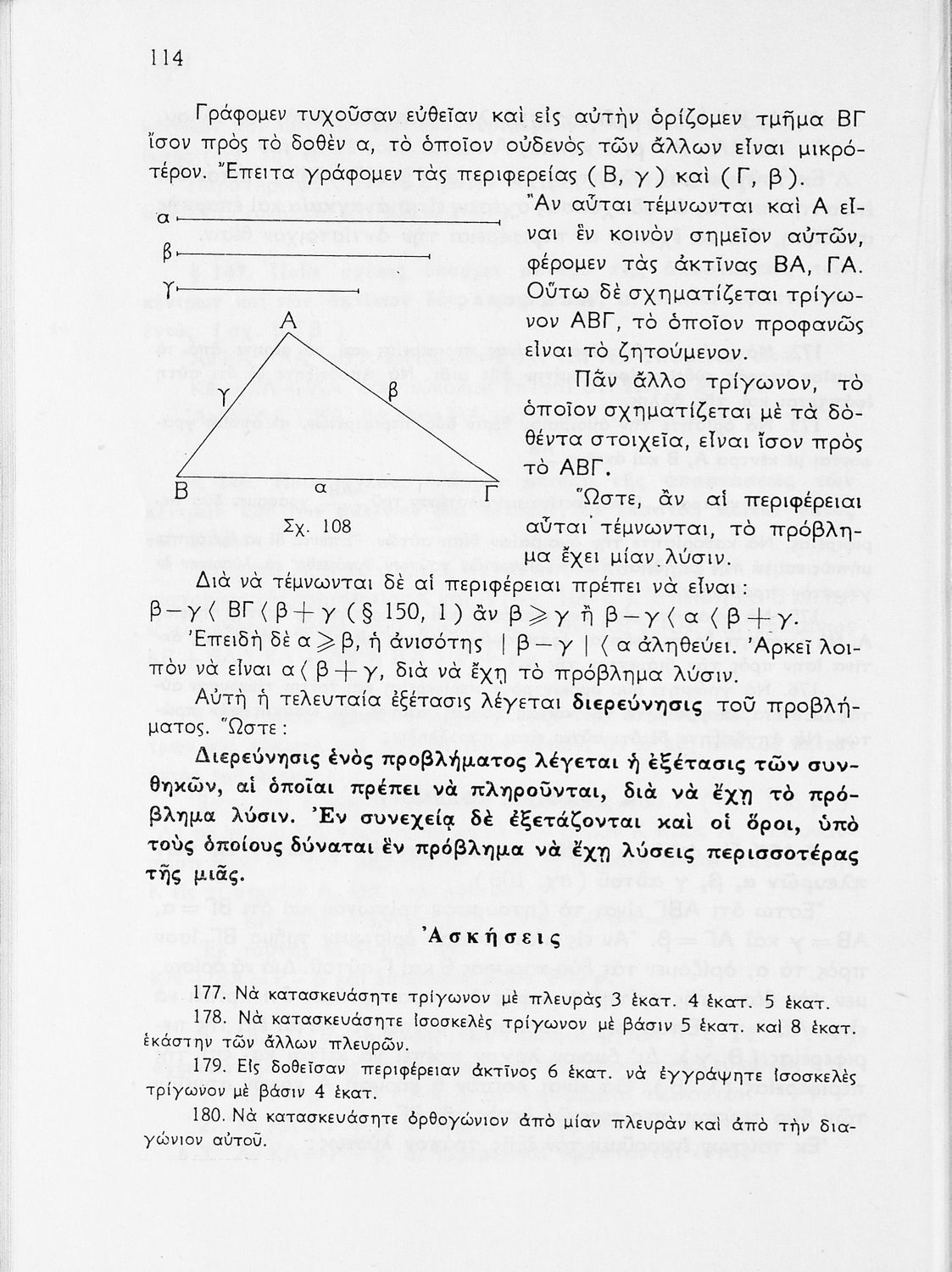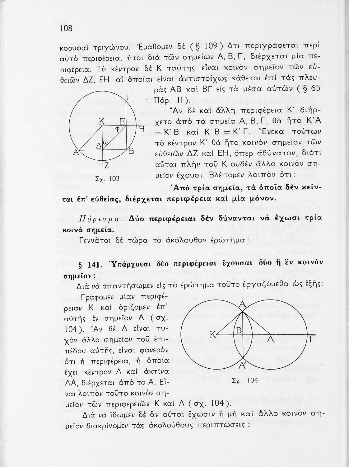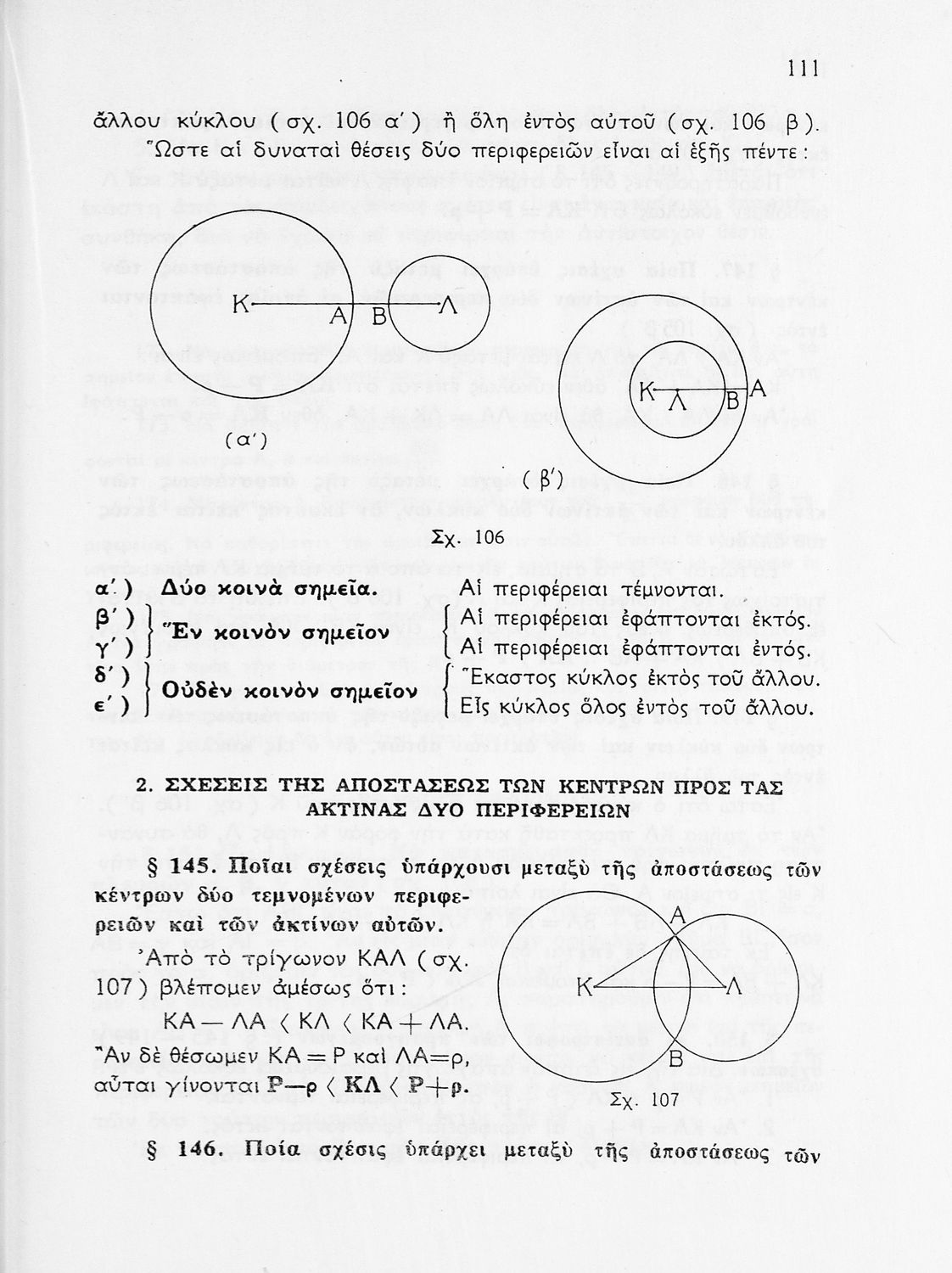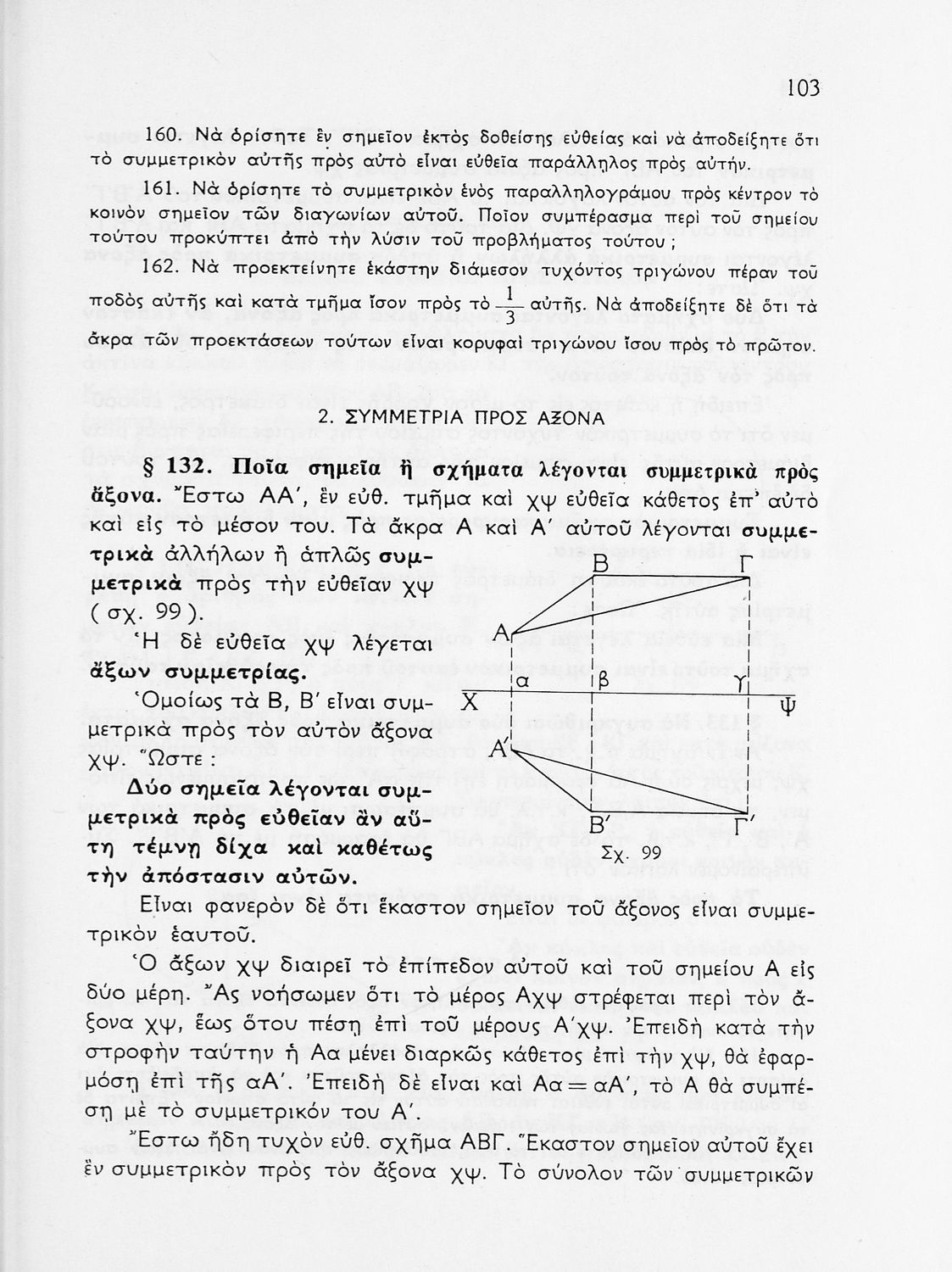 Σχολικό εγχειρίδιο Γεωμετρίας για τις Γ΄, Δ΄, Ε΄, ΣΤ΄ Γυμνασίου που περιλαμβάνει θεωρία και ασκήσεις και είναι χωρισμένο σε Επιπεδομετρία και Στερεομετρία. Φέρει το σύμβολο της δικτατορίας.