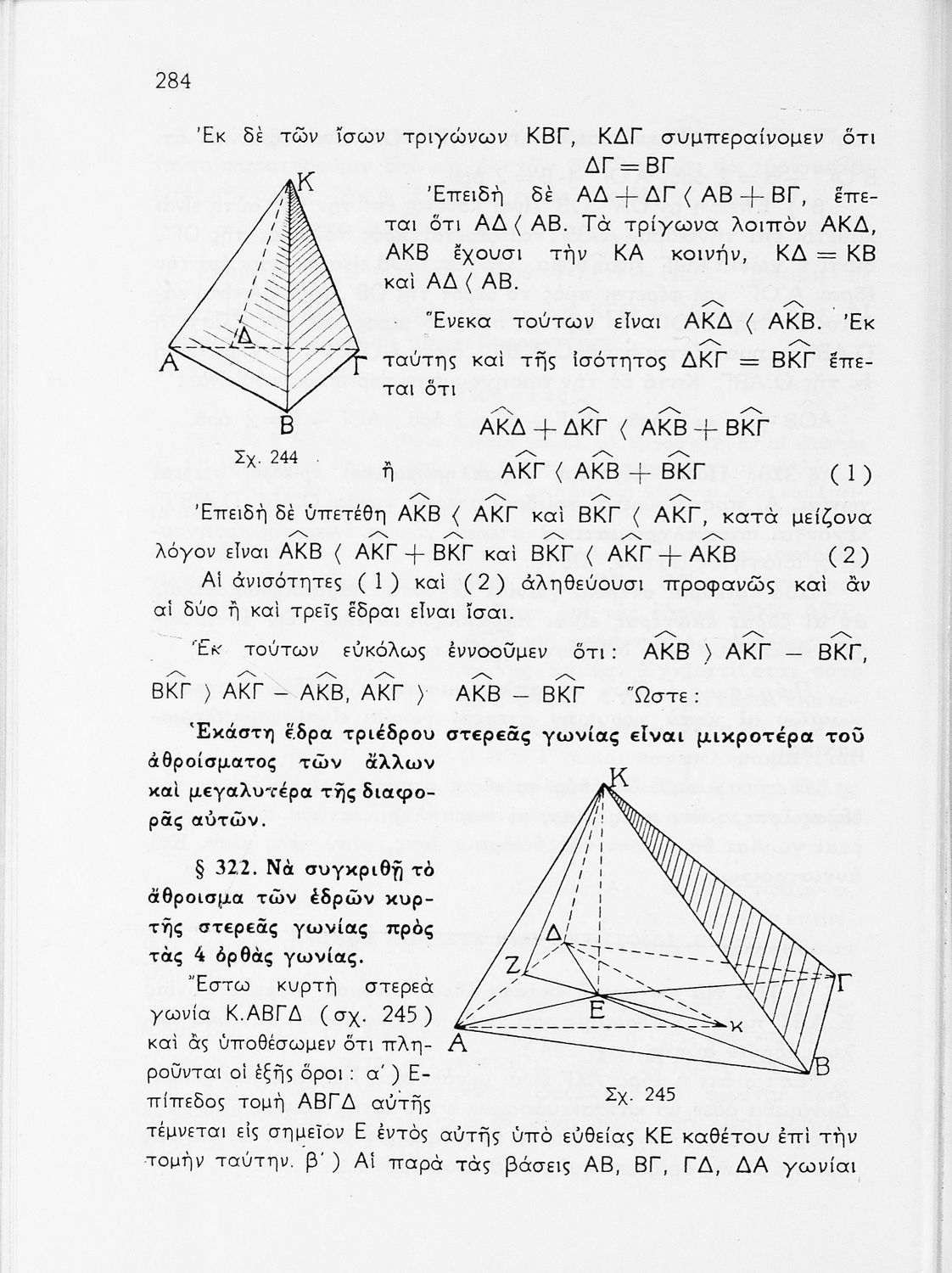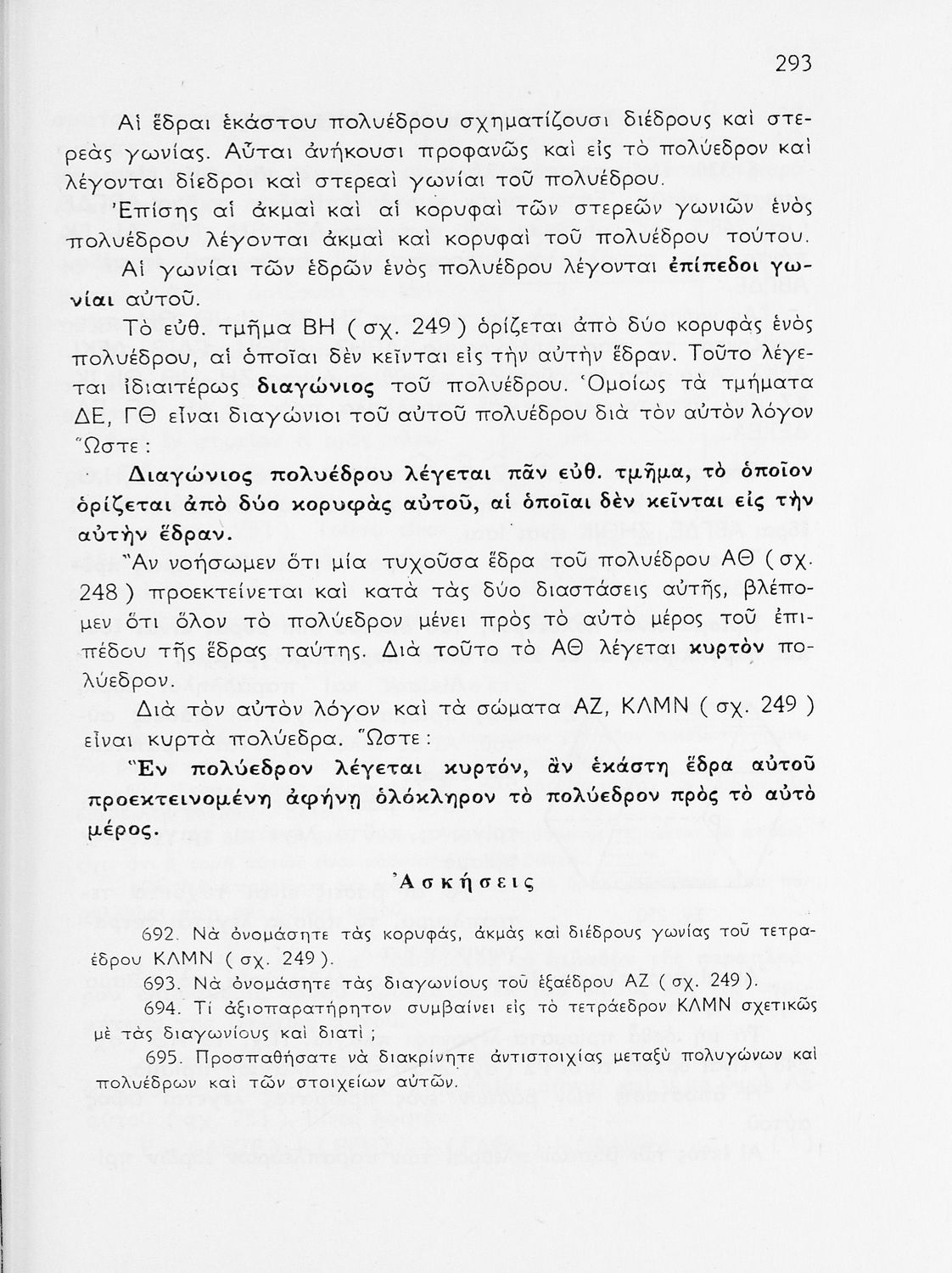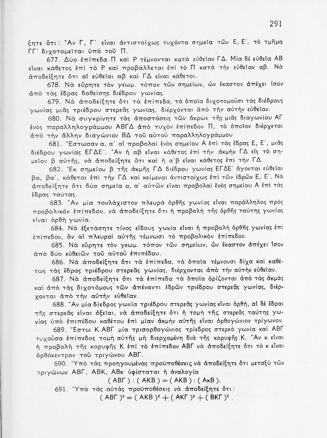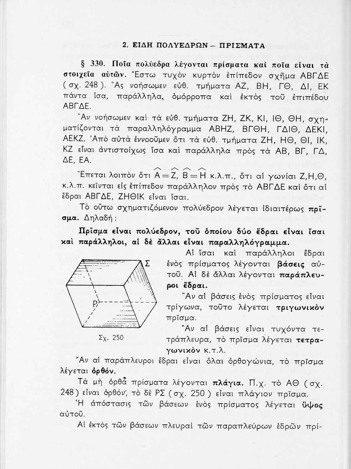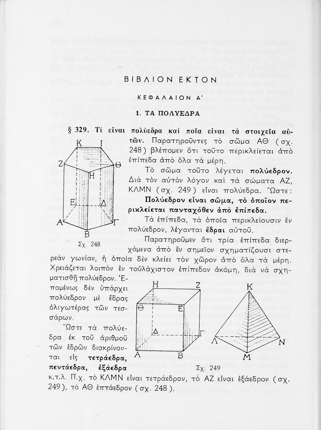 Σχολικό εγχειρίδιο Γεωμετρίας για τις Γ΄, Δ΄, Ε΄, ΣΤ΄ Γυμνασίου που περιλαμβάνει θεωρία και ασκήσεις και είναι χωρισμένο σε Επιπεδομετρία και Στερεομετρία. Φέρει το σύμβολο της δικτατορίας.