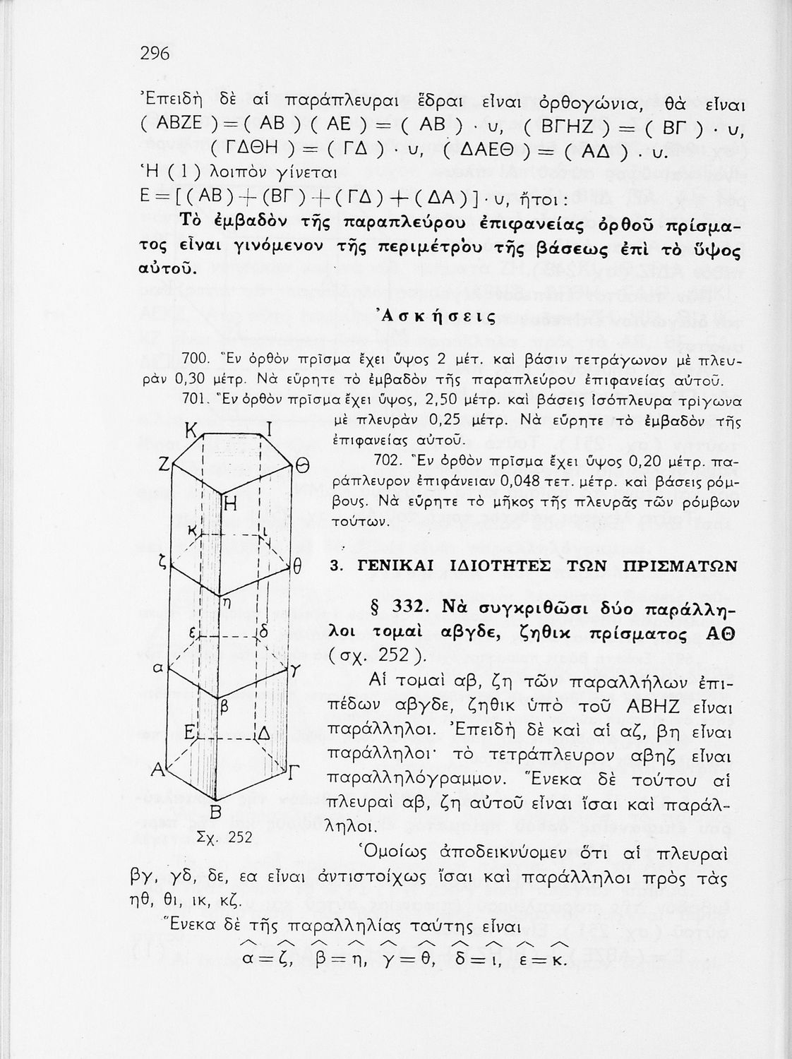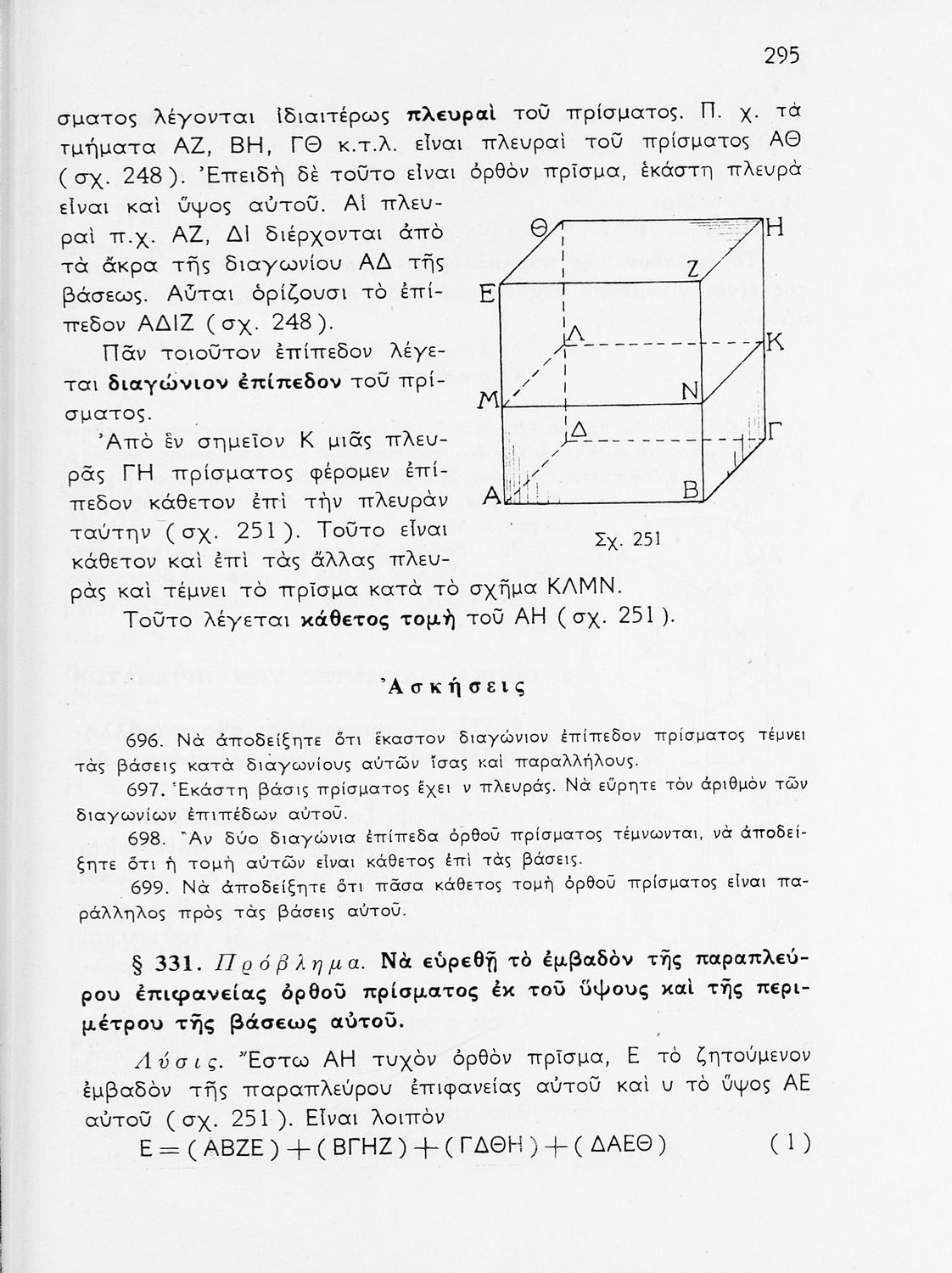 Σχολικό εγχειρίδιο Γεωμετρίας για τις Γ΄, Δ΄, Ε΄, ΣΤ΄ Γυμνασίου που περιλαμβάνει θεωρία και ασκήσεις και είναι χωρισμένο σε Επιπεδομετρία και Στερεομετρία.