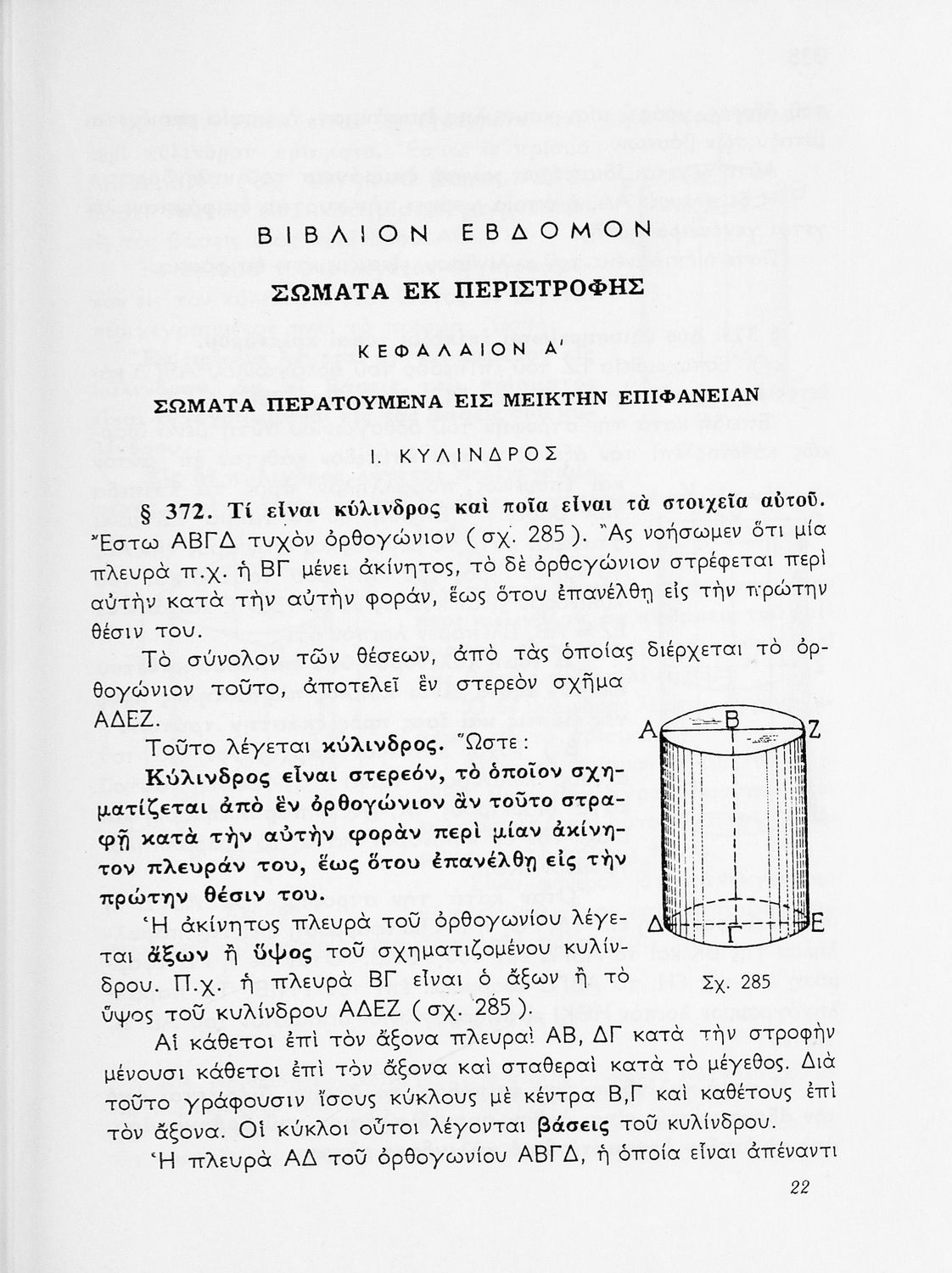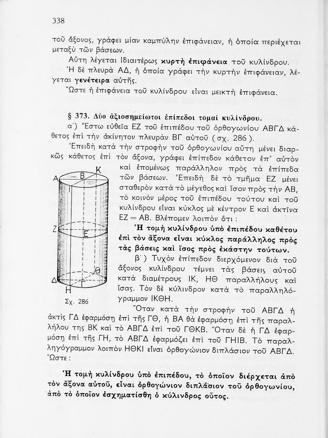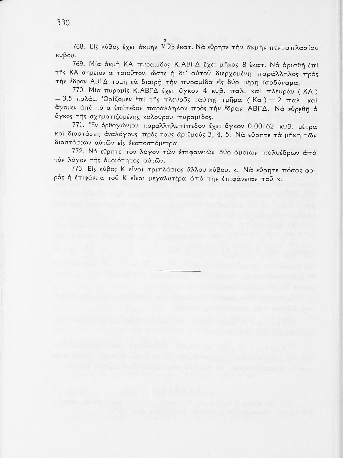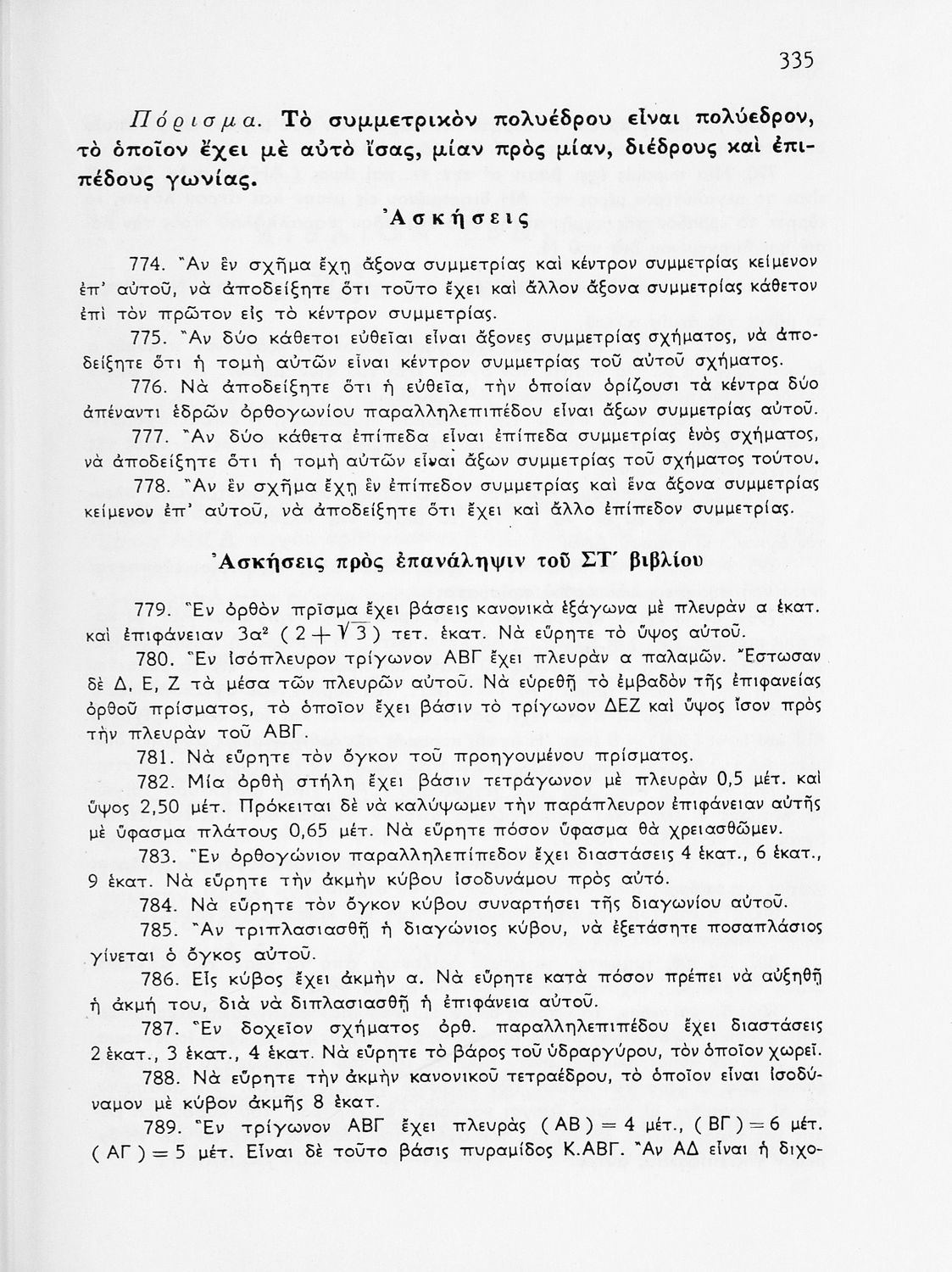 Σχολικό εγχειρίδιο Γεωμετρίας για τις Γ΄, Δ΄, Ε΄, ΣΤ΄ Γυμνασίου που περιλαμβάνει θεωρία και ασκήσεις και είναι χωρισμένο σε Επιπεδομετρία και Στερεομετρία. Φέρει το σύμβολο της δικτατορίας.