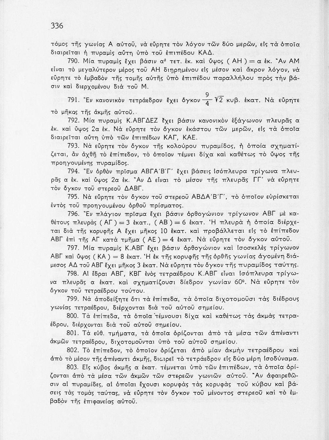 Σχολικό εγχειρίδιο Γεωμετρίας για τις Γ΄, Δ΄, Ε΄, ΣΤ΄ Γυμνασίου που περιλαμβάνει θεωρία και ασκήσεις και είναι χωρισμένο σε Επιπεδομετρία και Στερεομετρία.