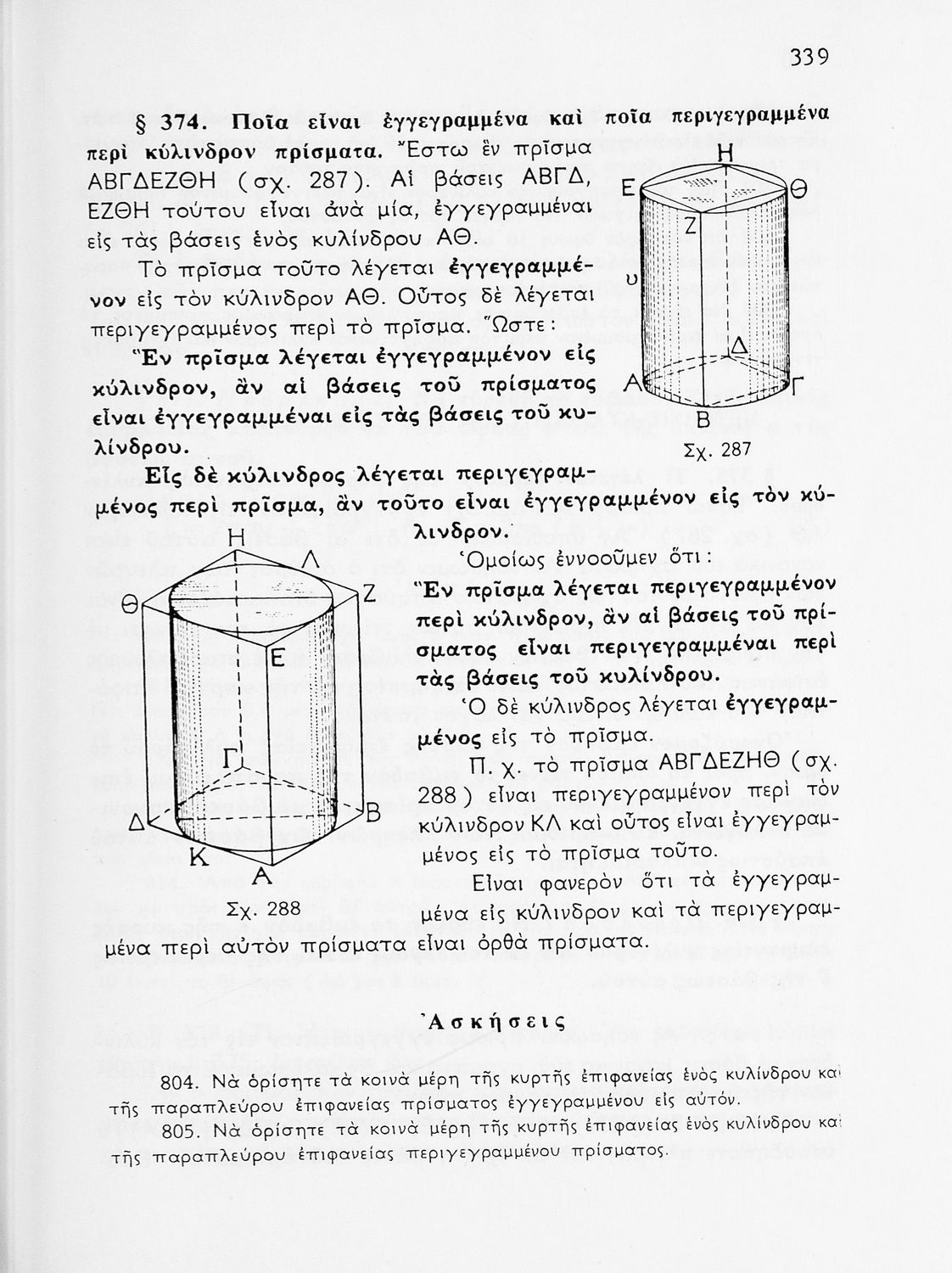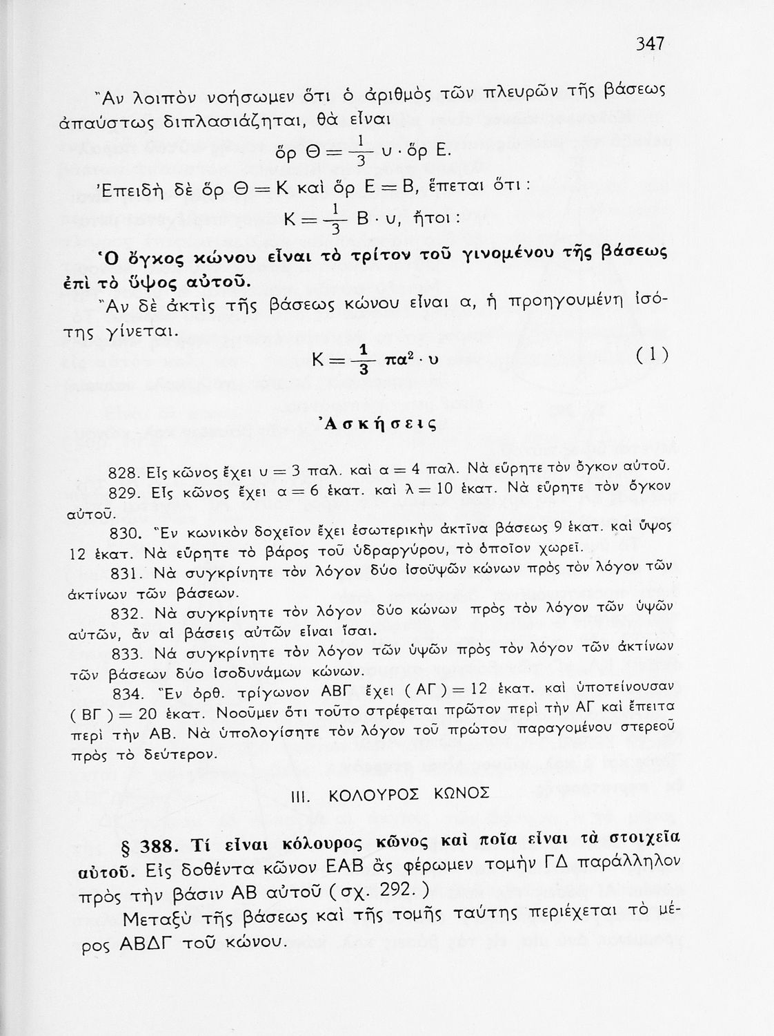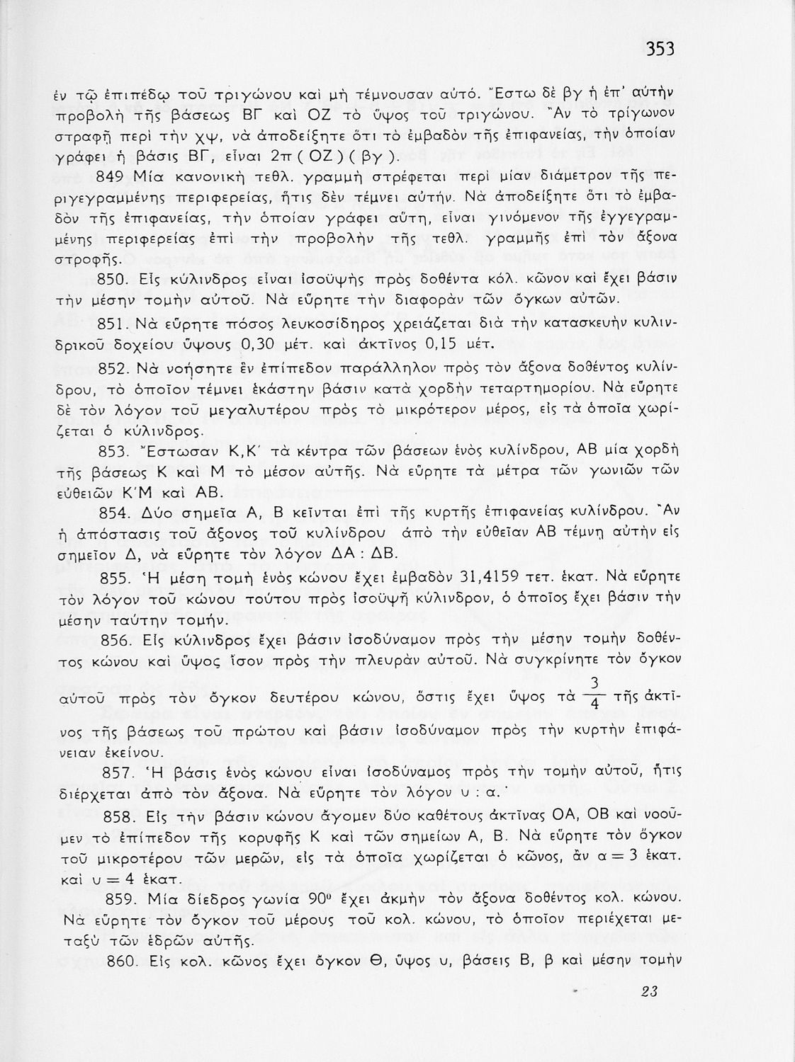Σχολικό εγχειρίδιο Γεωμετρίας για τις Γ΄, Δ΄, Ε΄, ΣΤ΄ Γυμνασίου που περιλαμβάνει θεωρία και ασκήσεις και είναι χωρισμένο σε Επιπεδομετρία και Στερεομετρία. Φέρει το σύμβολο της δικτατορίας.