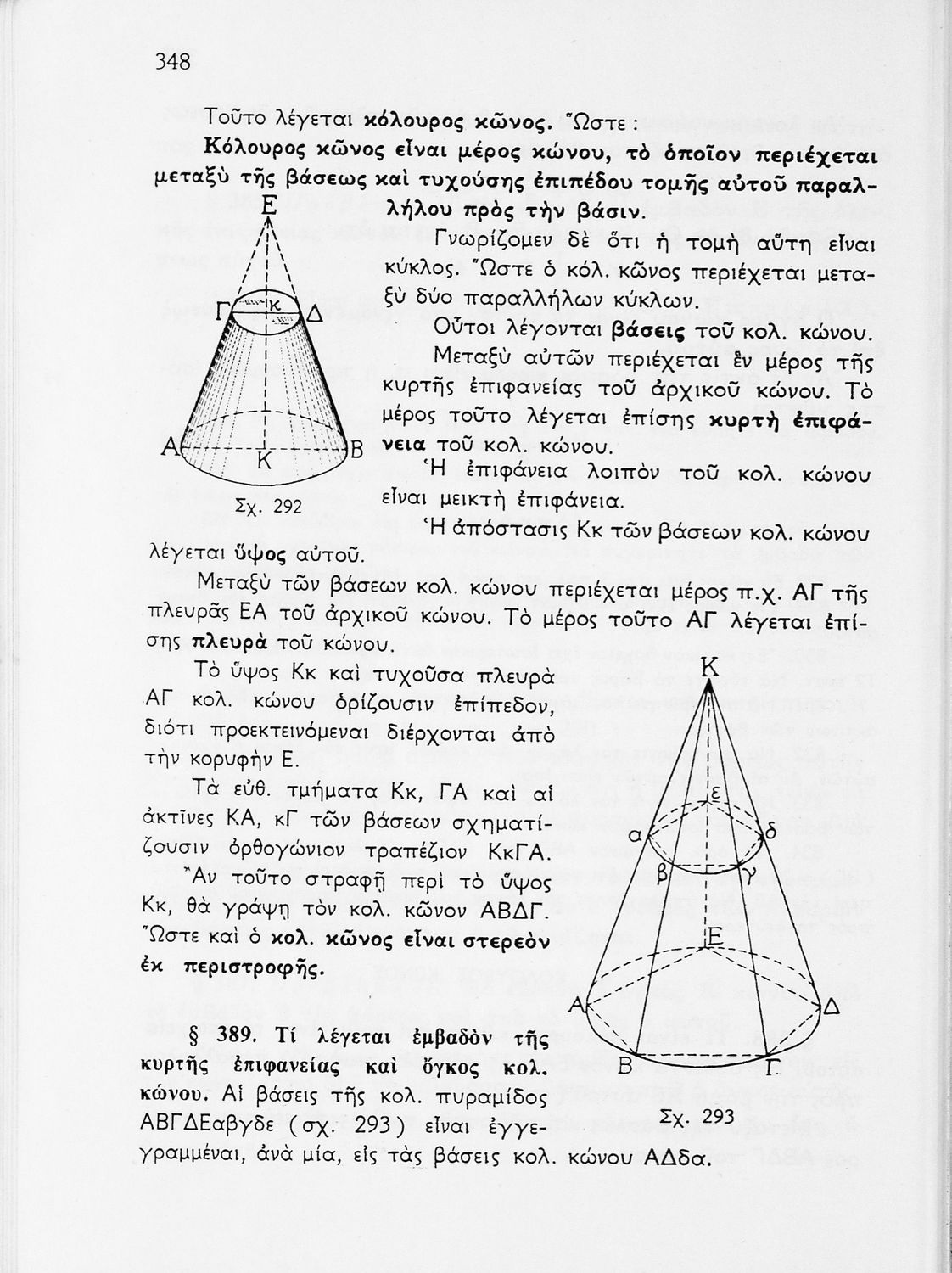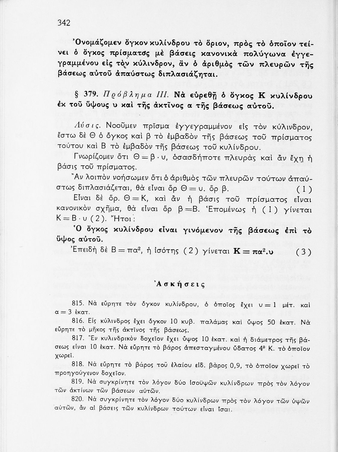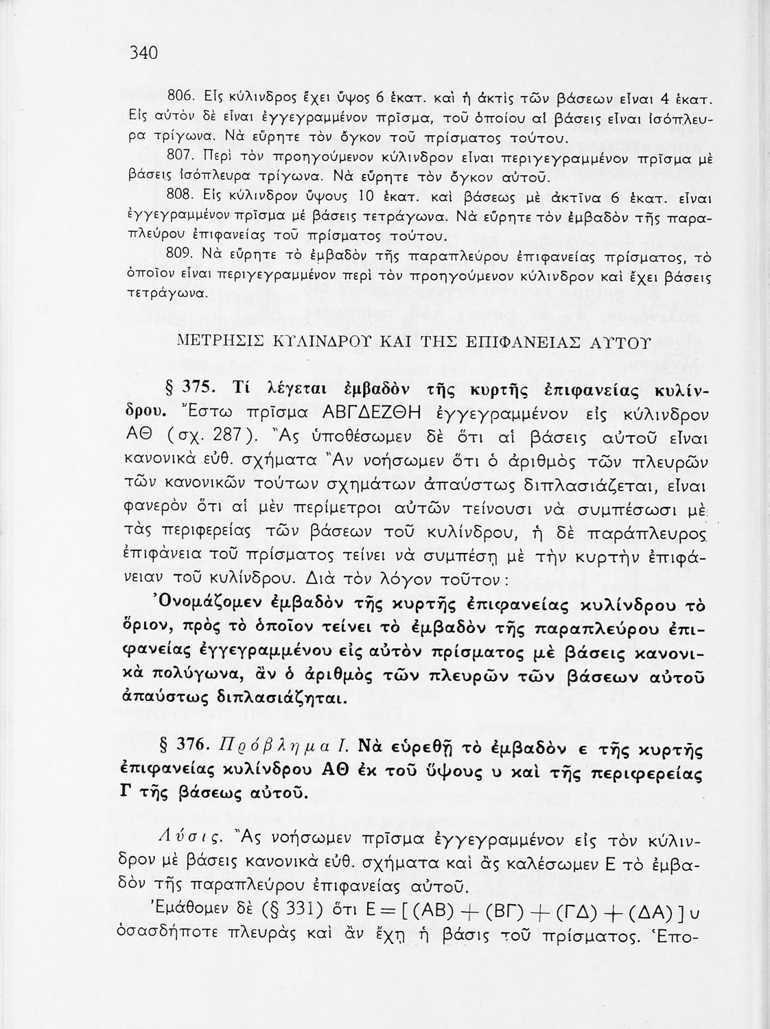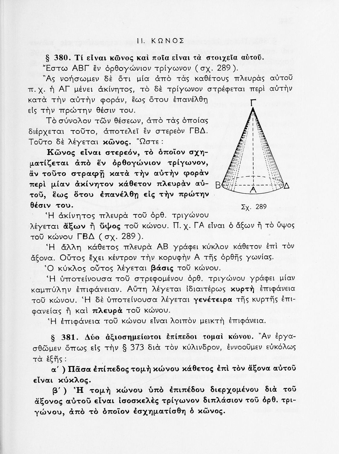 Σχολικό εγχειρίδιο Γεωμετρίας για τις Γ΄, Δ΄, Ε΄, ΣΤ΄ Γυμνασίου που περιλαμβάνει θεωρία και ασκήσεις και είναι χωρισμένο σε Επιπεδομετρία και Στερεομετρία. Φέρει το σύμβολο της δικτατορίας.