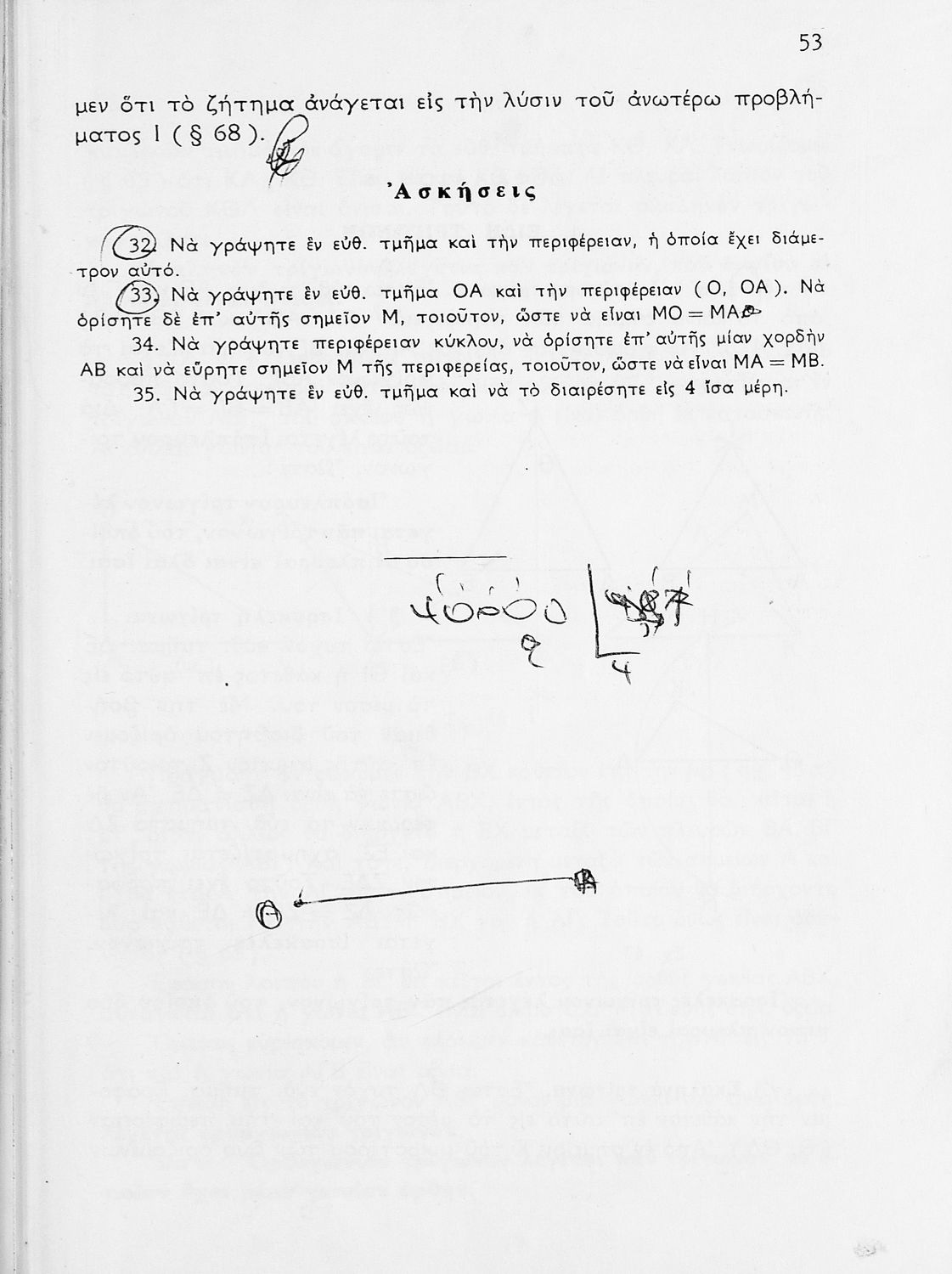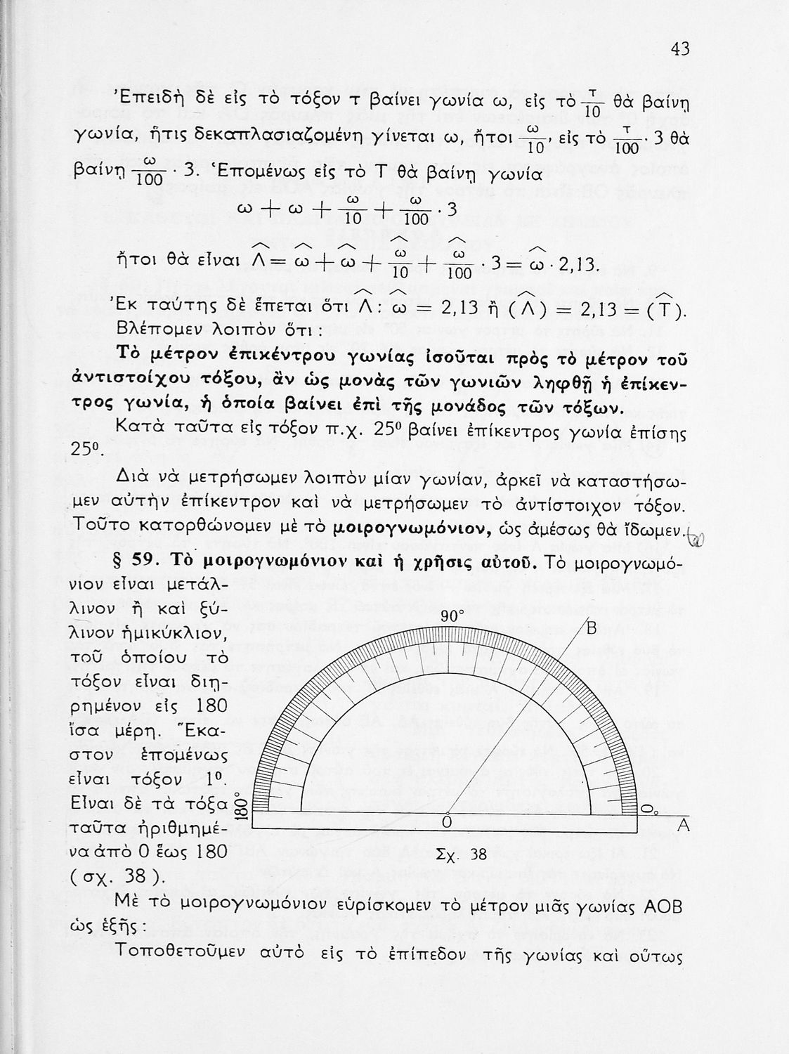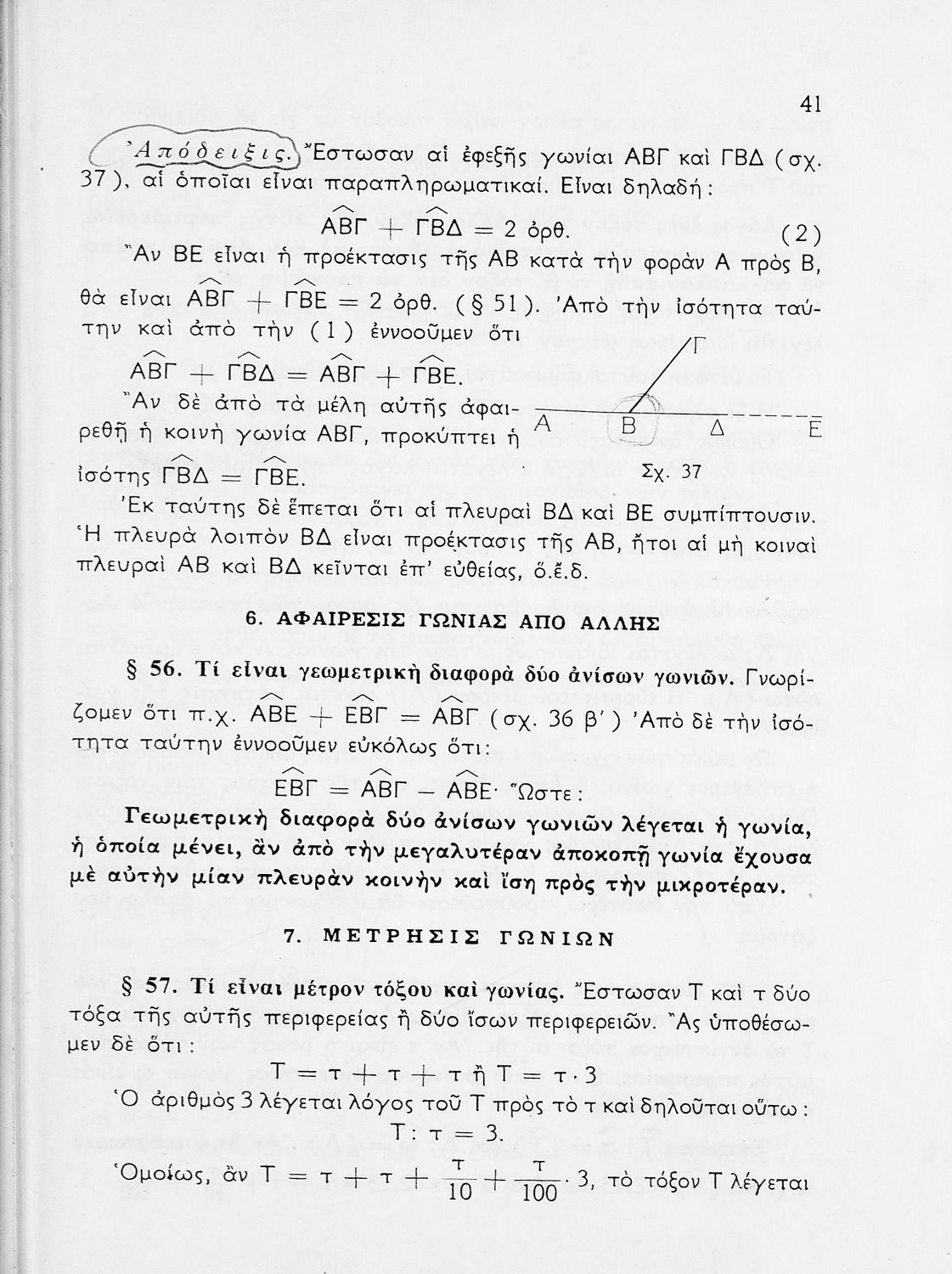 Παρουσίαση περιεχομένου: Σχολικό εγχειρίδιο Γεωμετρίας που περιλαμβάνει θεωρία και ασκήσεις και είναι χωρισμένο σε Επιπεδομετρία και Στερεομετρία. Φέρει το σύμβολο της δικτατορίας.
