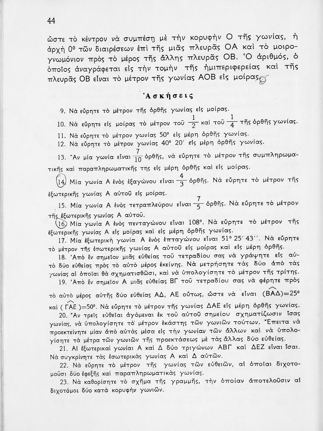 Σχολικό εγχειρίδιο Γεωμετρίας για τις Γ΄, Δ΄, Ε΄, ΣΤ΄ Γυμνασίου που περιλαμβάνει θεωρία και ασκήσεις και είναι χωρισμένο σε Επιπεδομετρία και Στερεομετρία.
