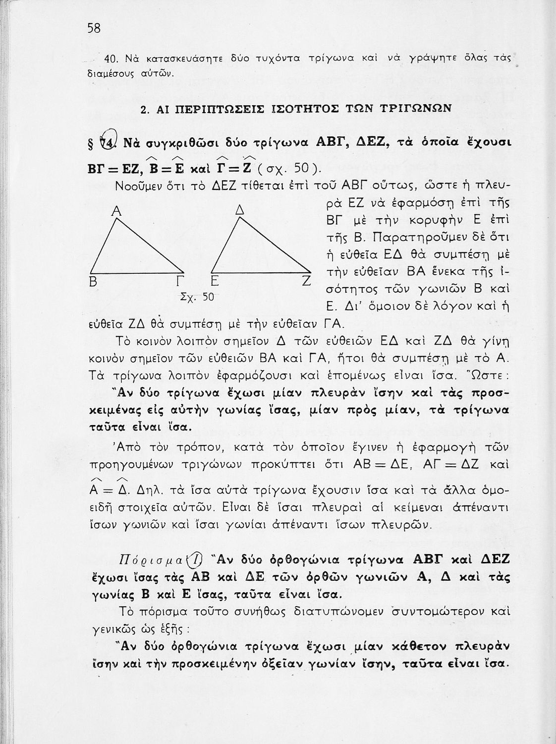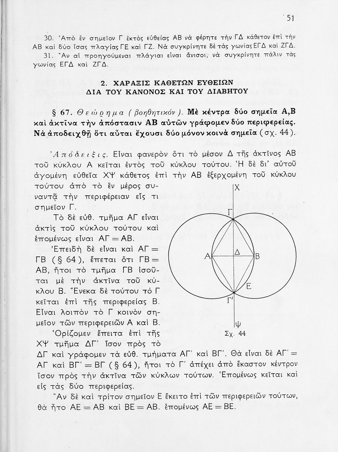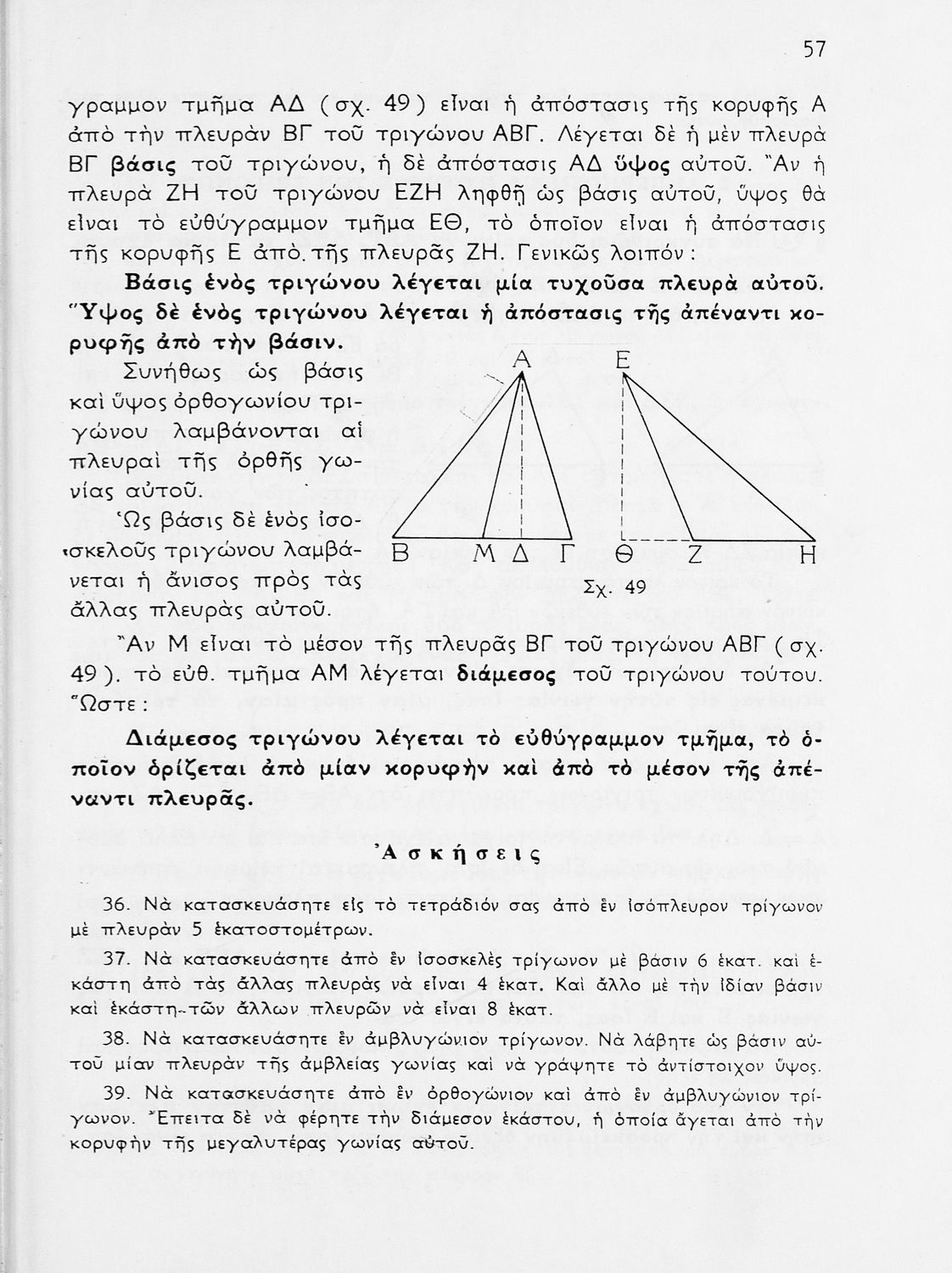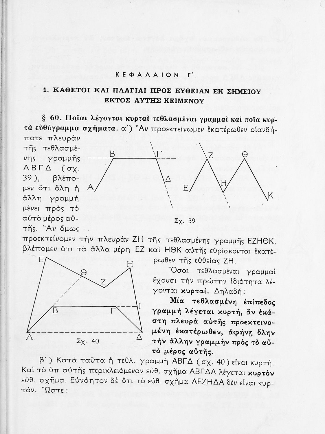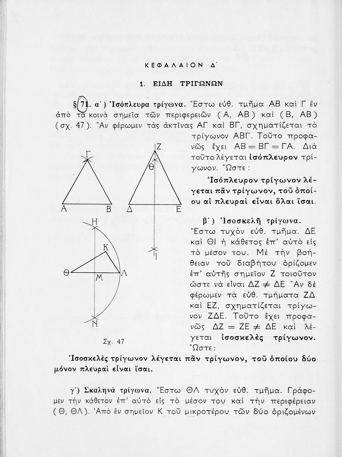 Σχολικό εγχειρίδιο Γεωμετρίας για τις Γ΄, Δ΄, Ε΄, ΣΤ΄ Γυμνασίου που περιλαμβάνει θεωρία και ασκήσεις και είναι χωρισμένο σε Επιπεδομετρία και Στερεομετρία. Φέρει το σύμβολο της δικτατορίας.