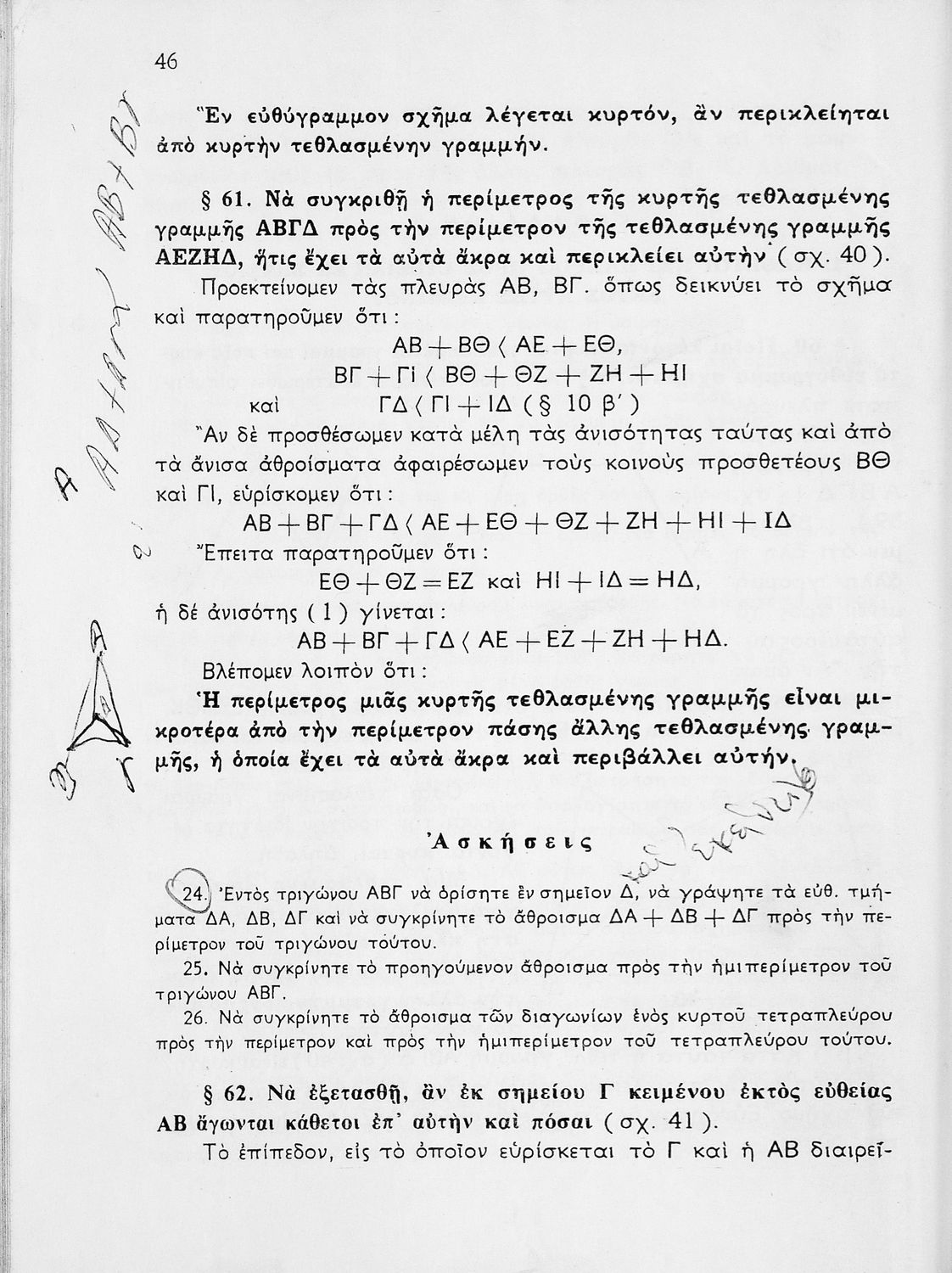Σχολικό εγχειρίδιο Γεωμετρίας Γυμνασίου που είναι χωρισμένο σε θεωρήματα και ασκήσεις και εστιάζει στα βασικά θεωρήματα και ιδιότητες των γεωμετρικών σχημάτων. .