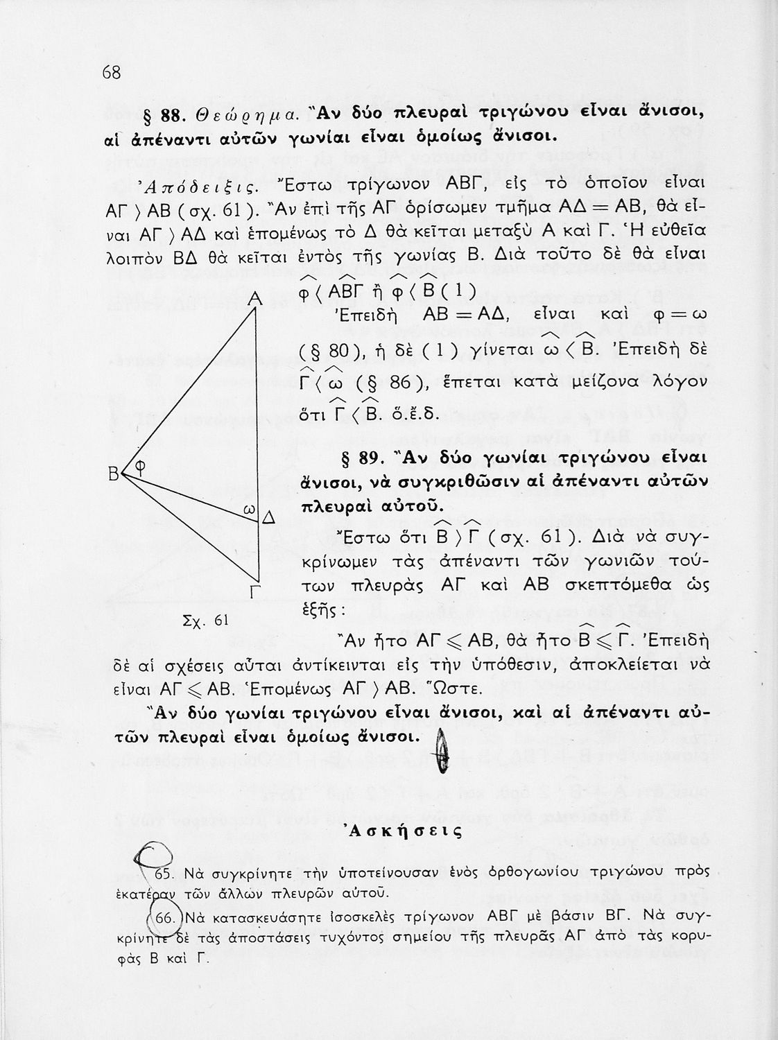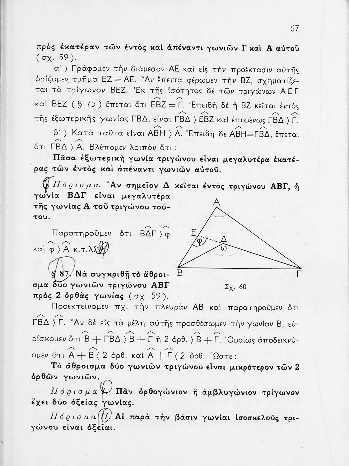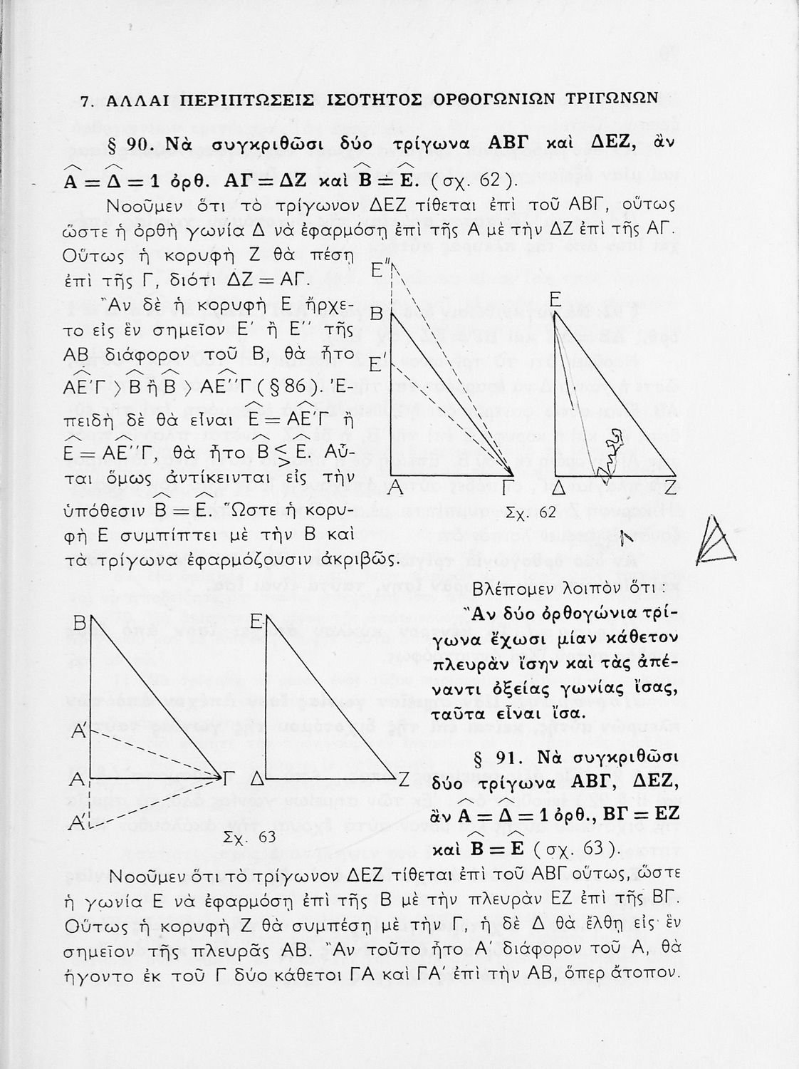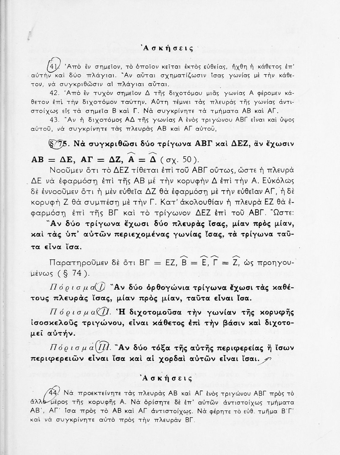 Σχολικό εγχειρίδιο Γεωμετρίας Γυμνασίου που είναι χωρισμένο σε θεωρήματα και ασκήσεις και εστιάζει στα βασικά θεωρήματα και ιδιότητες των γεωμετρικών σχημάτων. .
