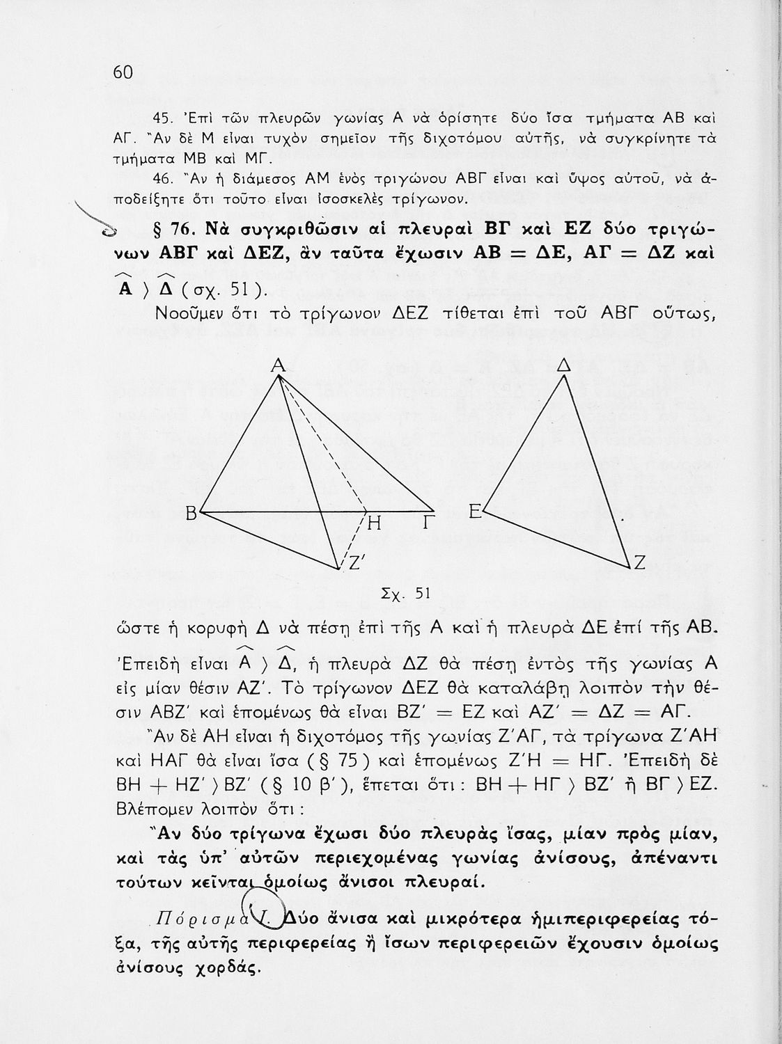 Σχολικό εγχειρίδιο Γεωμετρίας Α΄ Λυκείου χωρισμένο σε θεωρήματα, λυμένες ασκήσεις, ασκήσεις και επαναλήψεις κεφαλαίου. Περιέχει ένα παράρτημα με επαναληπτικά μαθήματα και ένα με ευρετήριο όρων.